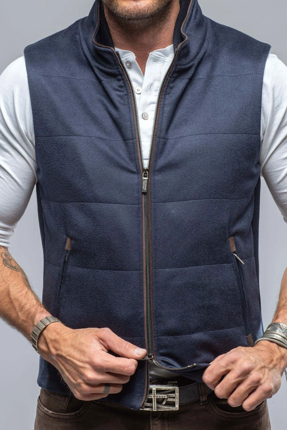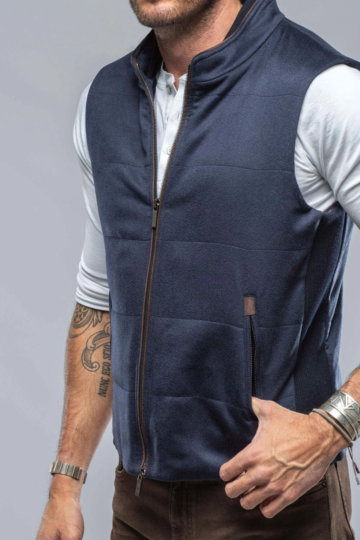 - Chocolate suede trim on zipper