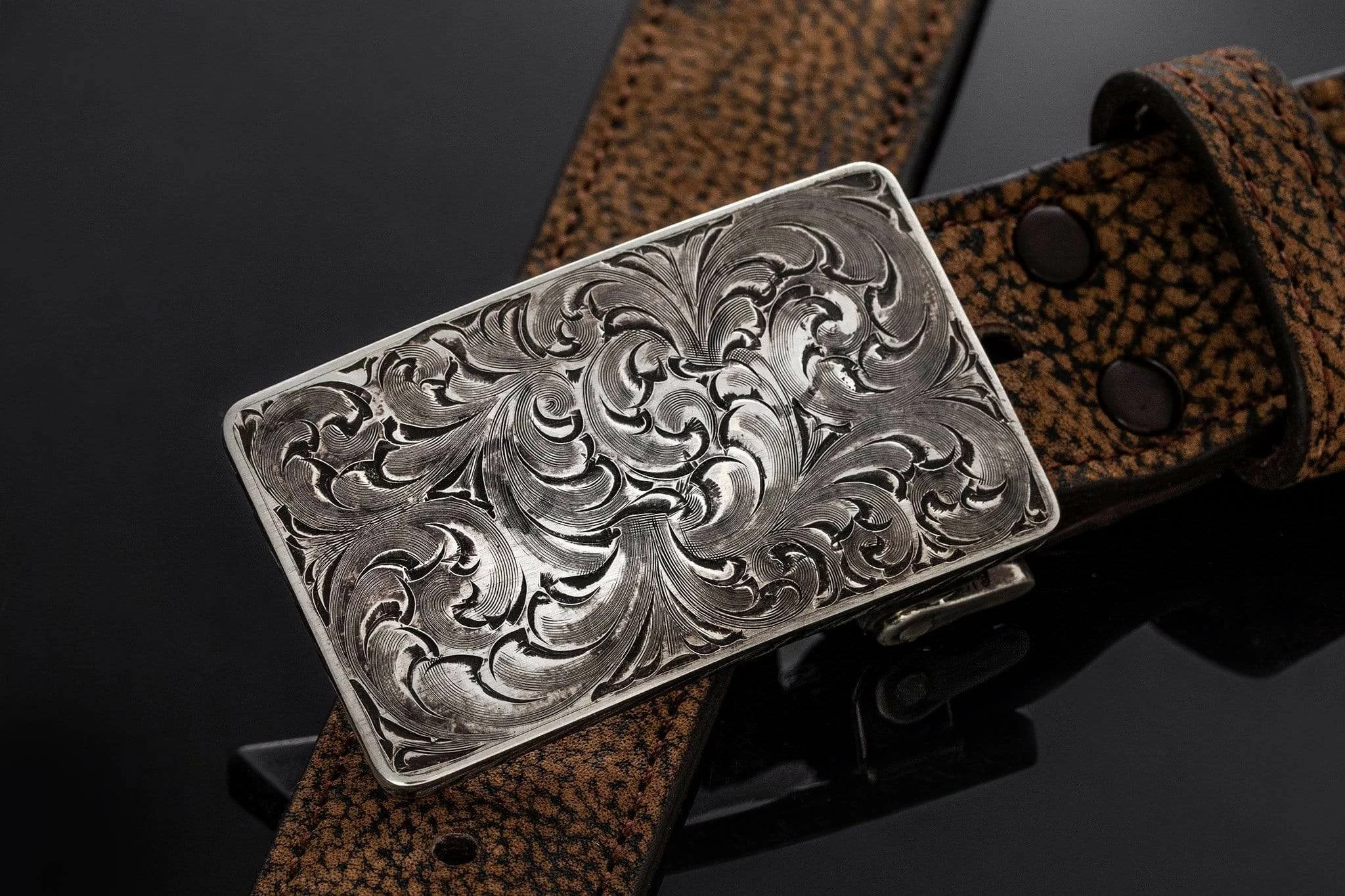 This understated buckle is perfect for those just starting their buckle collections, or for more formal occasions. It’s made from heavy-gauge, hand-engraved sterling silver, and its rectangular face is adorned with some beautiful, delicate scrollwork. Here we have placed it on a chocolate nubuck strap and paired it with blue jeans, but it could easily be worn with dressier slacks. Fits all 30mm belt straps.