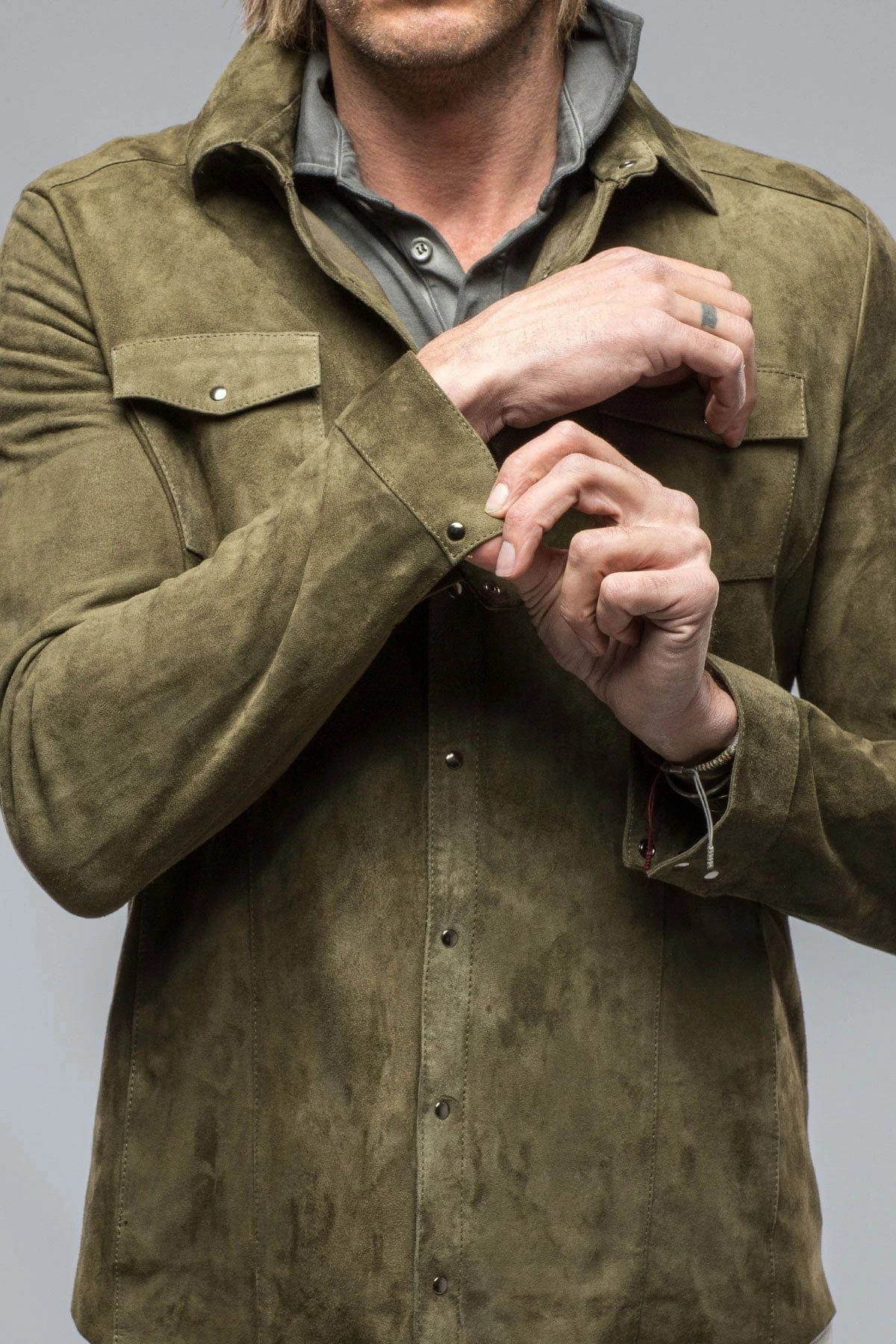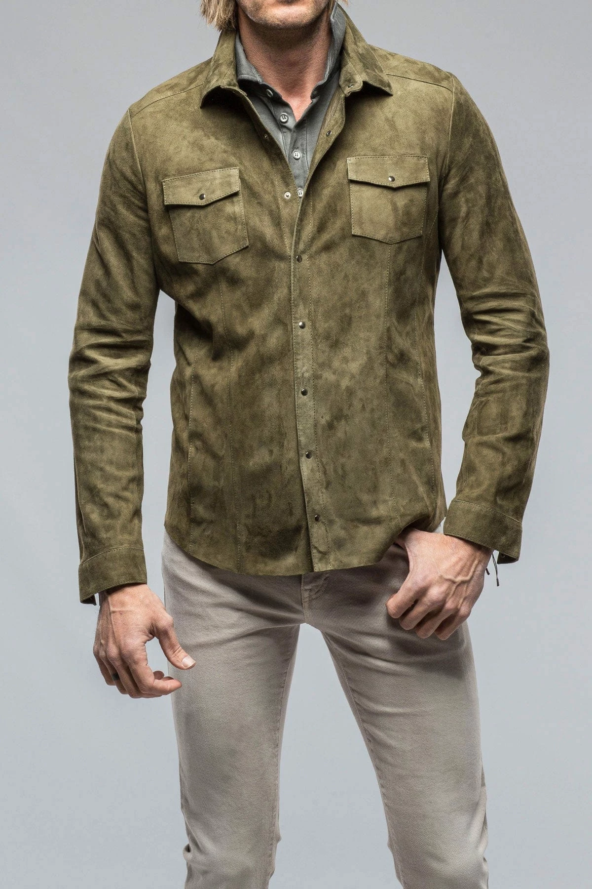 - Ultra-lightweight calf suede snap-button shirt