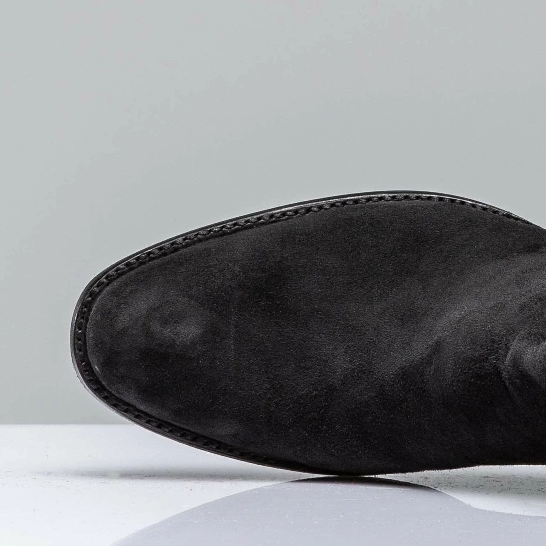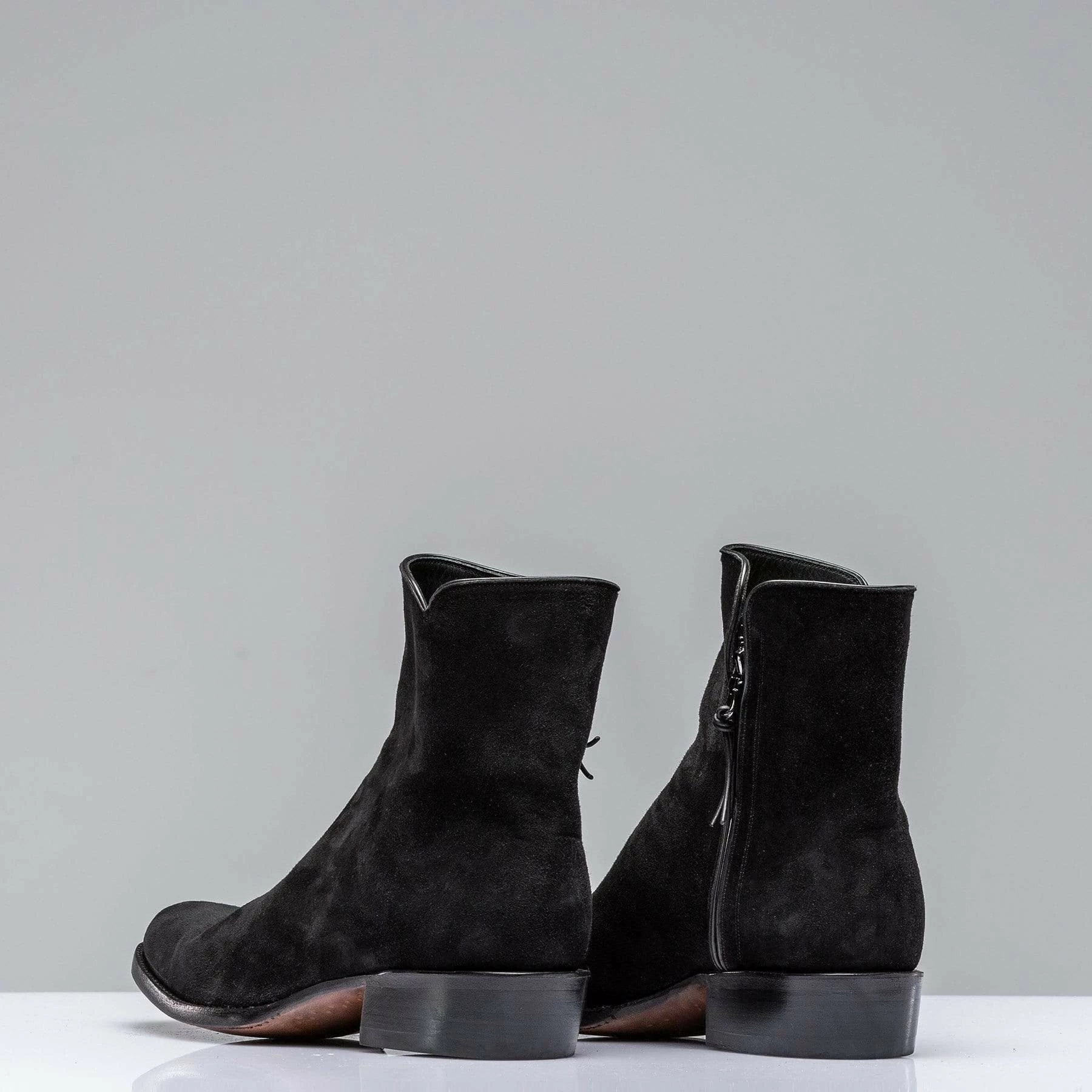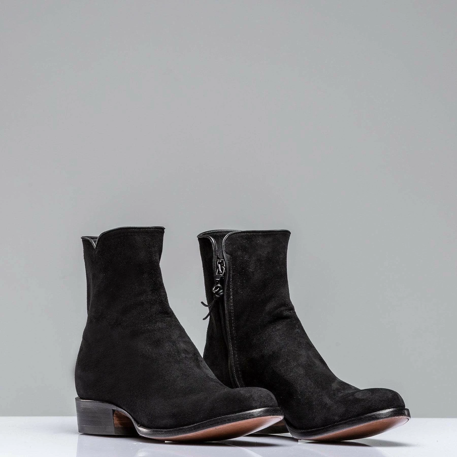 The round toe Zorro boot is a low-profile Roper-style that boasts unmatched quality in its simplicity. A sharp black suede nubuck skin creates a sleek finish, while the overall styling puts it squarely between a dress boot and a cowboy boot. Side-zipper makes for easy-on-off and all but guarantees a good fit. Also works with a wider range of jean cuts (an underrated convenience). Each pair is handmade by artisans from Stallion Boot Company of El Paso, Texas with 30 or more years of experience.