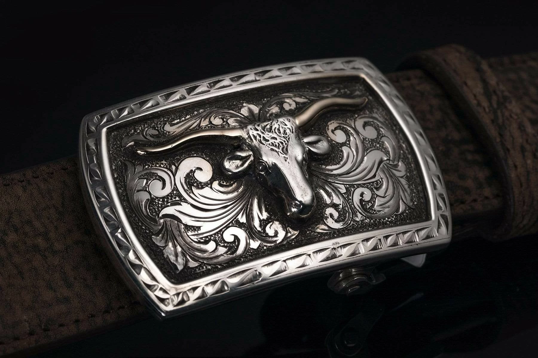 - Extra-heavy distressed Branson shape with hand-cast Longhorn, hand-engraved deep cut scenery.