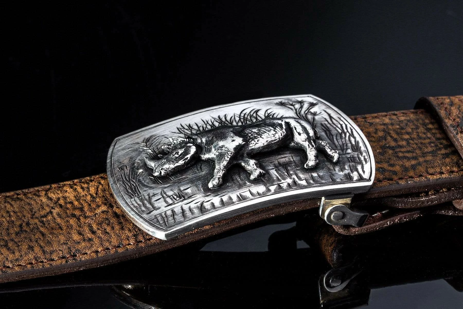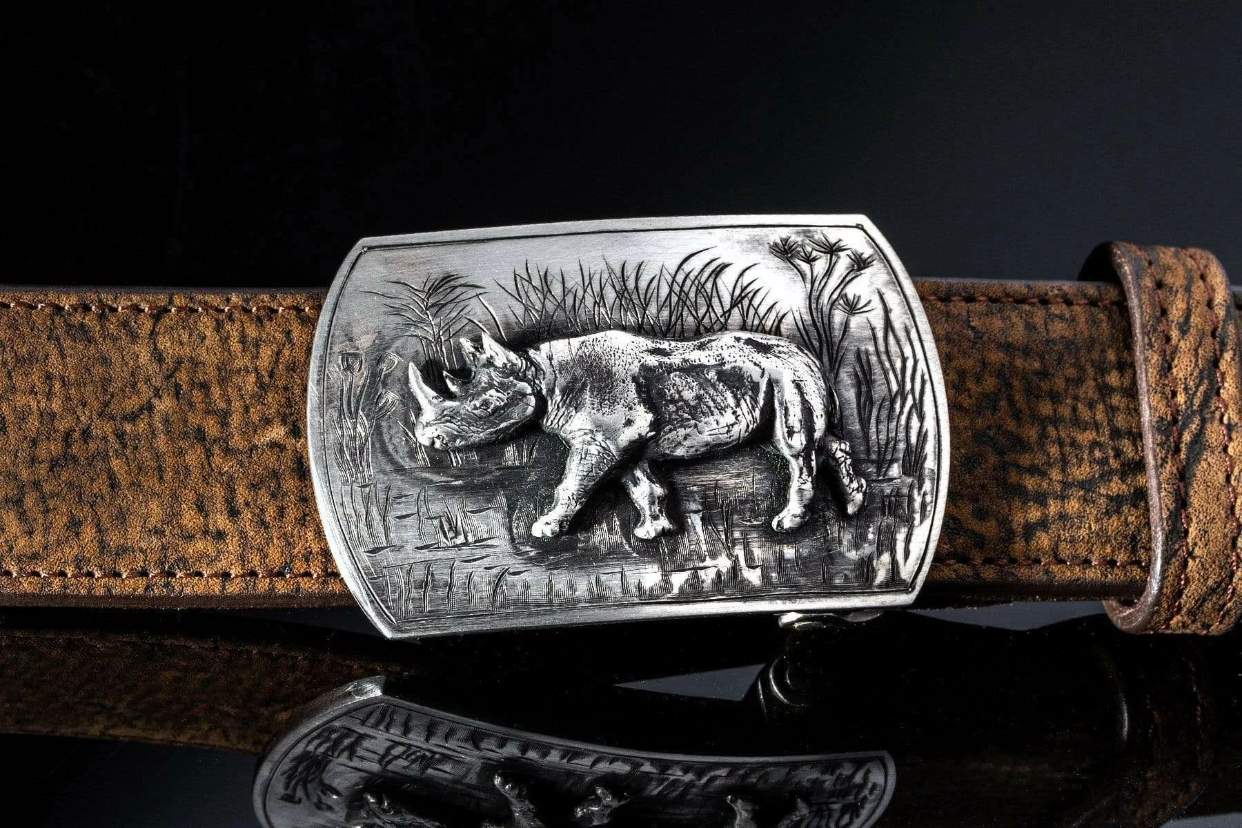 Extra heavy distressed Branson shape with hand-cast Rhino. Hand engraved sterling silver deep cut scenery.