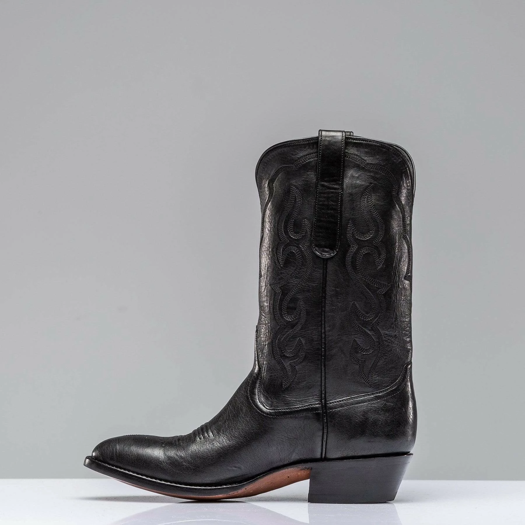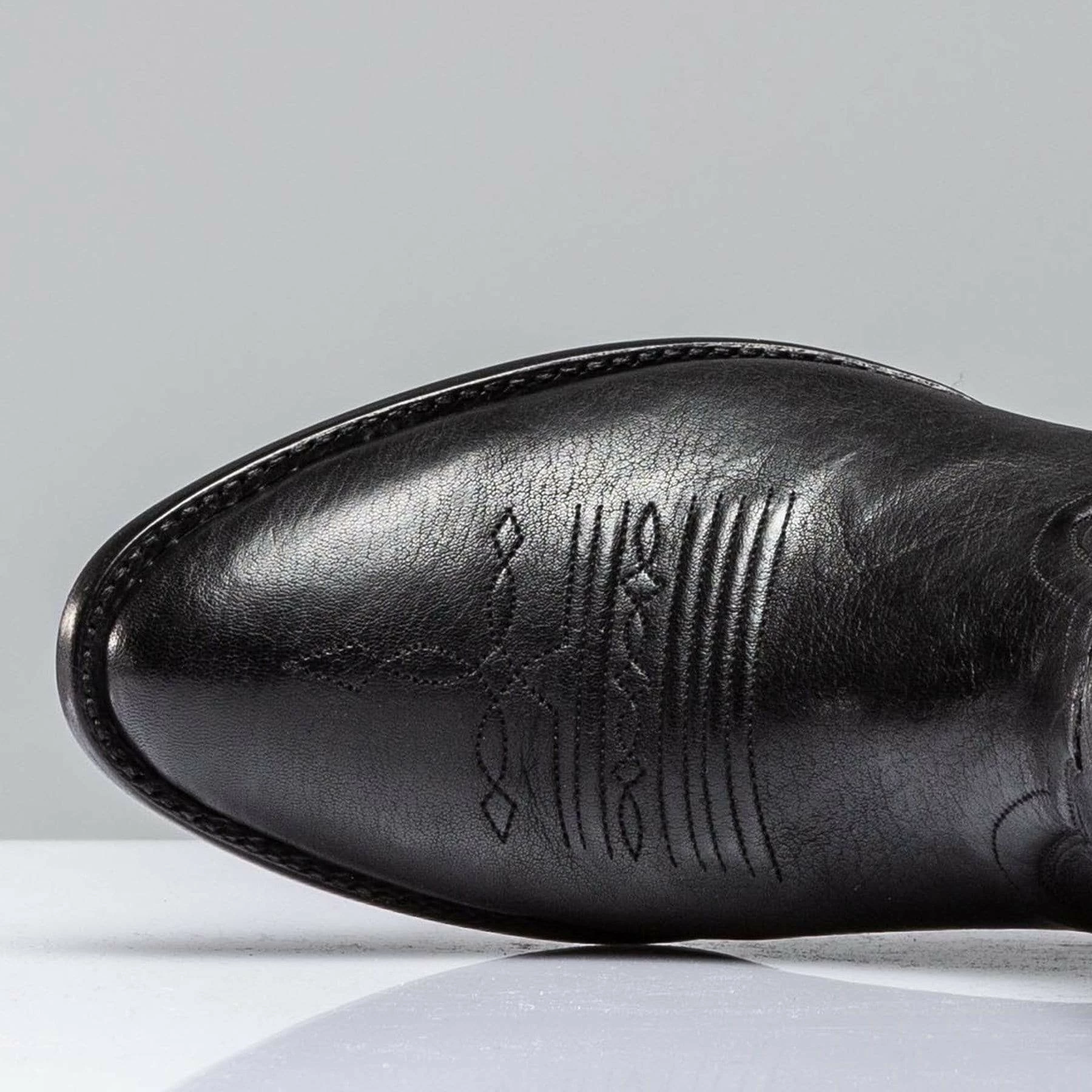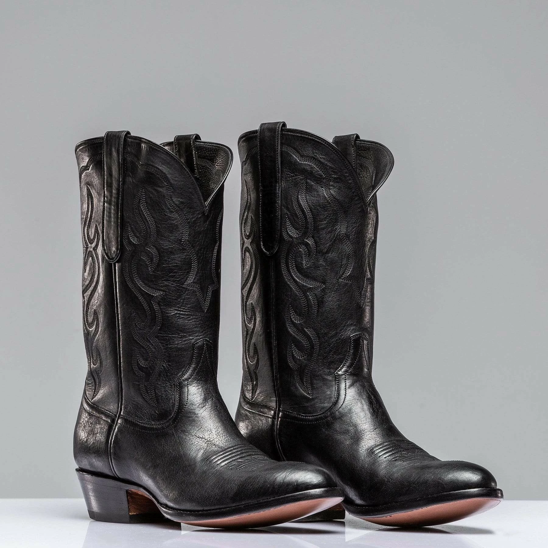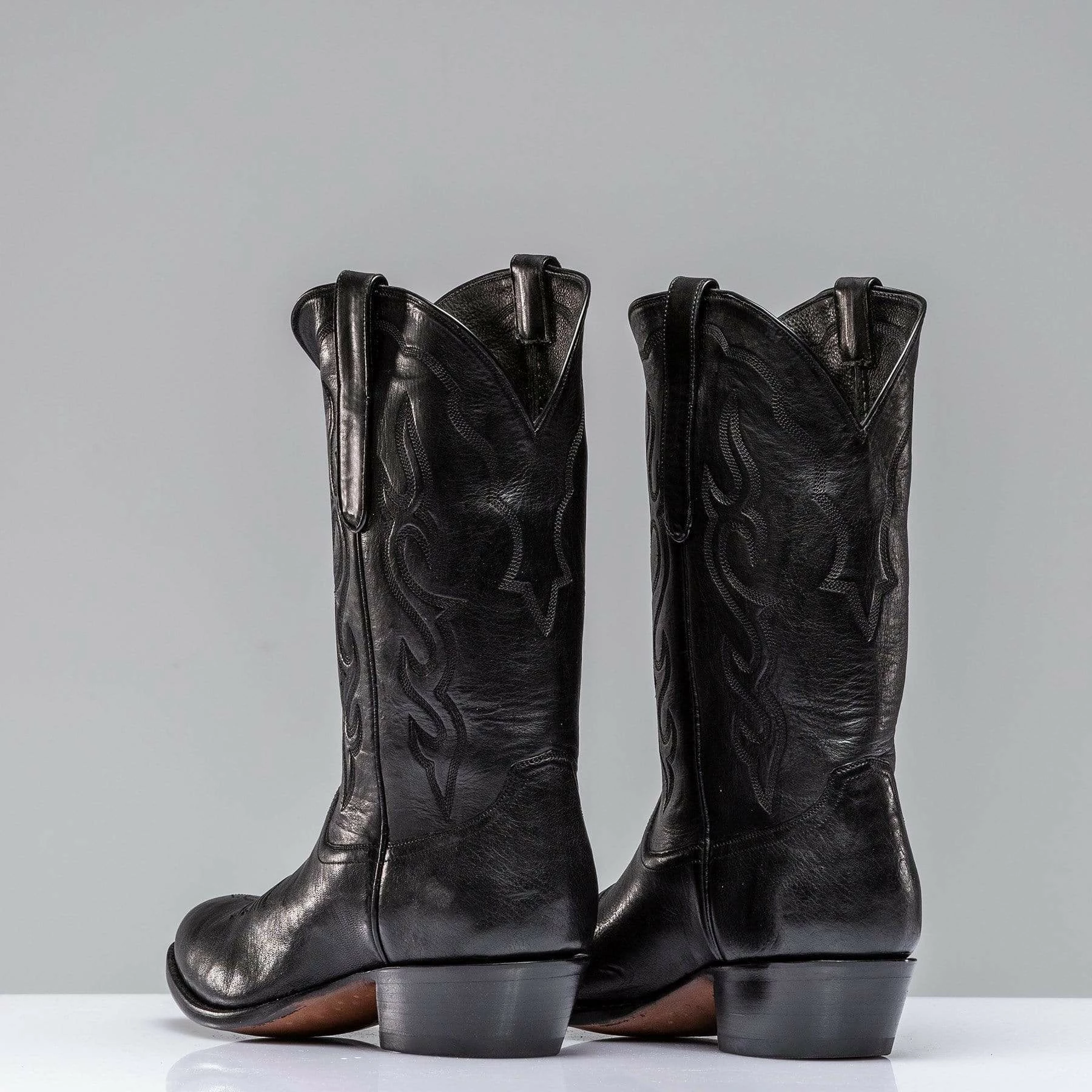 A sleek Montana goat leather boot in black with tonal four-row black flame stitching on the upper. Decorated with tonal bug and wiggle stitching on vamp. Each pair is handmade by artisans from Stallion Boot Company of El Paso, Texas with 30 or more years of experience.