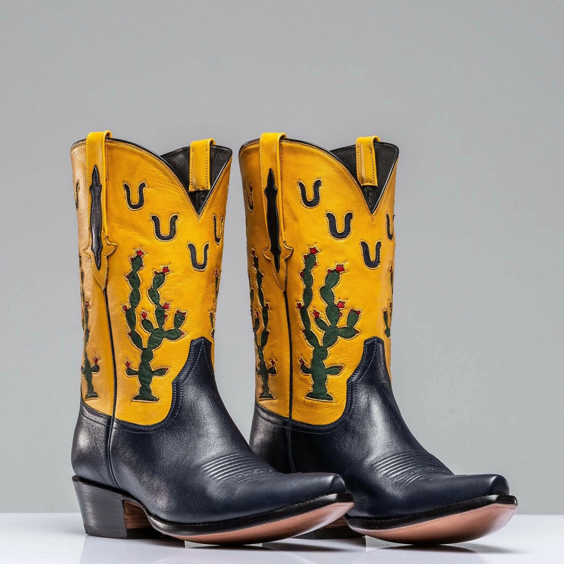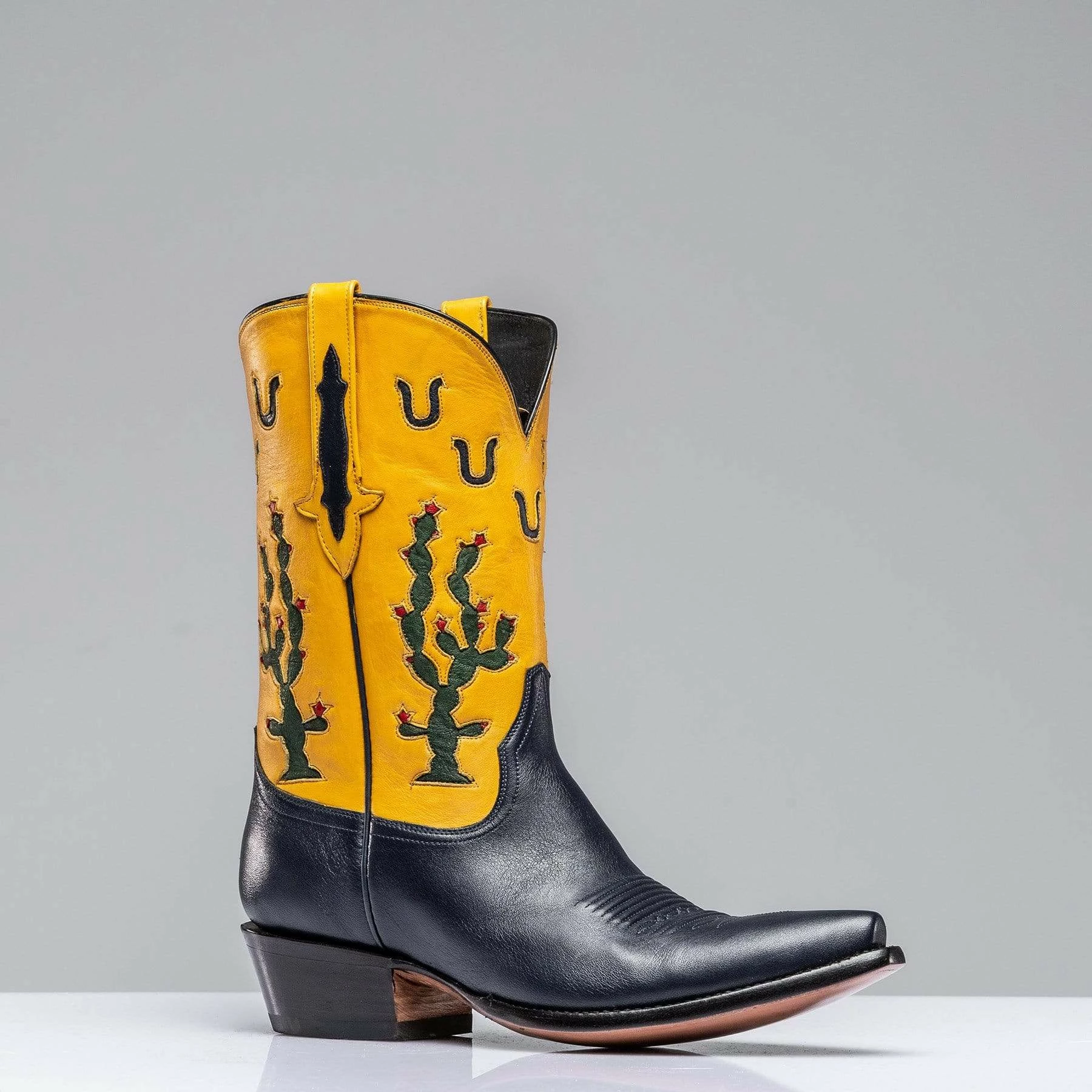Embraced as an icon of the American dream, the cowboy boot has a hardworking heritage. In the case of the Cactus Horshoe, however, a renaissance of artful boot-making has taken place embracing the vintage beauty of the classic boot. Featuring a maze yellow calfskin upper that is decorated by impressive inlays of green cacti accompanied by budding red florals and navy horseshoes. A personal favorite of Axel’s, this is a sharp boot with a bit of unexpected flair. Each pair is handmade by artisans from Stallion Boot Company of El Paso, Texas with 30 or more years of experience.