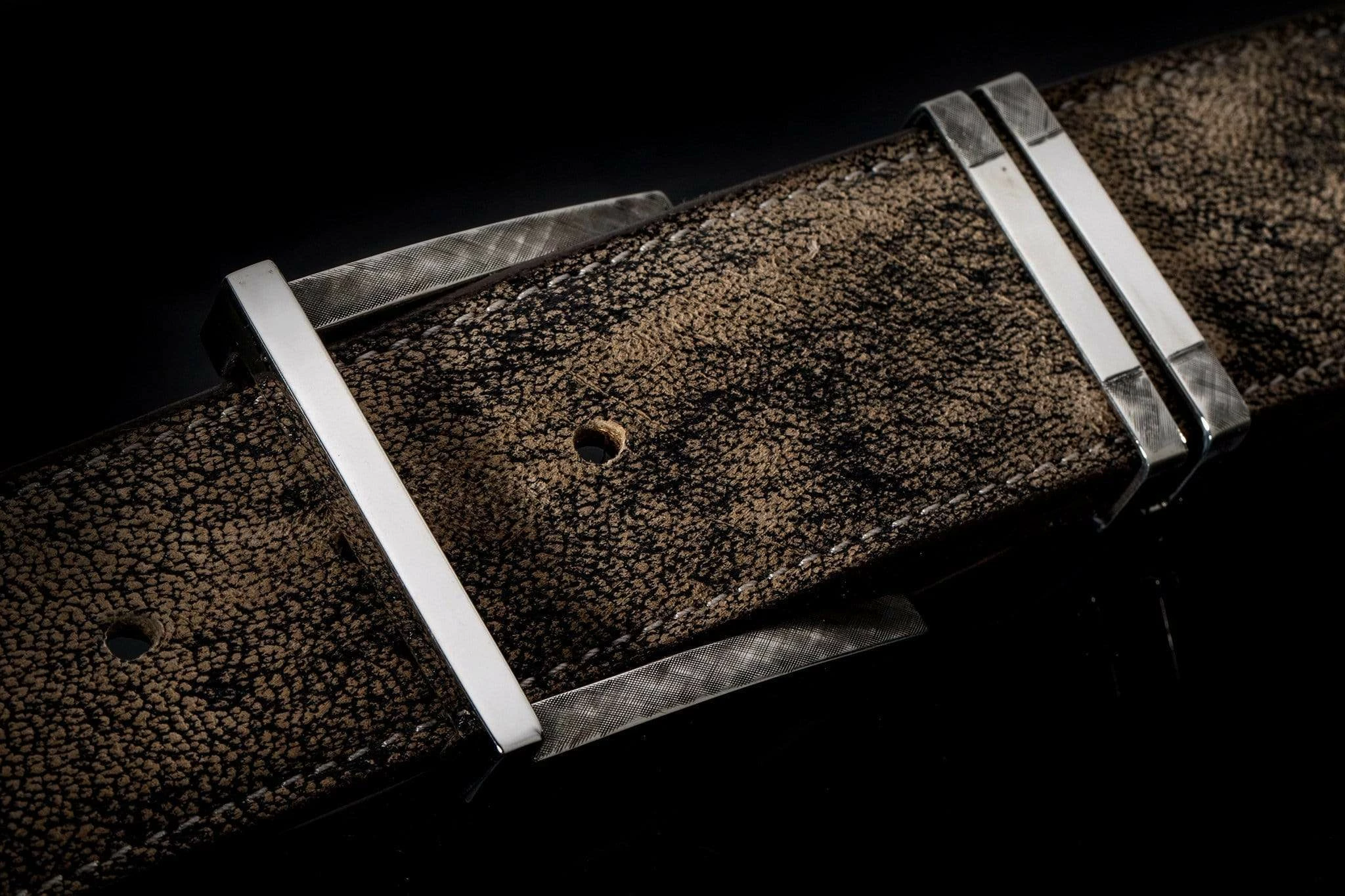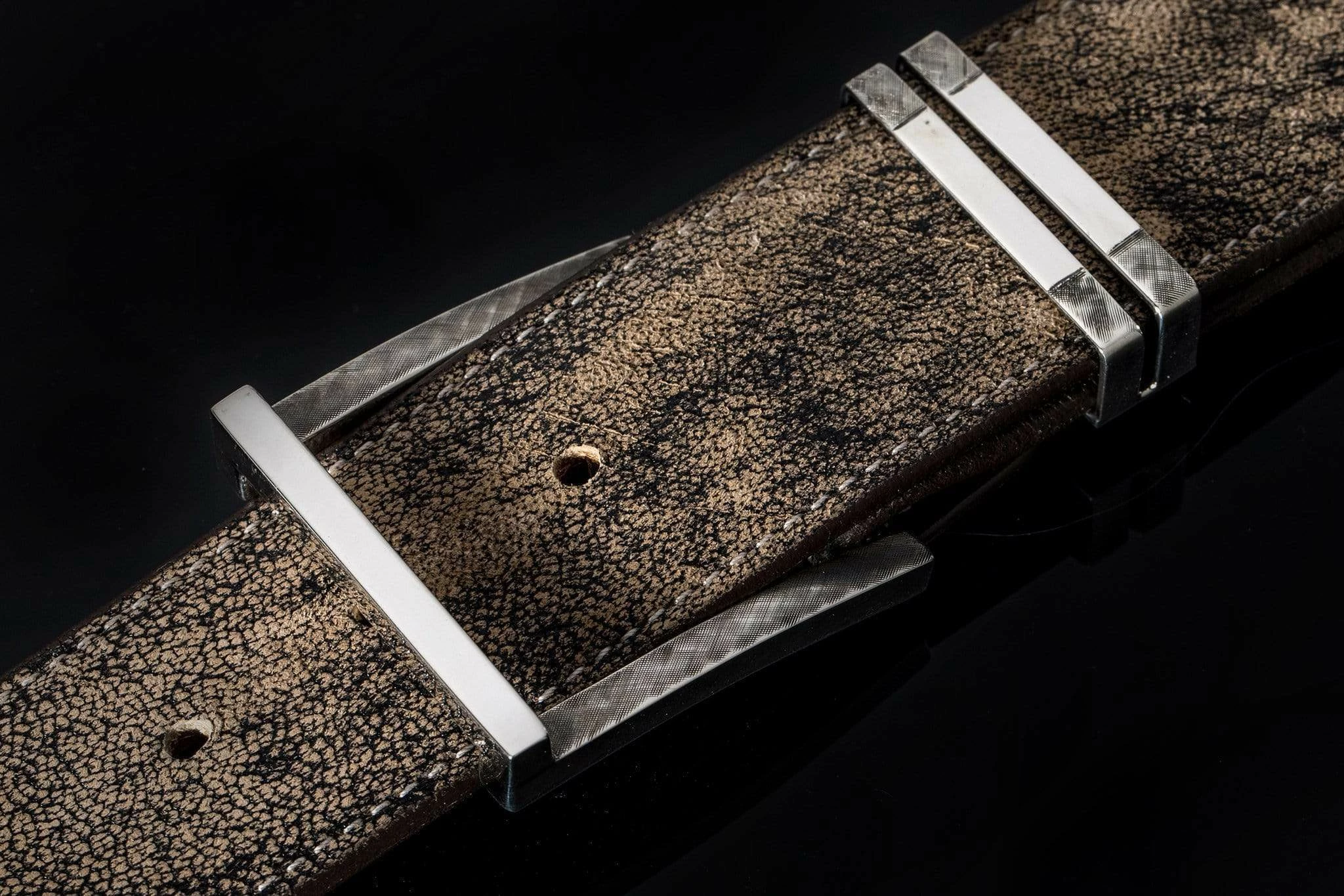- Handmade 1 1 /2″ square wire Crossbeam buckle and keeper, florentine legs.