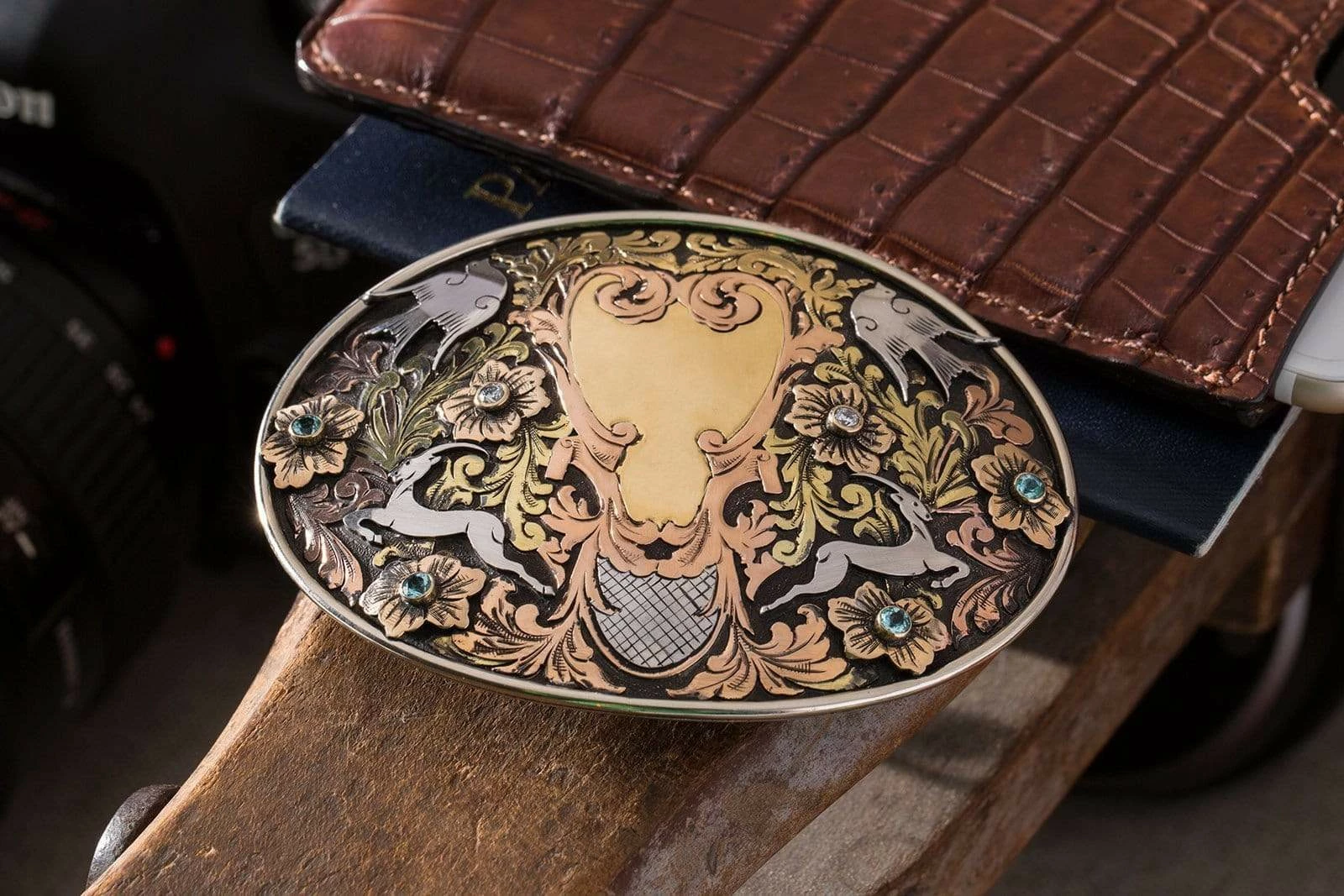 We don’t know if the silversmiths of Comstock Heritage are fans of African wildlife, muscle cars, but with the Impala they’ve created a belt buckle that captures the spirit of both. Built with a strong foundation of sterling silver, the face of this buckle has been blackened to set the stage for myriad metal overlays and jewels. Two graceful impalas in mid-jump adorn the bottom, and two birds fly on top. All are made of platinum. Eighteen-karat red, yellow and green gold is fashioned into flowers, leaves and scrolls. Each flower has a precious jewel inside, using .6 carats of tourmaline and .33 carats worth of diamonds. All these contrasting colors make each design stand out. The entire face is then encircled with eighteen-karat white gold. There is so much detail on this buckle, even the back is decorated with beautiful, hand-engraved scrollwork. Comstock Heritage pulled out all the stops to create a one-of-a-kind buckle. Fits all 1.5-inch belt straps.