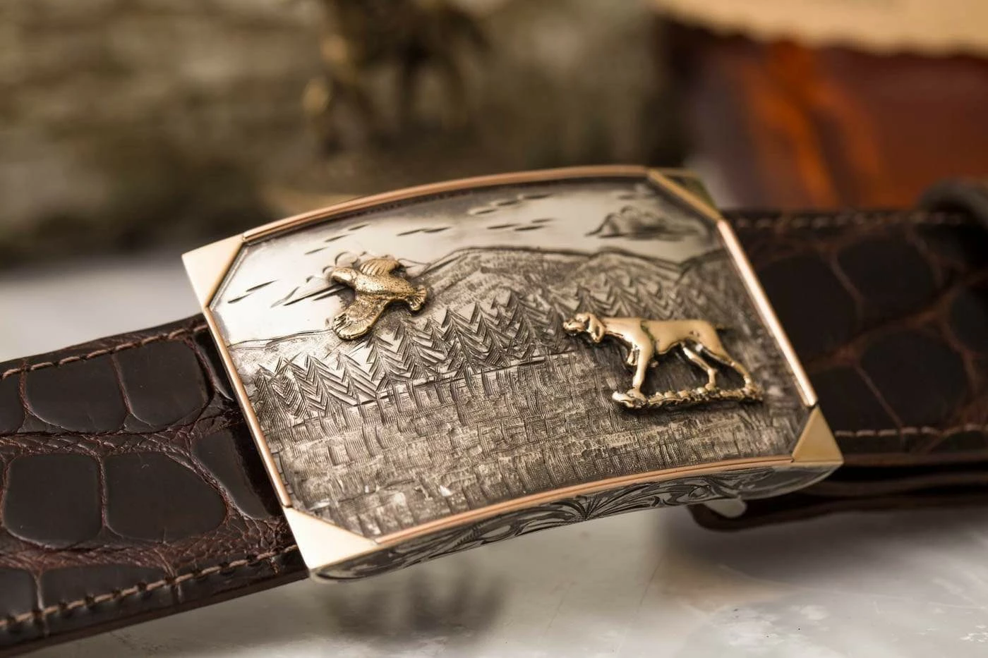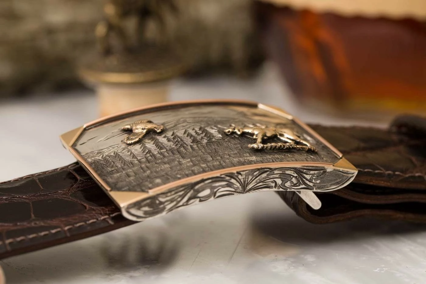 The Field & Stream buckle, part of Axel’s collaboration with Comstock Heritage, features 14k yellow gold bird dog and quail motifs, and 14k yellow gold corners connected by 18k rose gold wire. Hand-engraved and antiqued sterling silver forms the base and backdrop, a dreamhaze landscape that is at once expansive and inward-drawing with its level of detail. Fits all 1.5 inch belts.