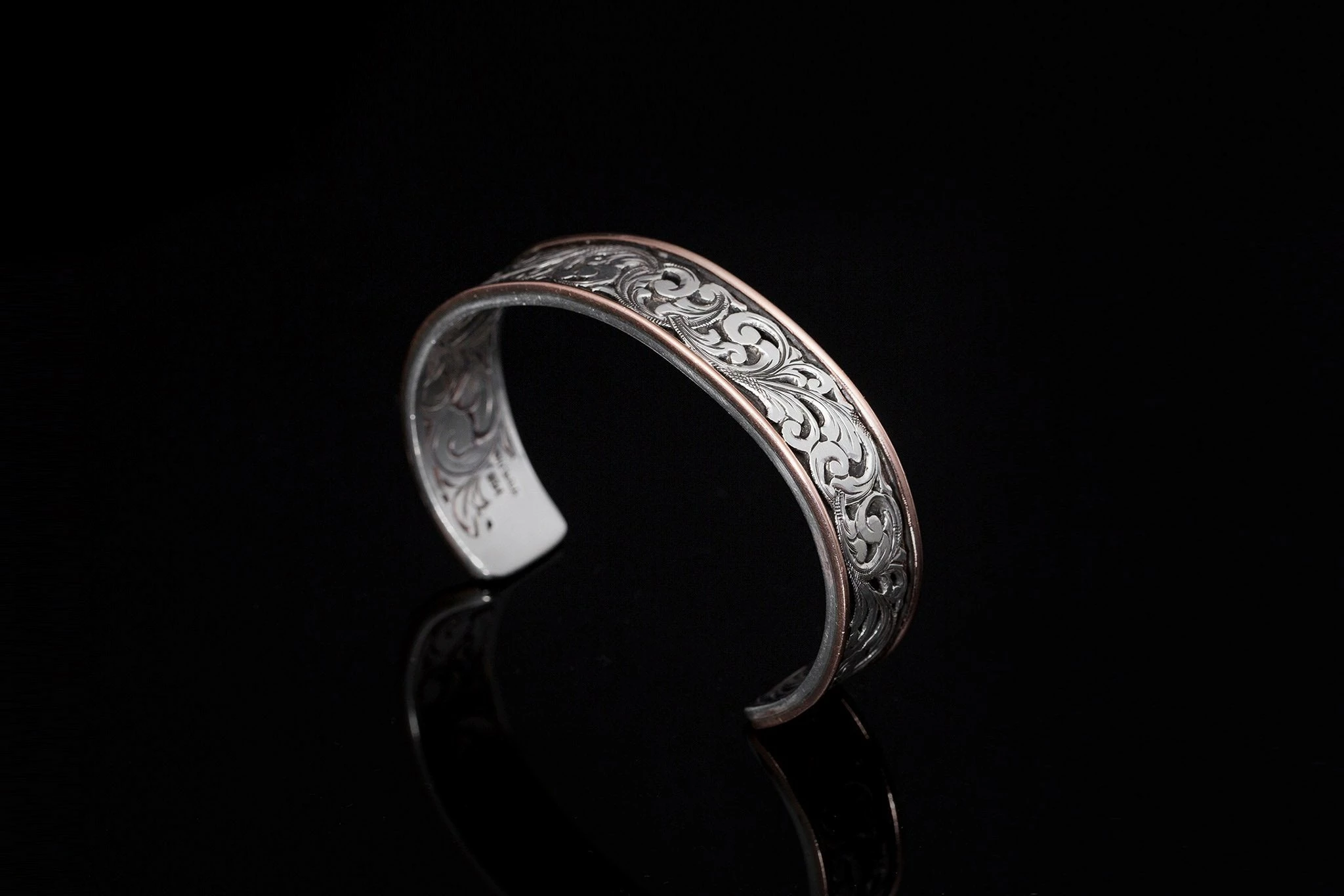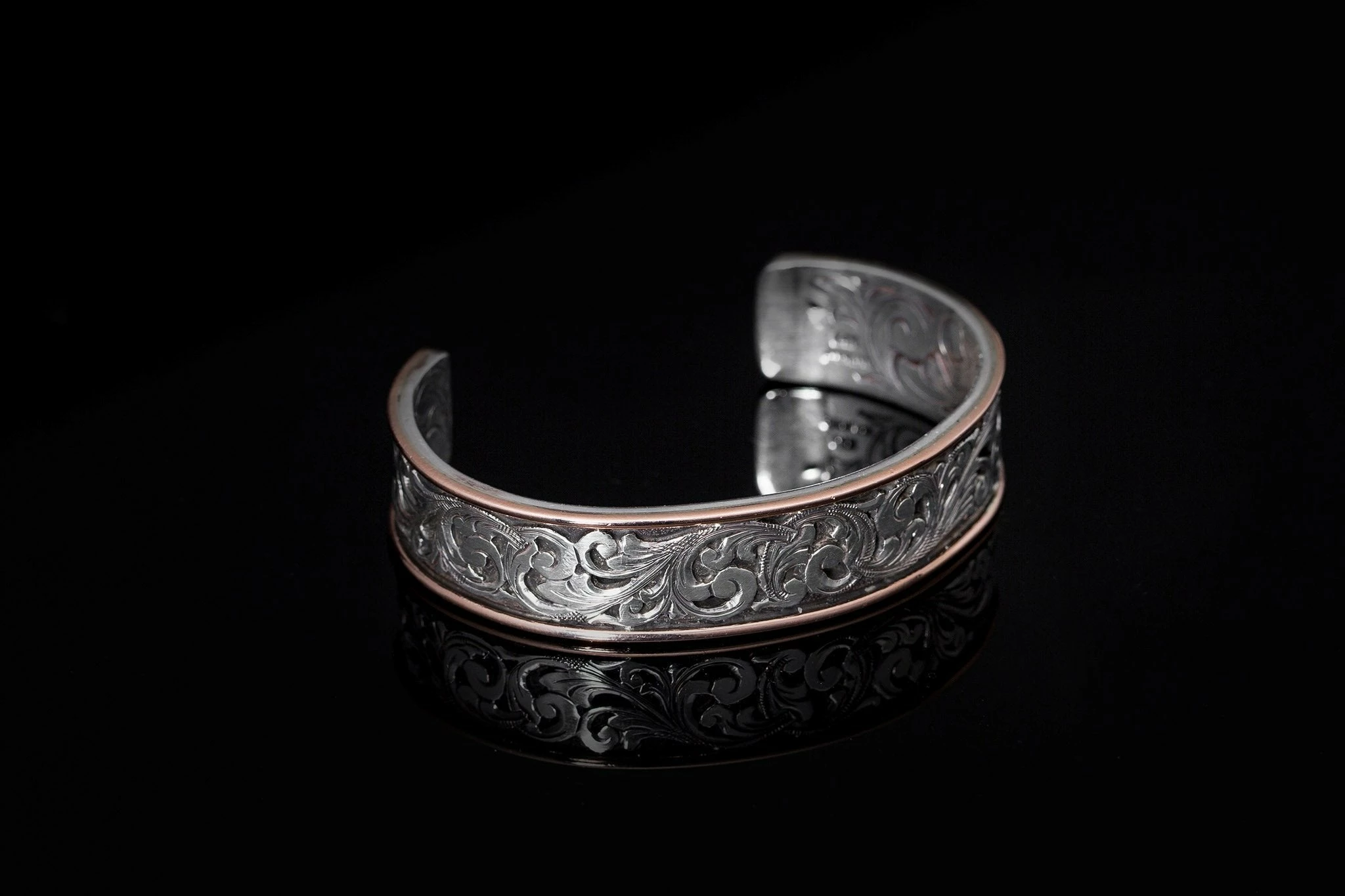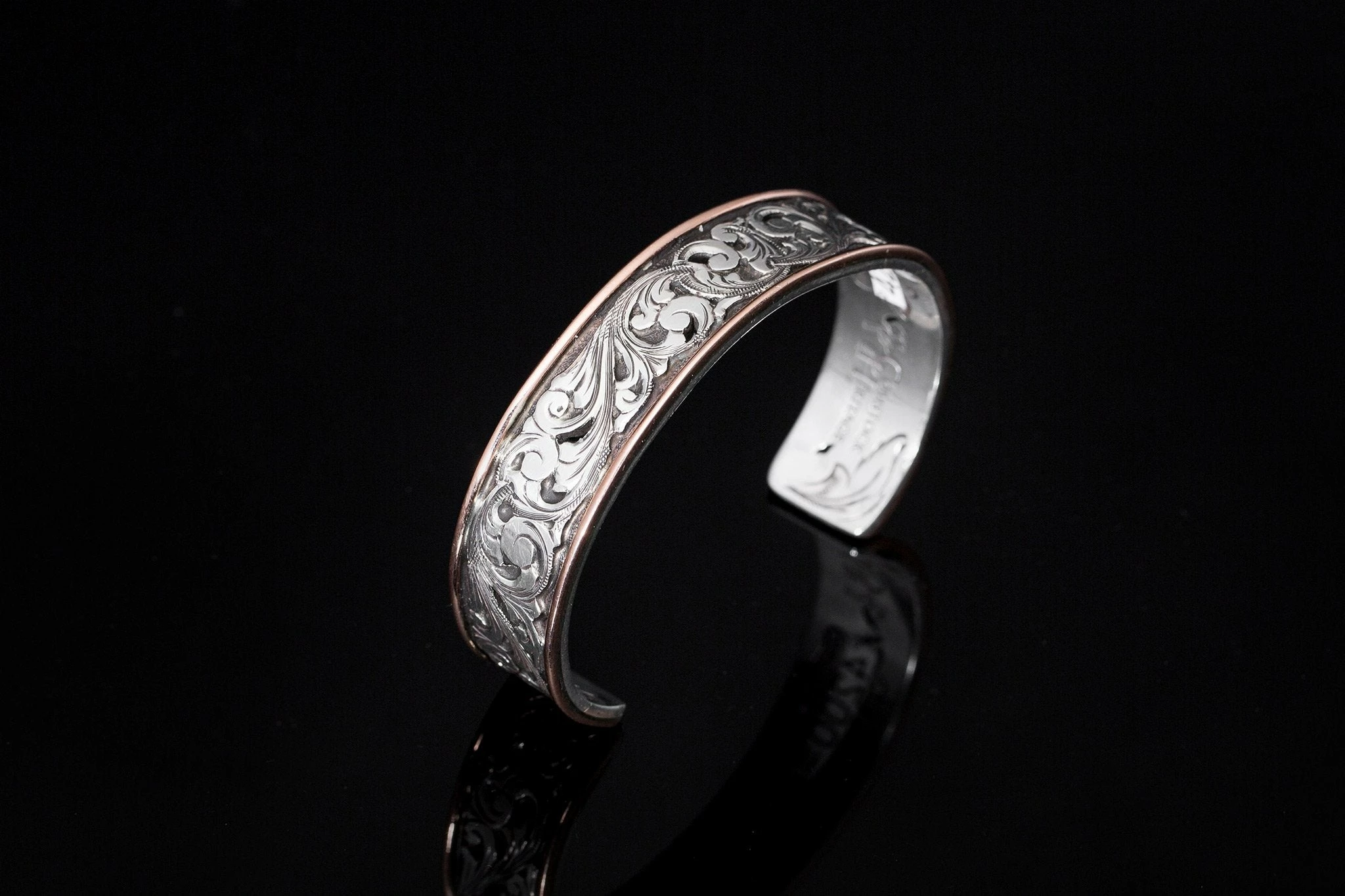 Comstock Heritage heavy guage bracelet w/sterling silver handcut scrolls & 14k red gold round wire edge.