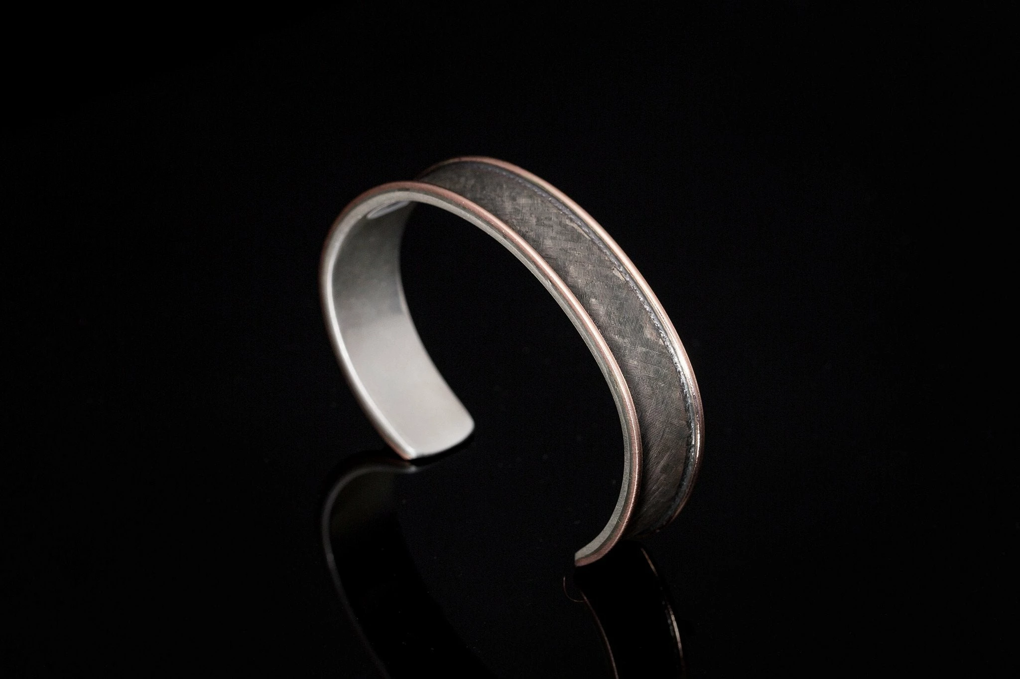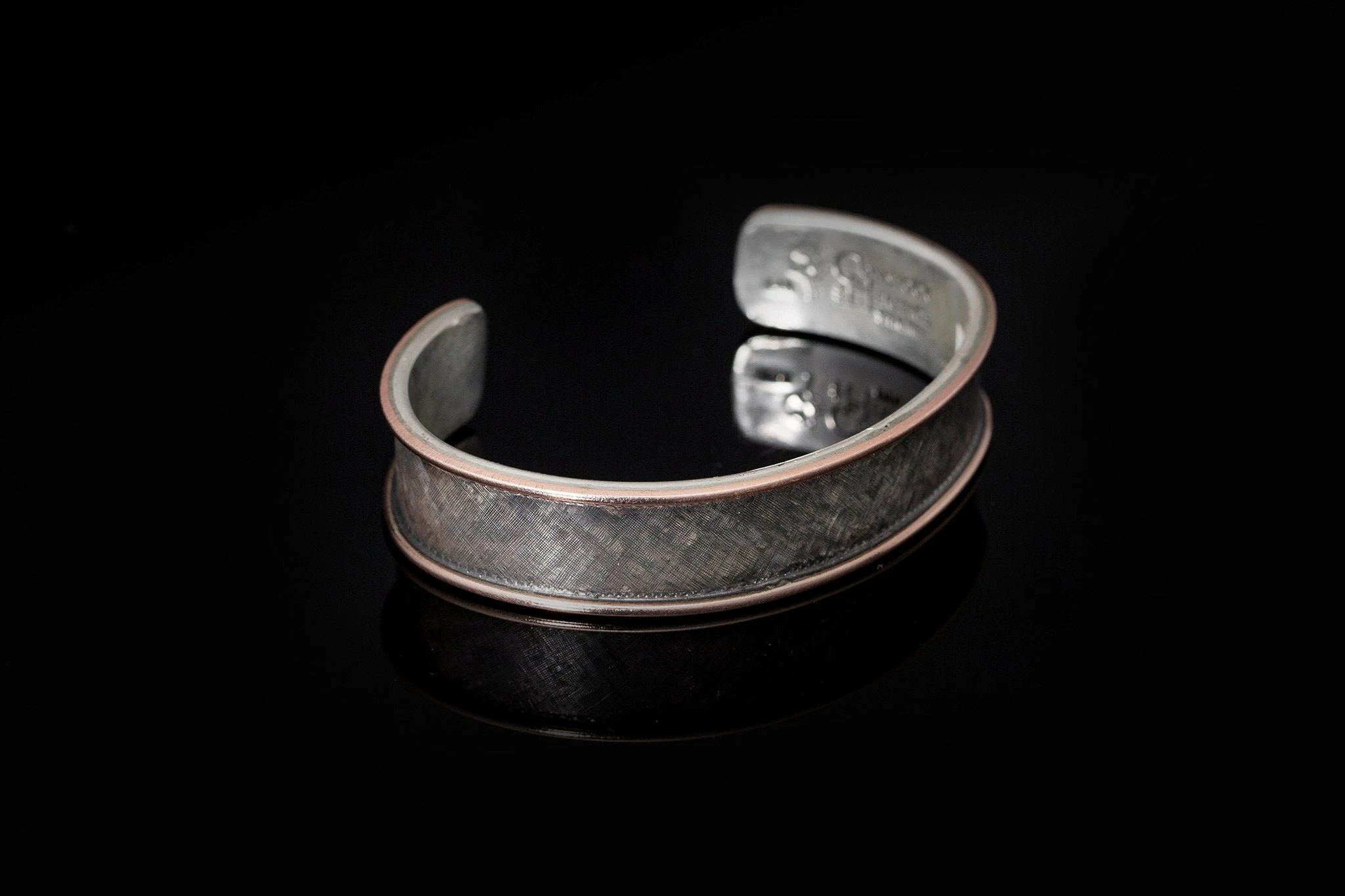 Handmade sterling silver bracelet with Florentine engraving. 5/8 wide with 14 karat yellow gold round wire border. Made by America’s oldest silversmith, Comstock Heritage.