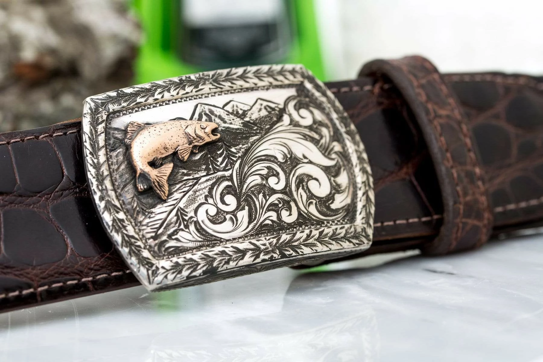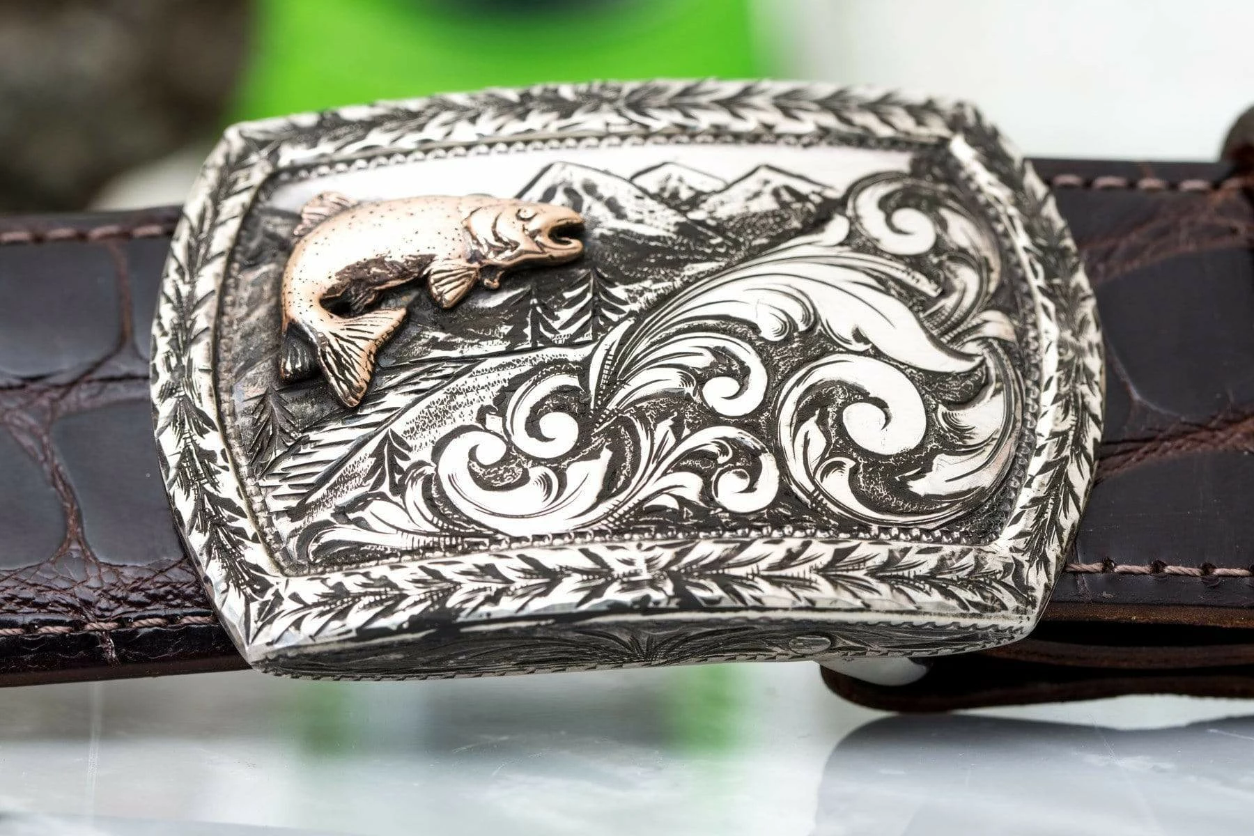 Made by America’s oldest western silversmith, Comstock Heritage, this magnificent 1.5″ trophy buckle features a 14 karat gold trout, elegantly placed against an engraved sterling silver background of mountains and scrollwork. The border is an intricately engraved leaf motif that harmonizes beautifully with the spirit of the buckle.