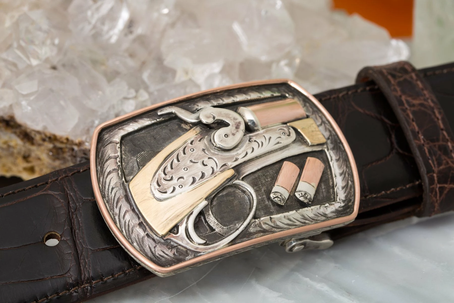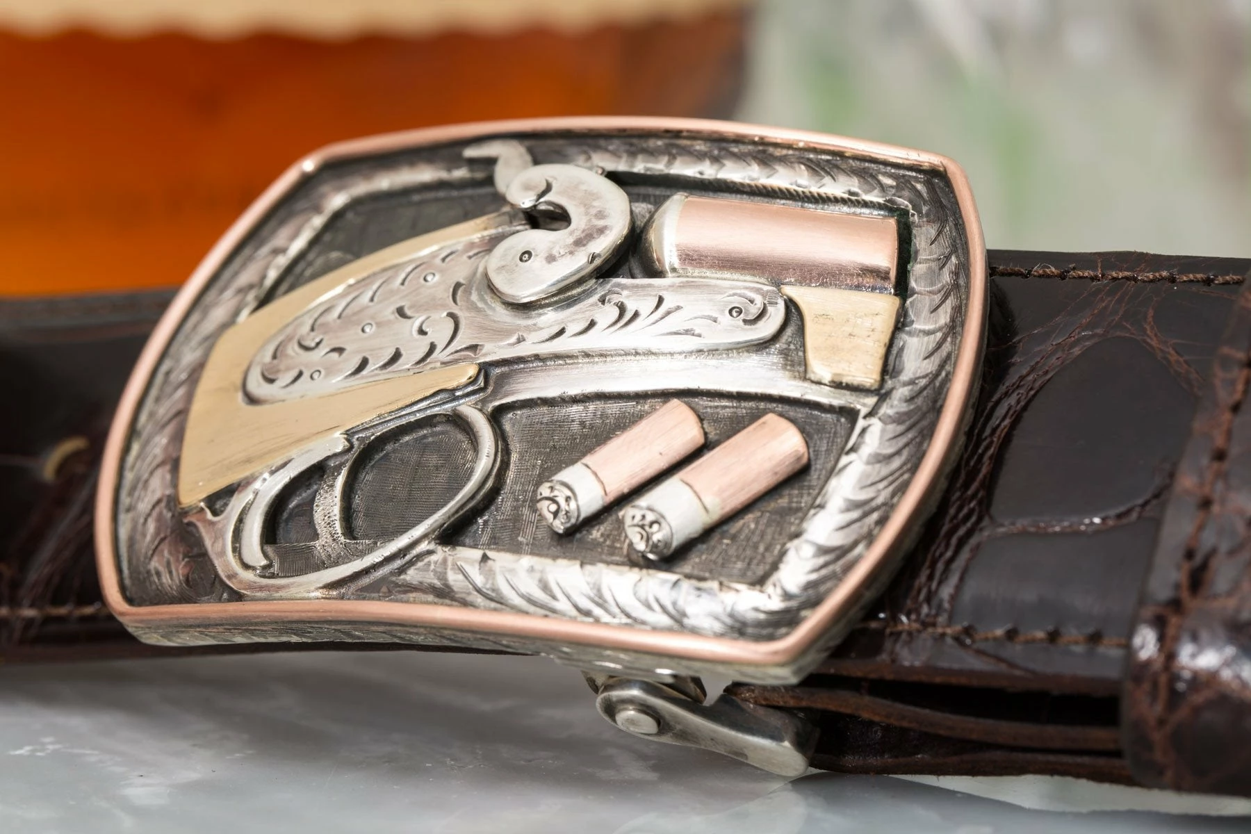 The Halogen Side-by-Side Shotgun buckle by Comstock Heritage features 14k yellow gold, 14k rose gold, and sterling silver at the centerpiece, and a border of engraved sterling silver and raised 14k rose gold wire. The oxidized and engraved sterling inner border and background enhance the raised centerpiece’s three-dimensional effect, highlighted by the elegant exposed hammer and engraved action. Fits all 1.5 inch belts.