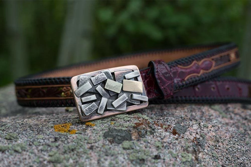 The unique layering technique used here creates a buckle of incredible depth and complexity. First, the foundation of sterling silver is bordered by a band of fourteen-karat rose gold. Next, successive layers of “bricks” are placed on top of one another in an artful design. All the bricks are cut separately by hand and made of either silver or fourteen-karat red, yellow or green gold. The colors, shapes, pattern and negative space result in a modern work of it that challenges assumptions of what a belt buckle can be. Fits all 30mm belt straps.,