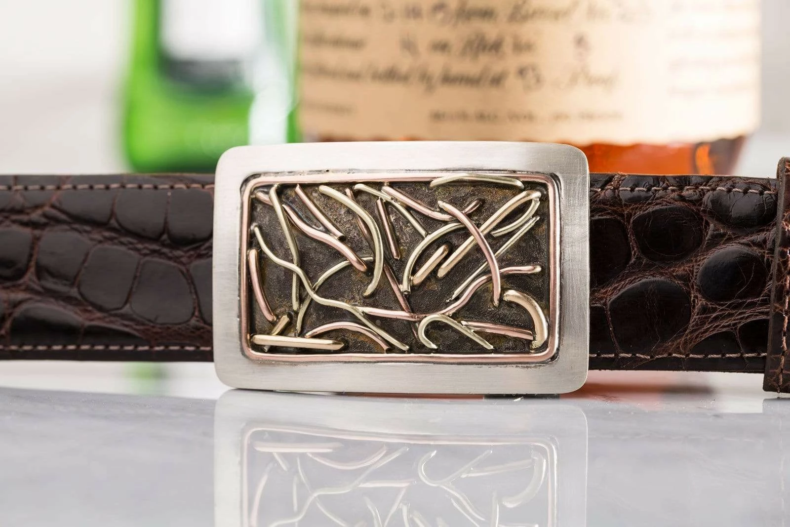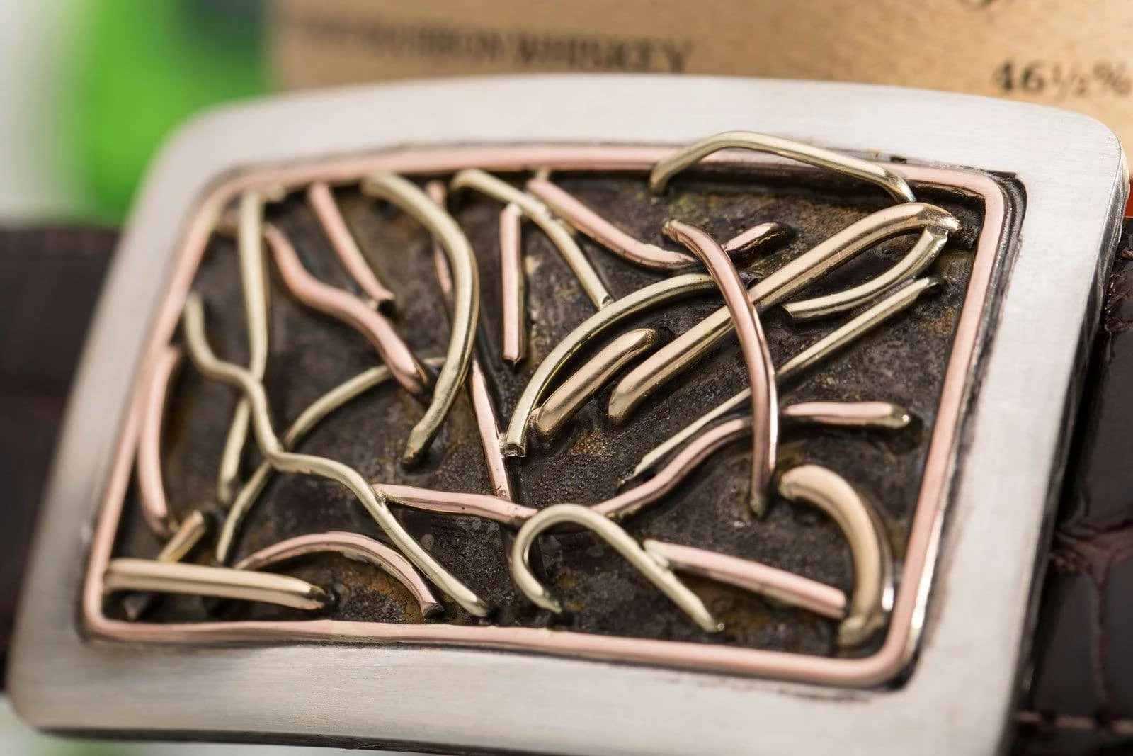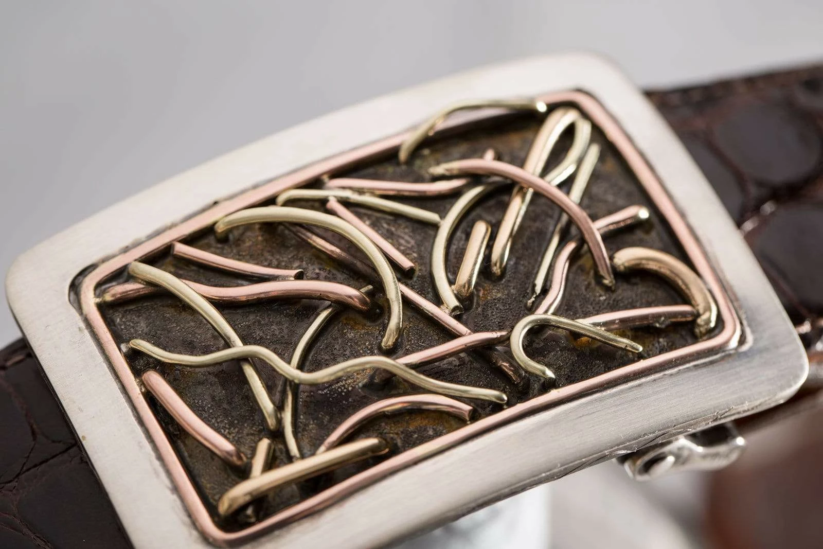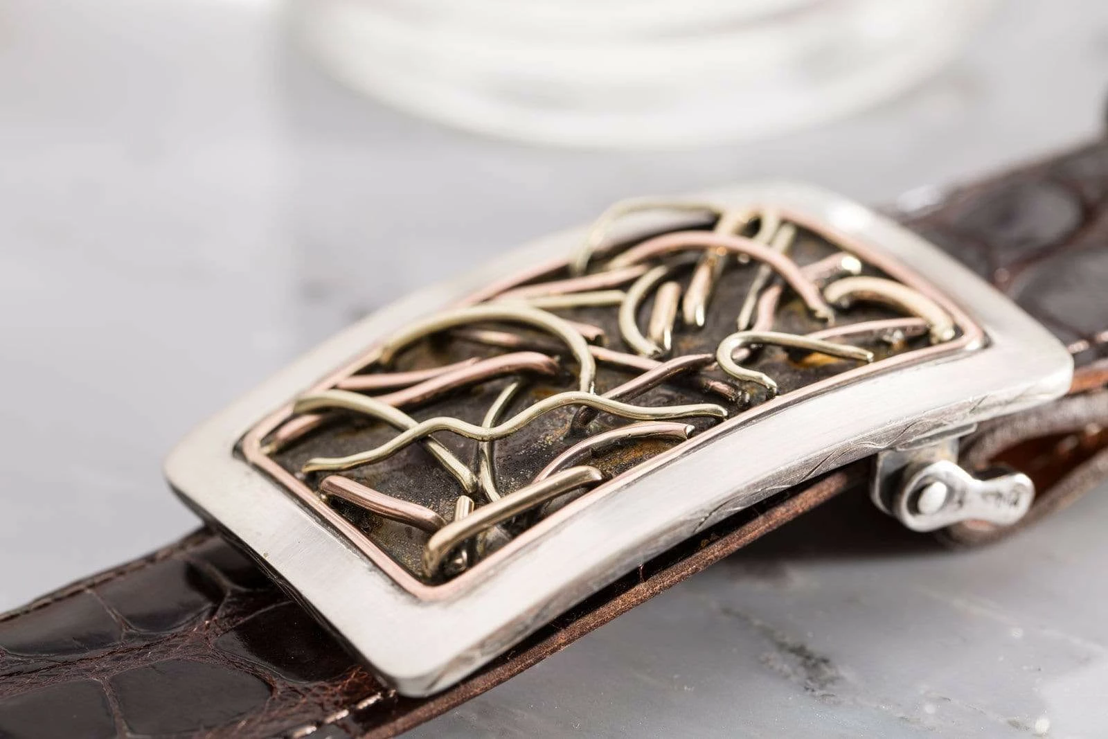 This buckle is made on a hand-wrought sterling silver base with a thick sterling silver border and a second interior border of 14k rose gold wire. The center design features three colors of 14k gold wires (green, rose, and yellow) hand woven through the buckle to create a dynamic and energetic design. The thick, double layer borders lend a sense of balance and order, while the wires’ three-dimensional movements suggest a subtle but irrepressible undercurrent of energy.