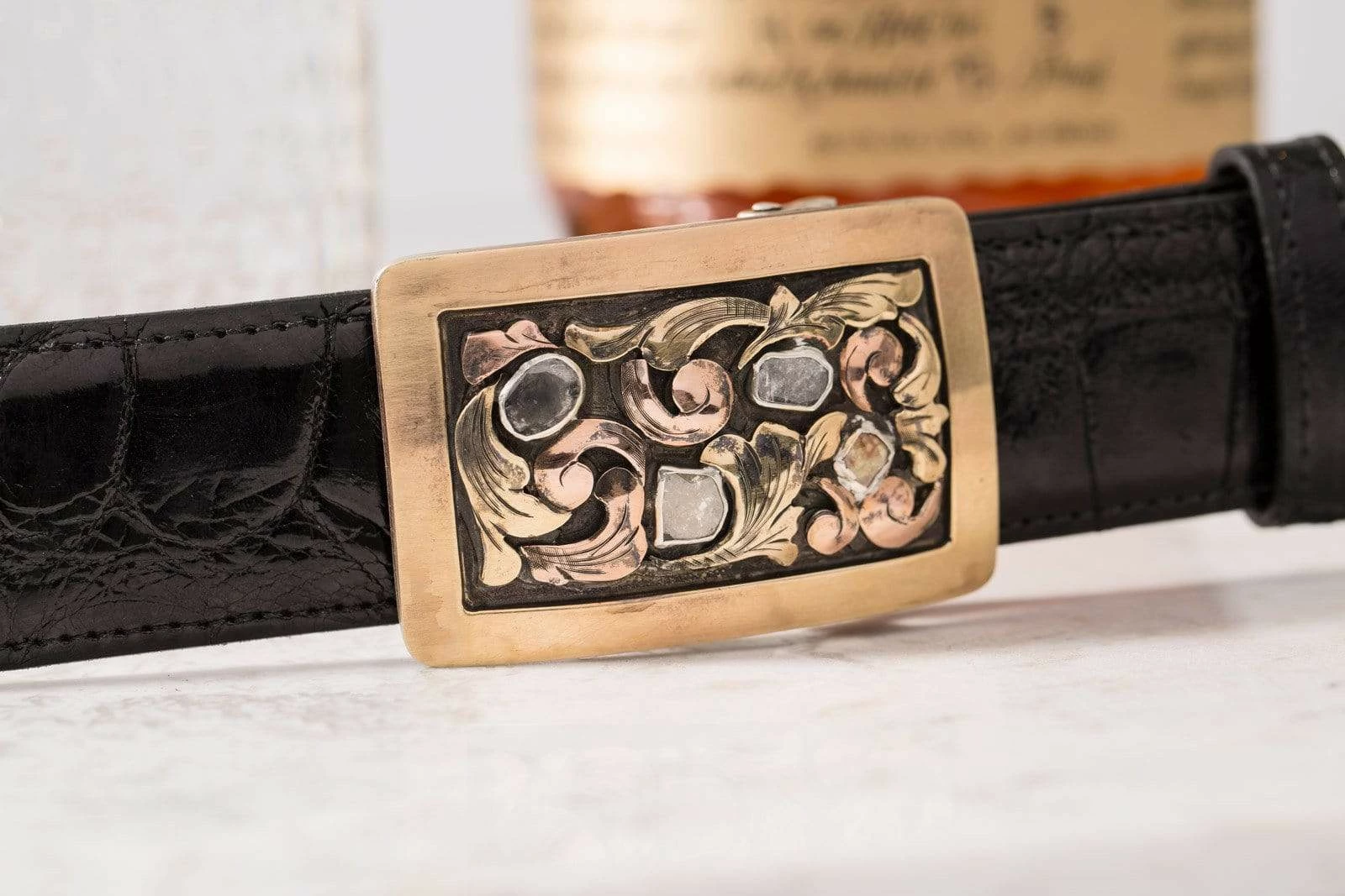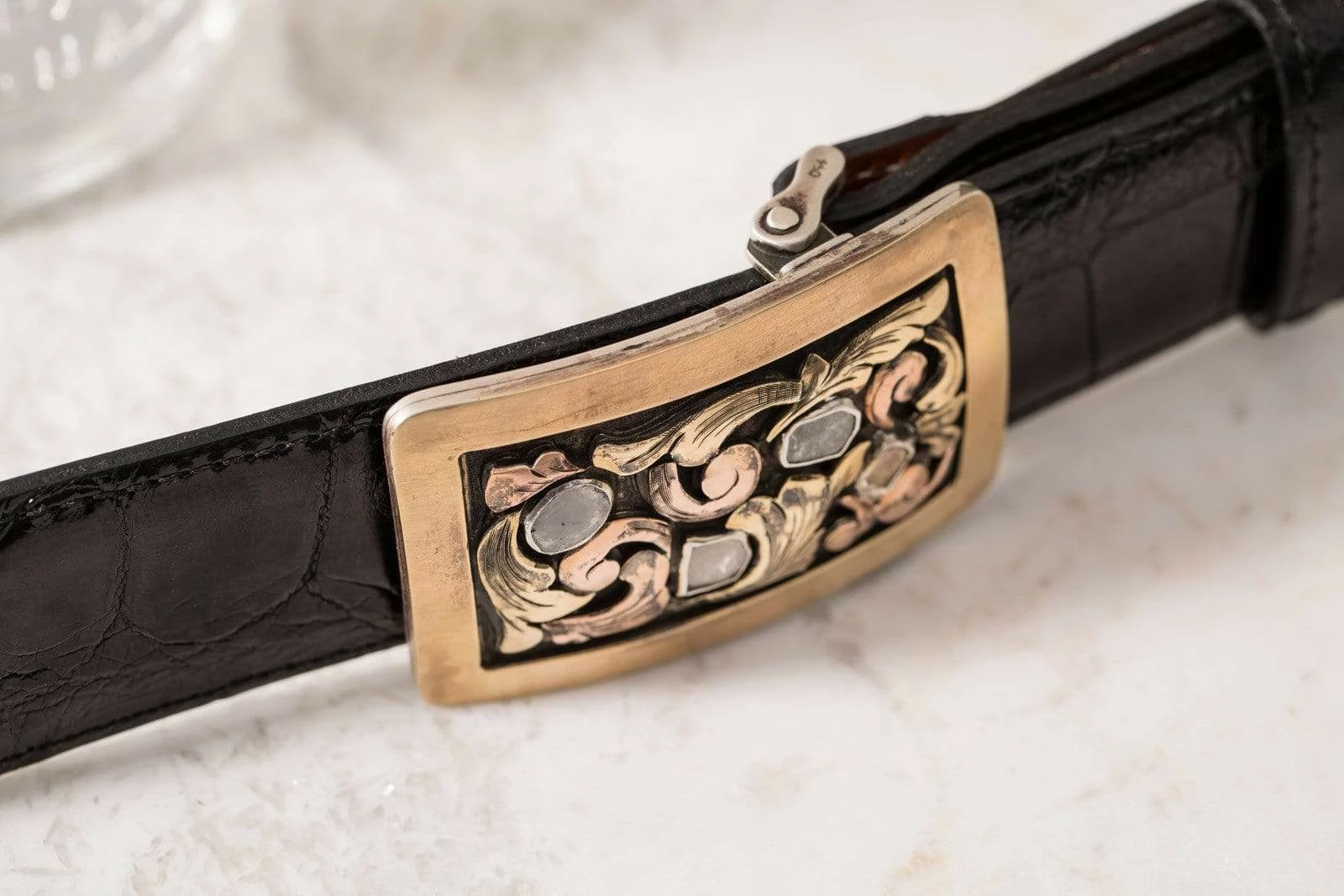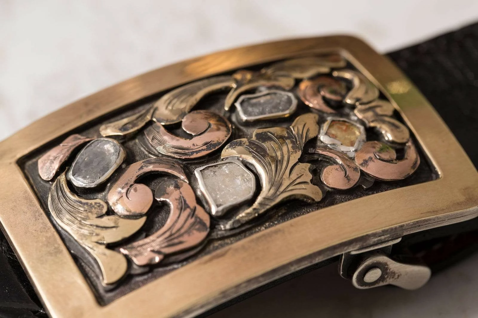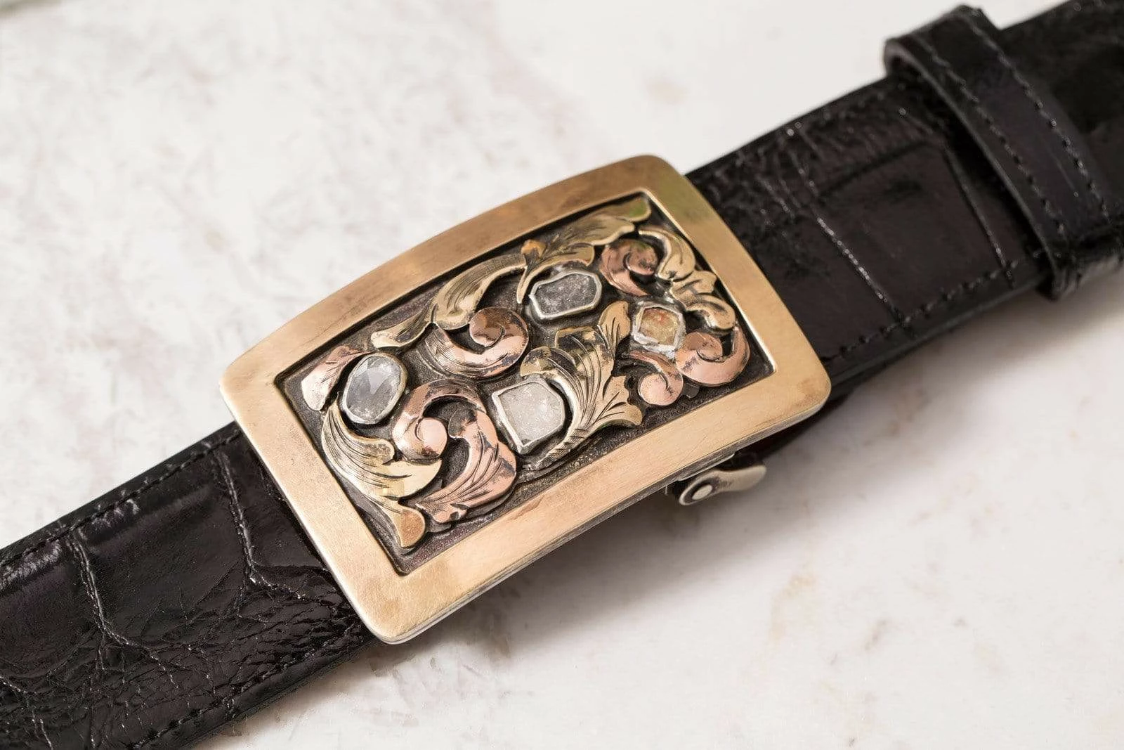 This buckle is made with a hand-wrought sterling silver base, but the dominant aesthetic comes from the thick 14k yellow gold bordering, the 14k yellow and rose gold floral patterning, and the four raw diamonds set in fine silver bezels. We especially enjoy the color correspondence here, as the outer two raw diamonds, with slightly ruddy natural colorations of their own, pick up the bold yellow and rose colors beautifully.