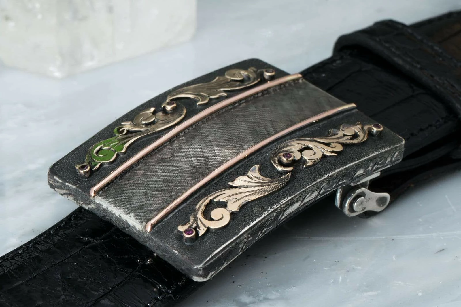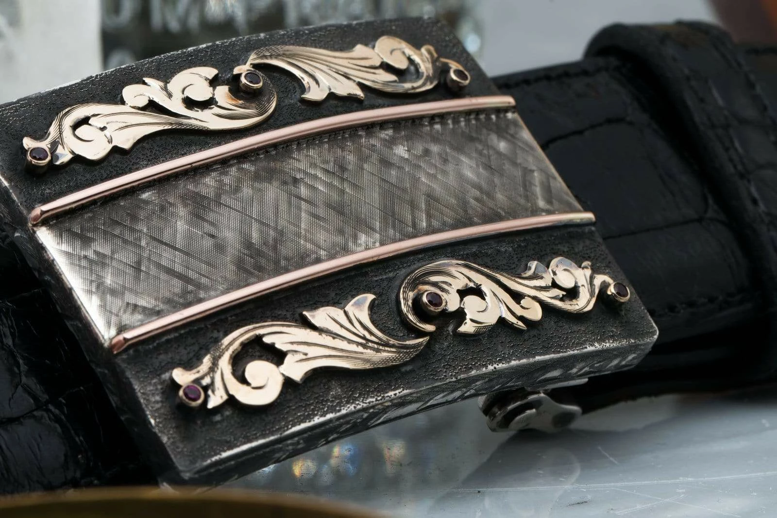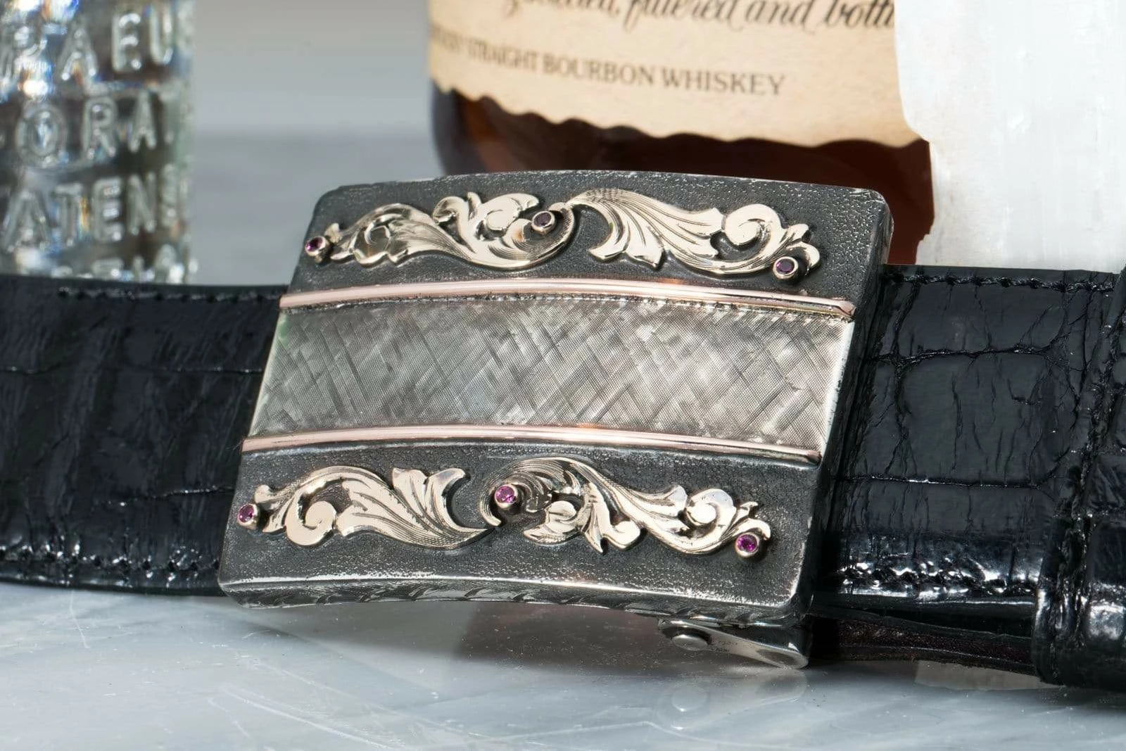The Mason Ricci buckle, made for us by Comstock Heritage, features 14k yellow gold scrollwork, 14k rose gold wire, and six rubies hand set in gold bezels, constructed on a base of handmade sterling silver. Florentine engraving at the central face, and darkened antiquing at the outer portions (accomplished by diamond-tipped distressing), set off the design with tastefully rugged contrast. Fits all 1.5 inch belt straps.
