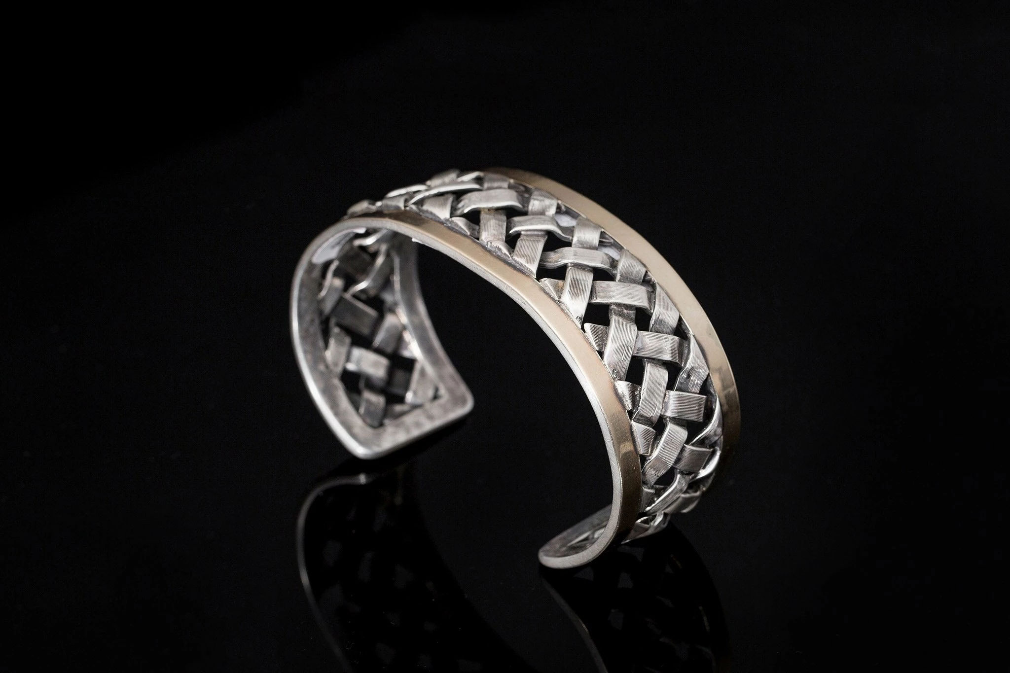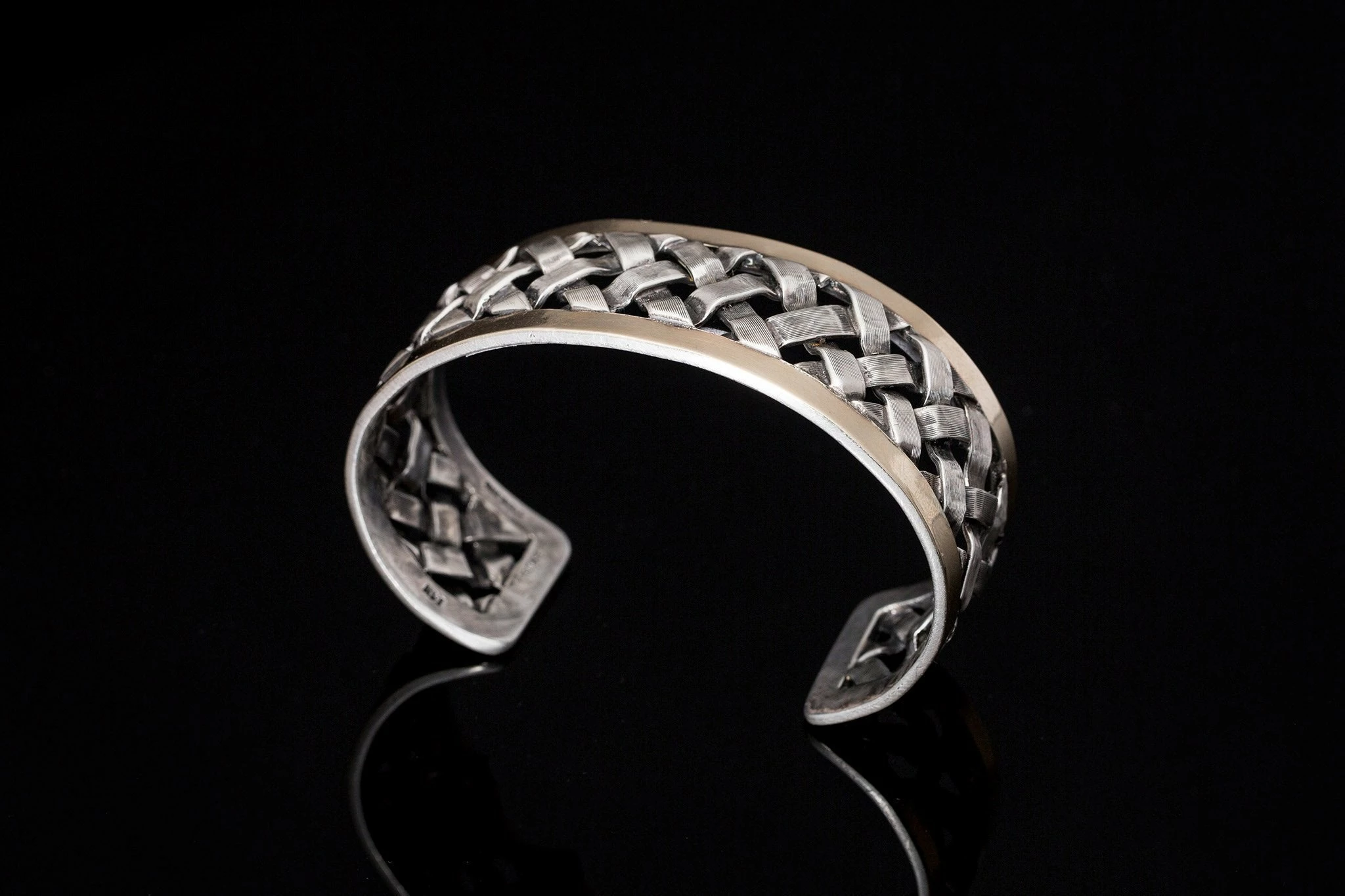 Sterling silver bracelet with 14k yellow gold wide border and sterling silver weave pattern inlay.