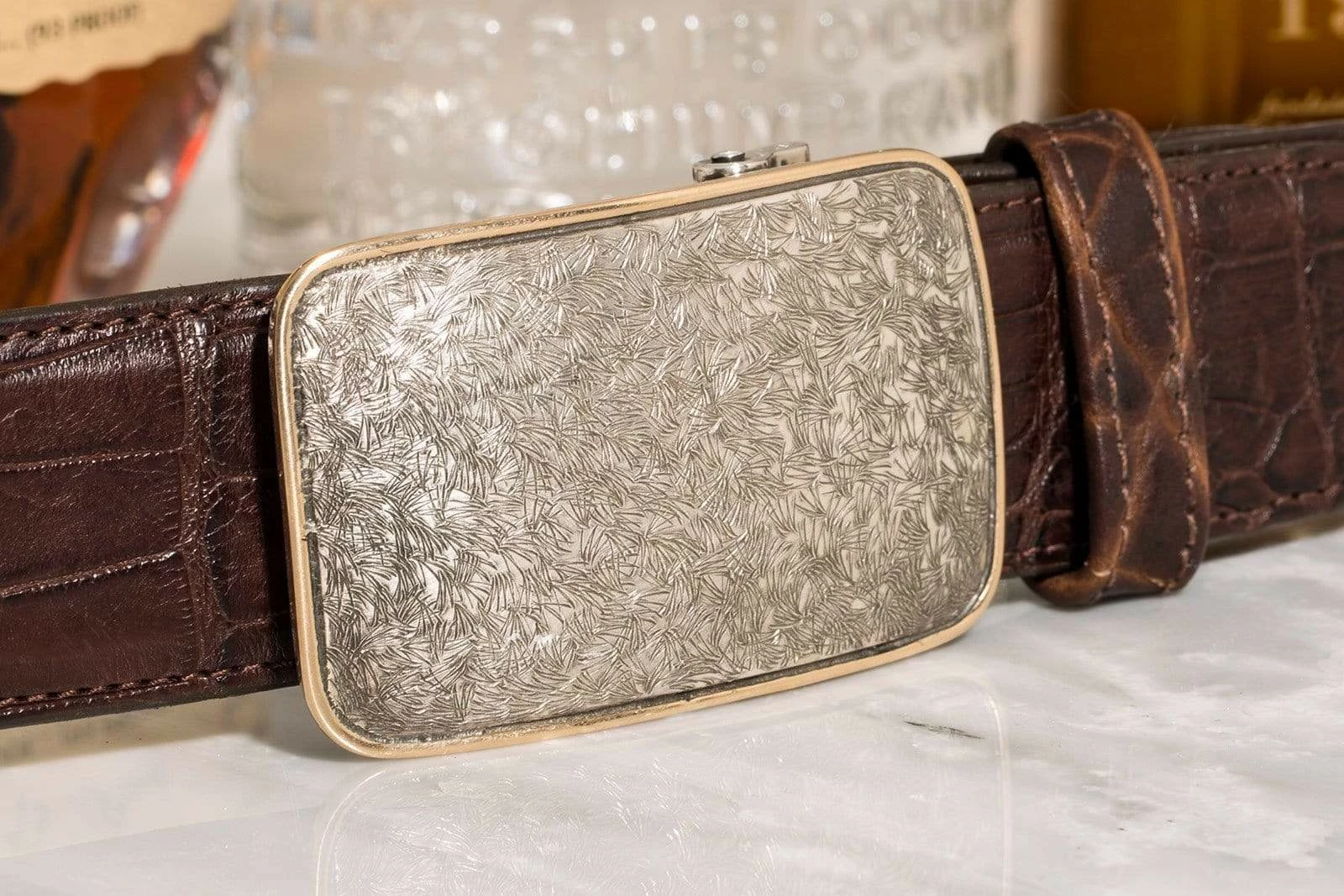 The Poe Mason buckle by Comstock Heritage features an engraved sterling silver face bordered by a 14k yellow gold band, constructed upon a sterling silver base. With an otherwise pared-down design, exceptional engraving is allowed a full exhibition. Handmade to fit all 1.5 inch belt straps.