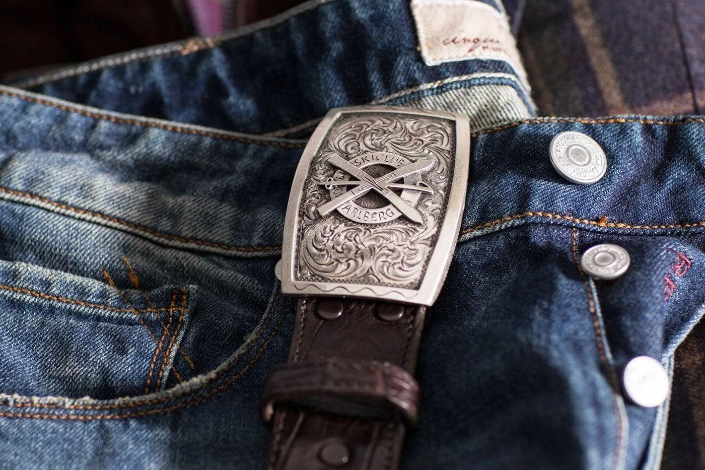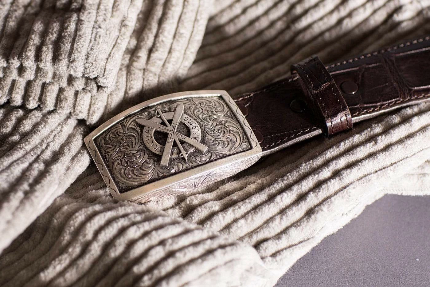 Comstock Heritage 1.5 inch hand engraved sterling silver buckle with sterling silver Alber ski club logo. Fits all 1.5 inch belt straps.
