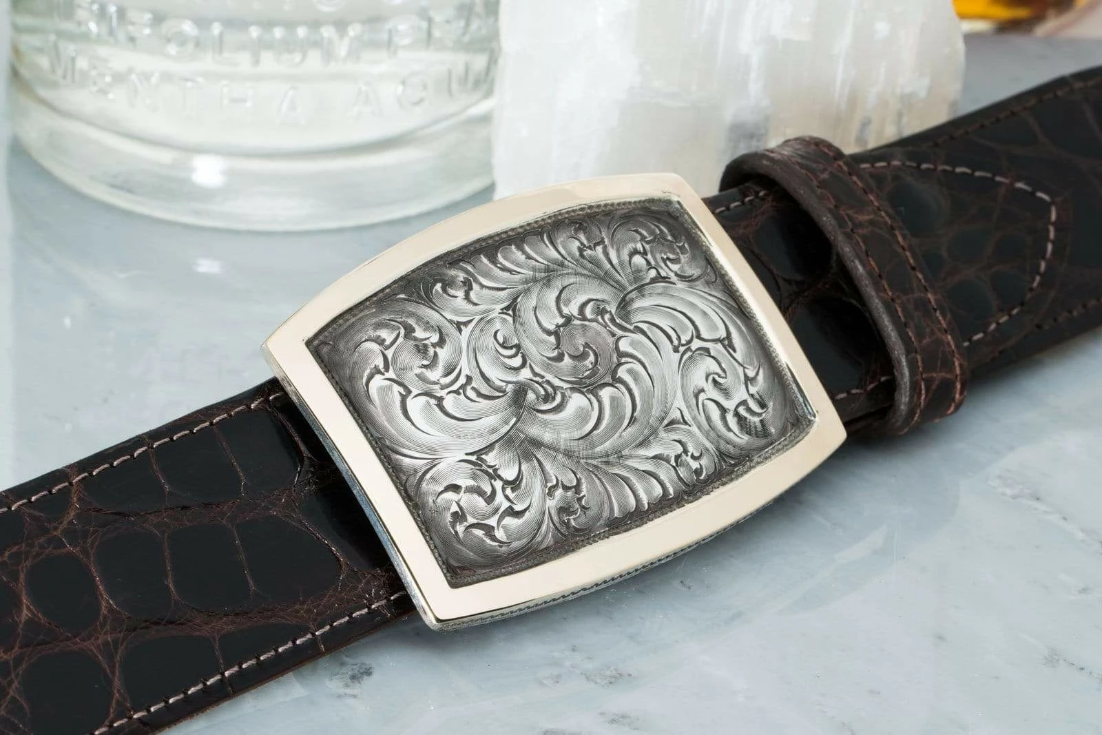 Engraved sterling silver buckle with 14K wide border edgecenter. Fits all 1.5 inch belts.