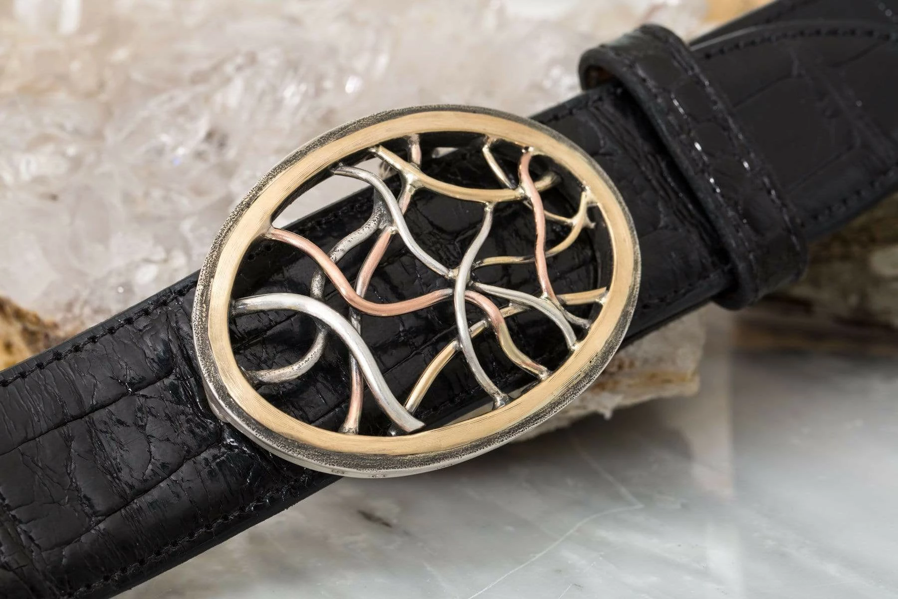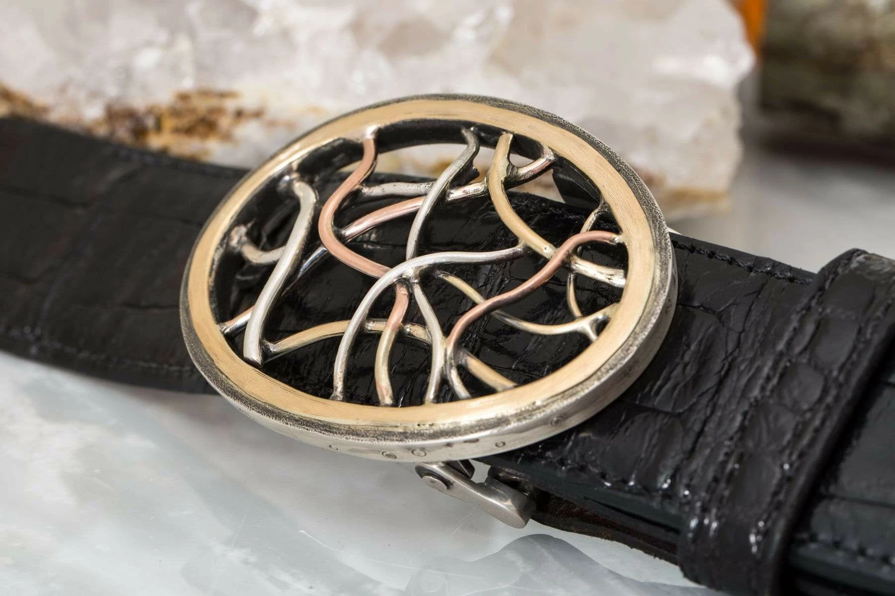 The Stilwell buckle by Comstock Heritage features hand-wrought wires of 14k rose gold, 14k yellow gold, and sterling silver in a double border of 14k yellow gold and hand-vintaged sterling silver. Through an expert balance of color, shape, and space, the Stilwell registers an impression at once powerful and delicate, ordered yet buzzing with energy—not unlike its creator. Fits all 1.5 inch belts.