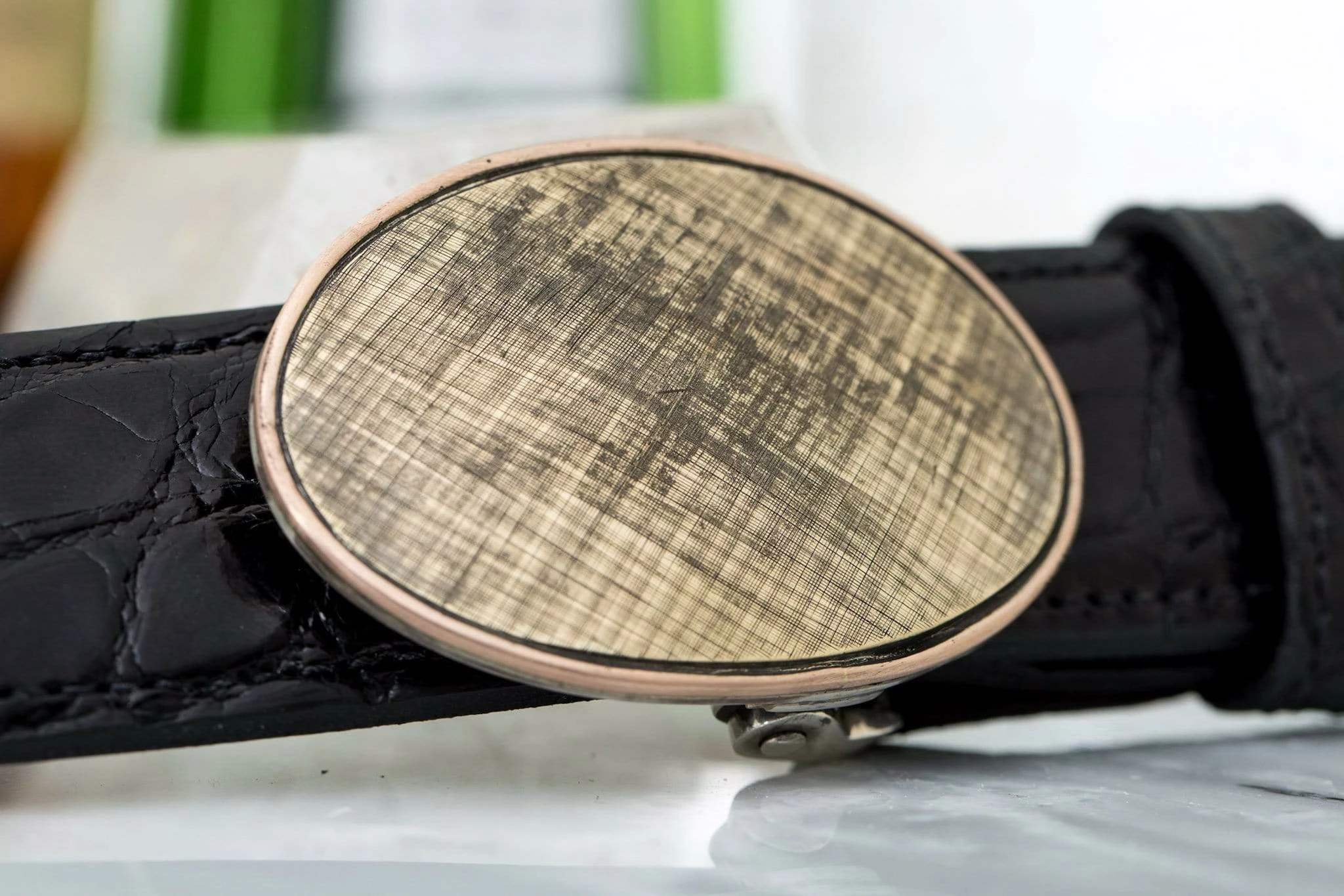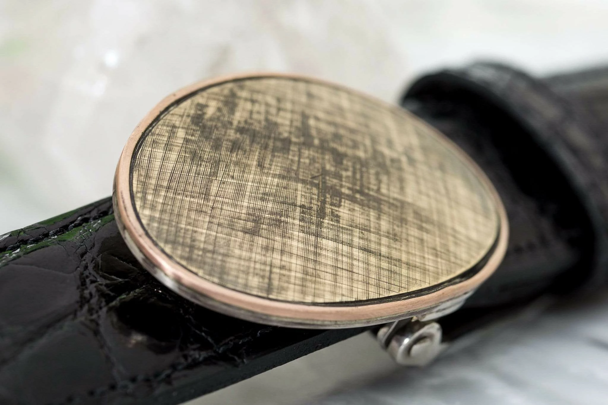 The Sentry buckle by Comstock Heritage features a Florentine engraved, hand-vintaged and antiqued 14k gold face bordered by 14k rose gold wire, built upon a sterling silver base. Handmade to fit all 30mm belts.