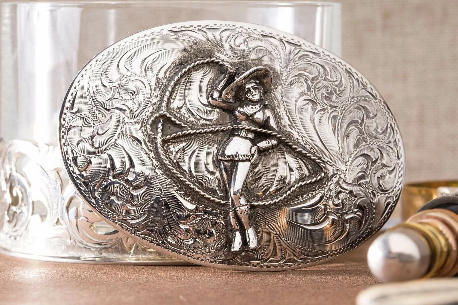1.5 inch hand engraved sterling silver trophy buckle with a rodeo gal overlay figure. Measures 3 1/4″ x 2 1/2″.