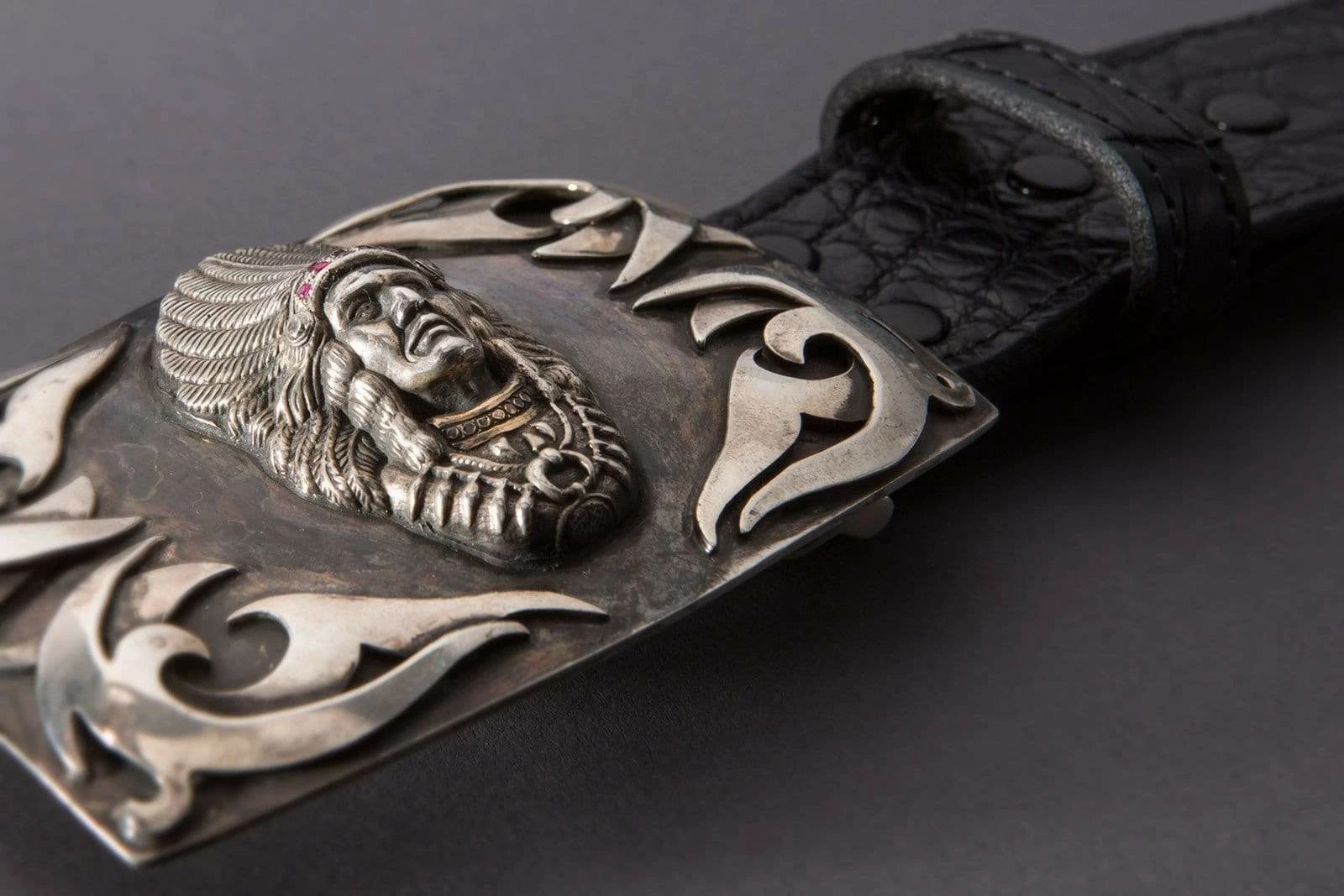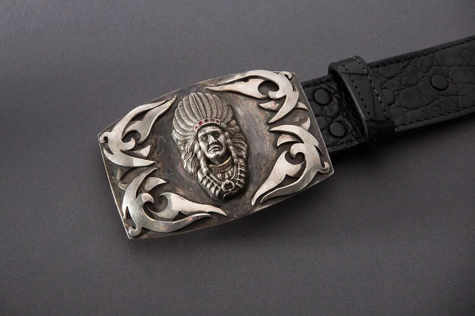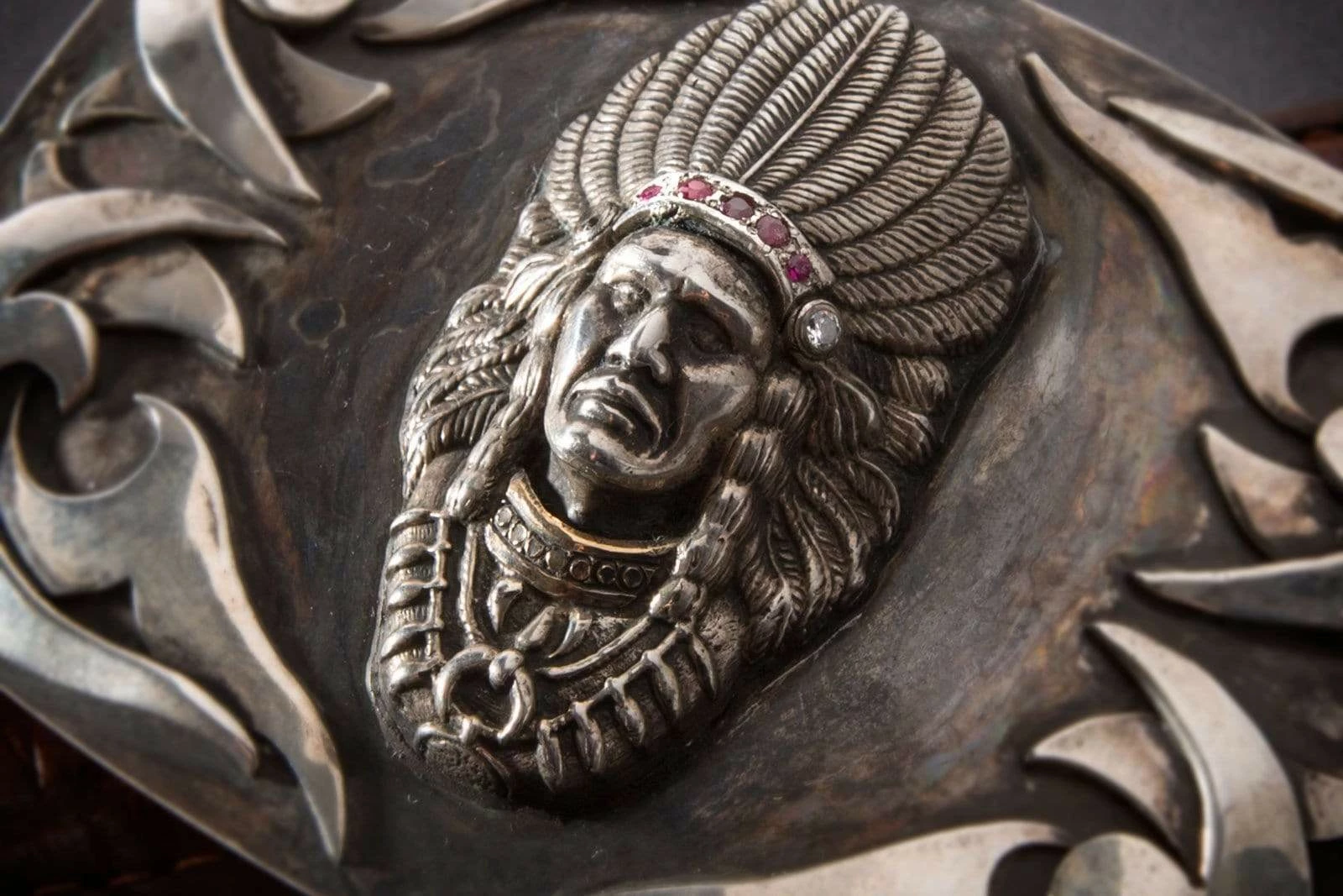The design on this buckle is a portrait of a Ute chieftain with a necklace made of sterlign silver and a headdress studded with rubies and diamonds. On the border are tribal overlays. The craftsmen at Comstock Heritage have taken such care with the engraving that every detail shows: the feathers on the headdress, the expression on the chief’s face. Fits all 1.5-inch belt straps.,