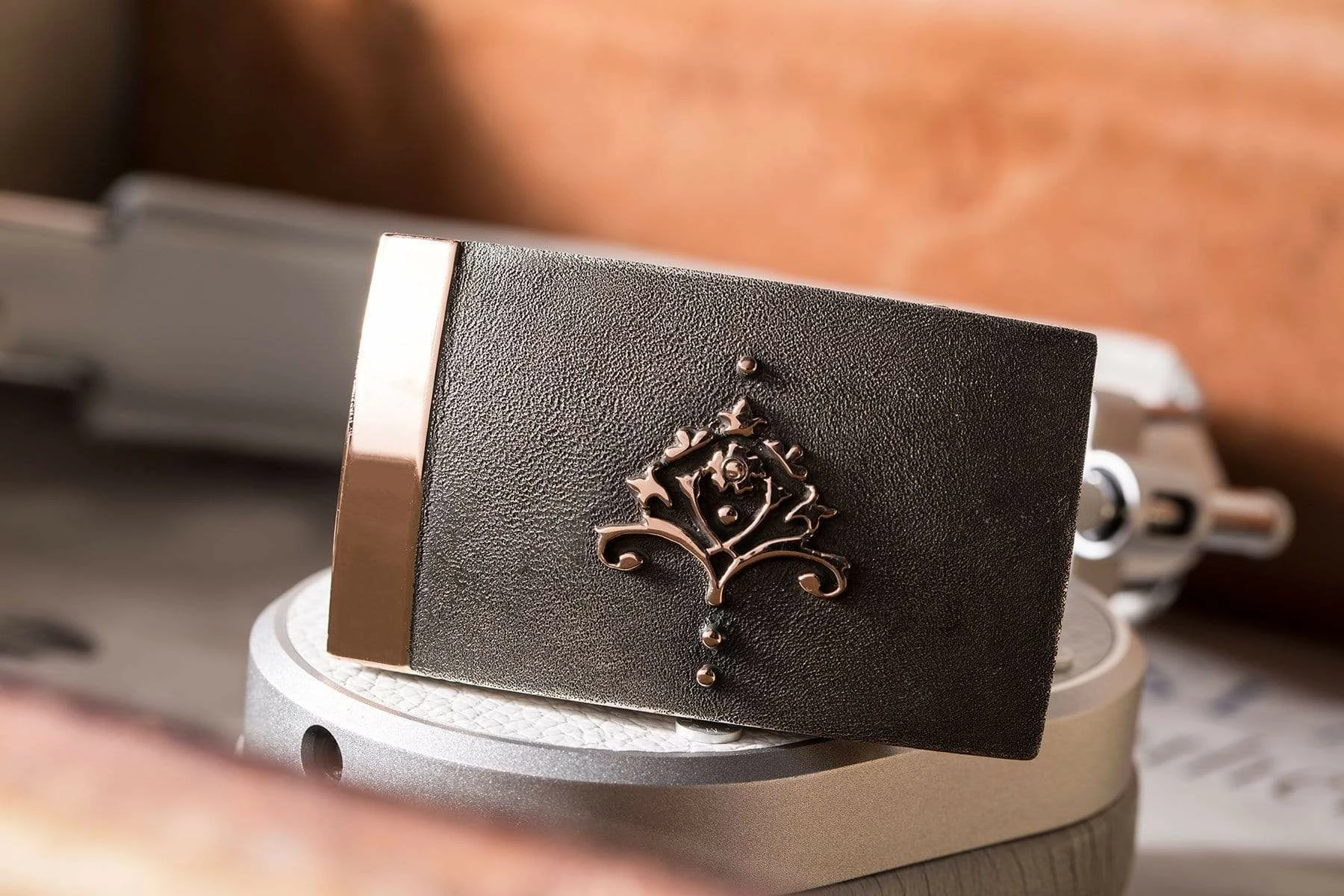This buckle is closely related to the Halogen W E Yellow 14K FDL. It still has the same fleur-de-lys logo in the center of the darkened face, the same asymmetrical design with a band on the left side, and the same materials of sterling silver base and fourteen-karat gold for the details. The only difference is the long edges of the rectangular face are straight instead of bowed. This design feature makes the buckle slightly smaller and sleeker, matching more closely the dimensions of the belt strap. Fits all 1.25-inch belt straps.