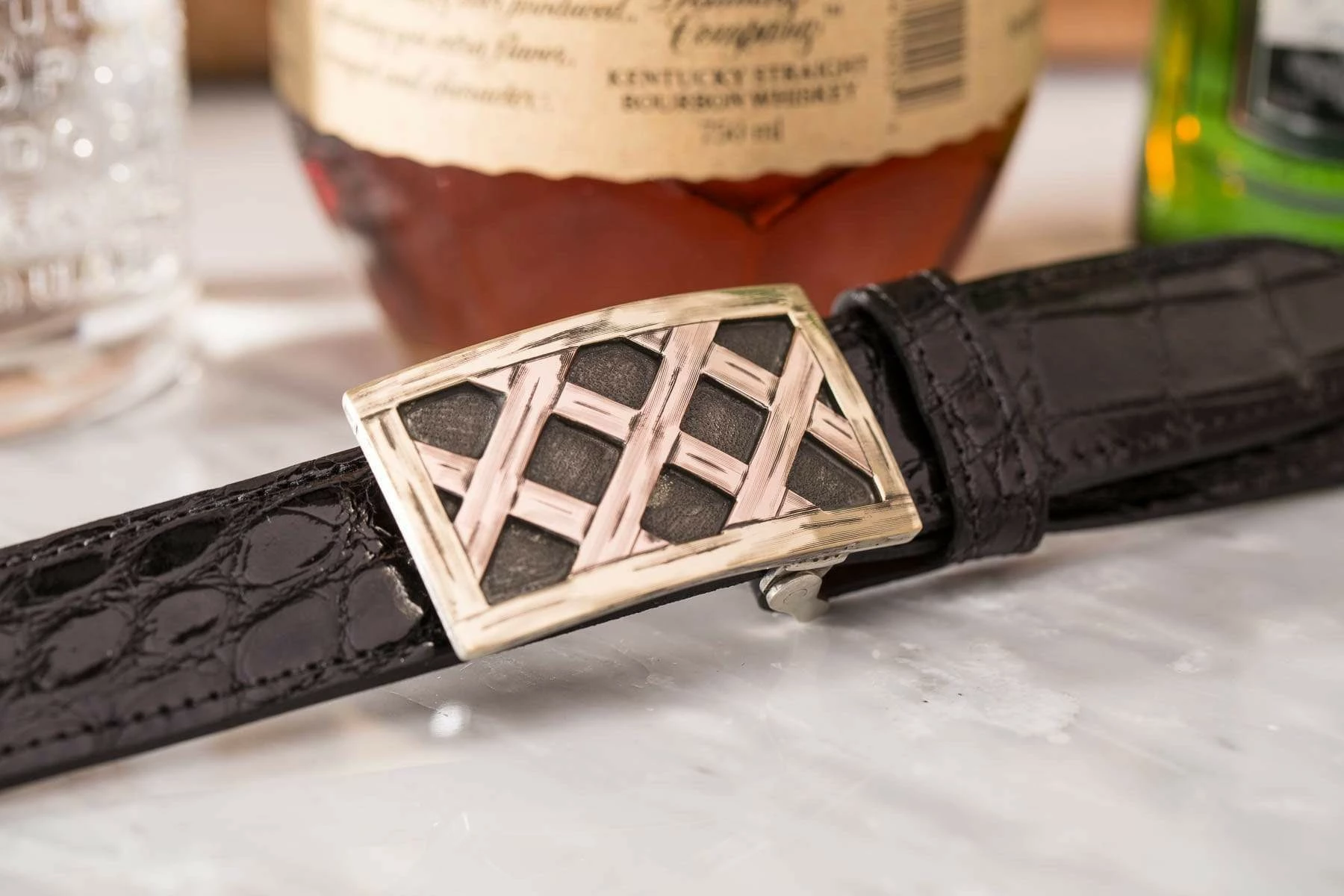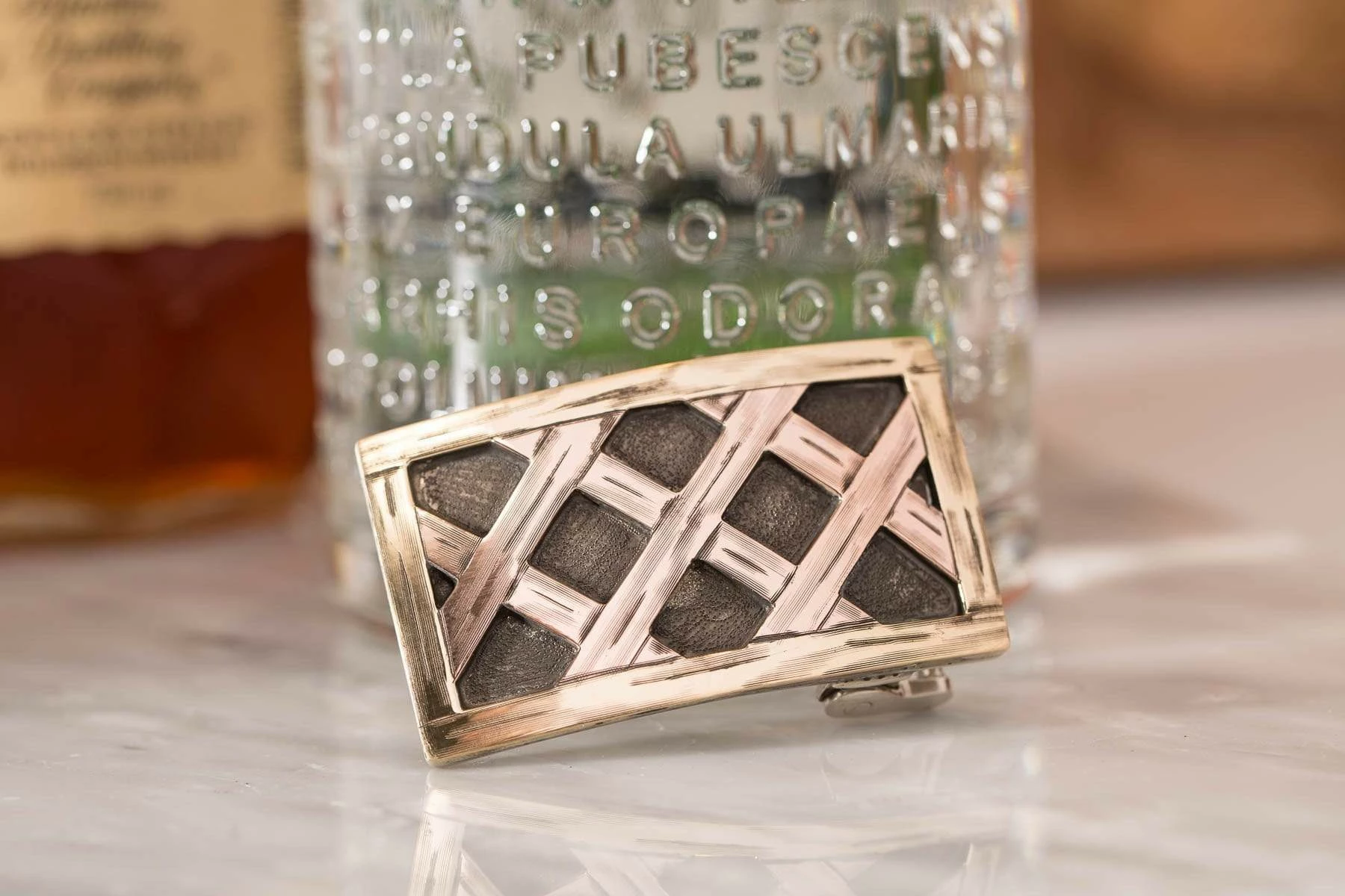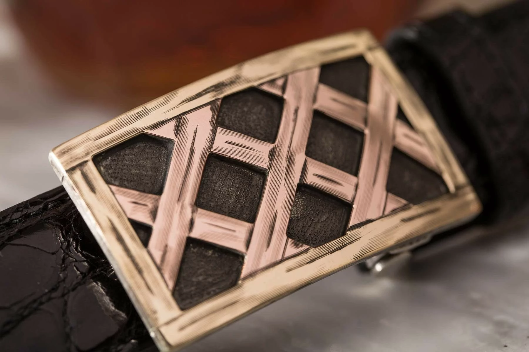 The Tyson Log Cabin D Buckle is made from 14k rose gold and 14k yellow gold on a solid sterling silver base. The first thing you’ll notice about this buckle is its satisfying heft, which comes from the solid chunk of hand-wrought sterling silver that serves as its foundation. That weightiness is an appropriate complement to the quiet strength of the geometric “builder’s pattern” design. A heavy dose of hand engraving deepens and matures the look of the thick yellow gold border and rose gold center structure, while their bold color sets off nicely against the darkened sterling silver background.