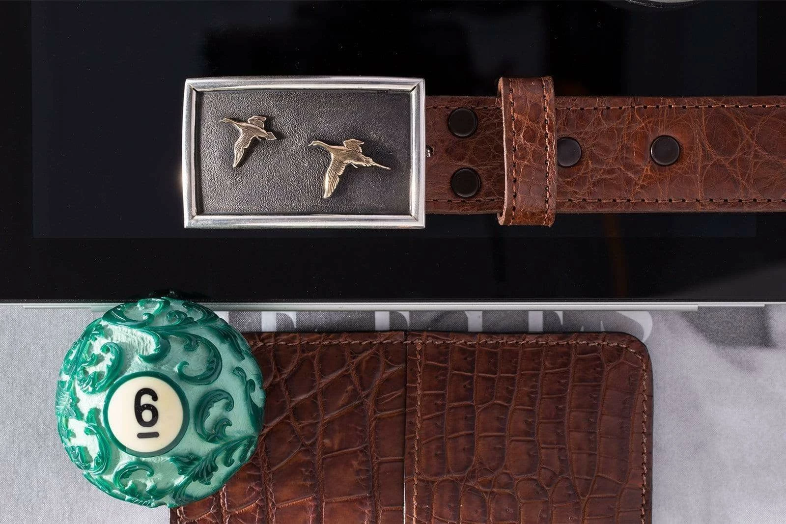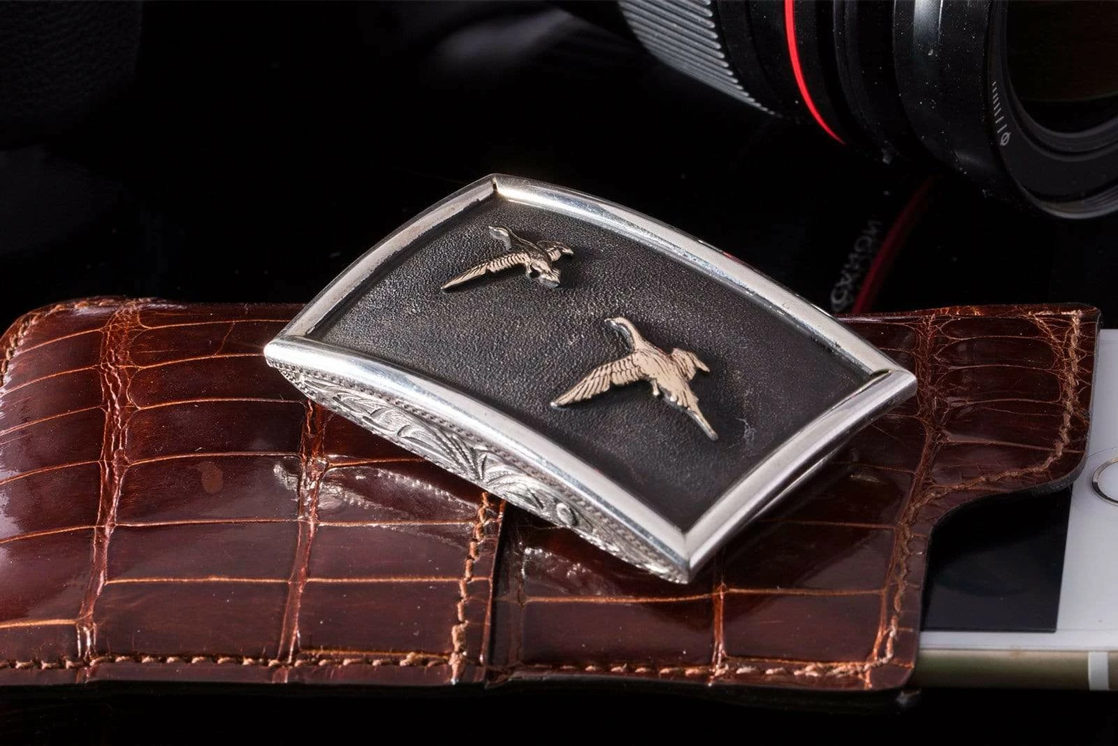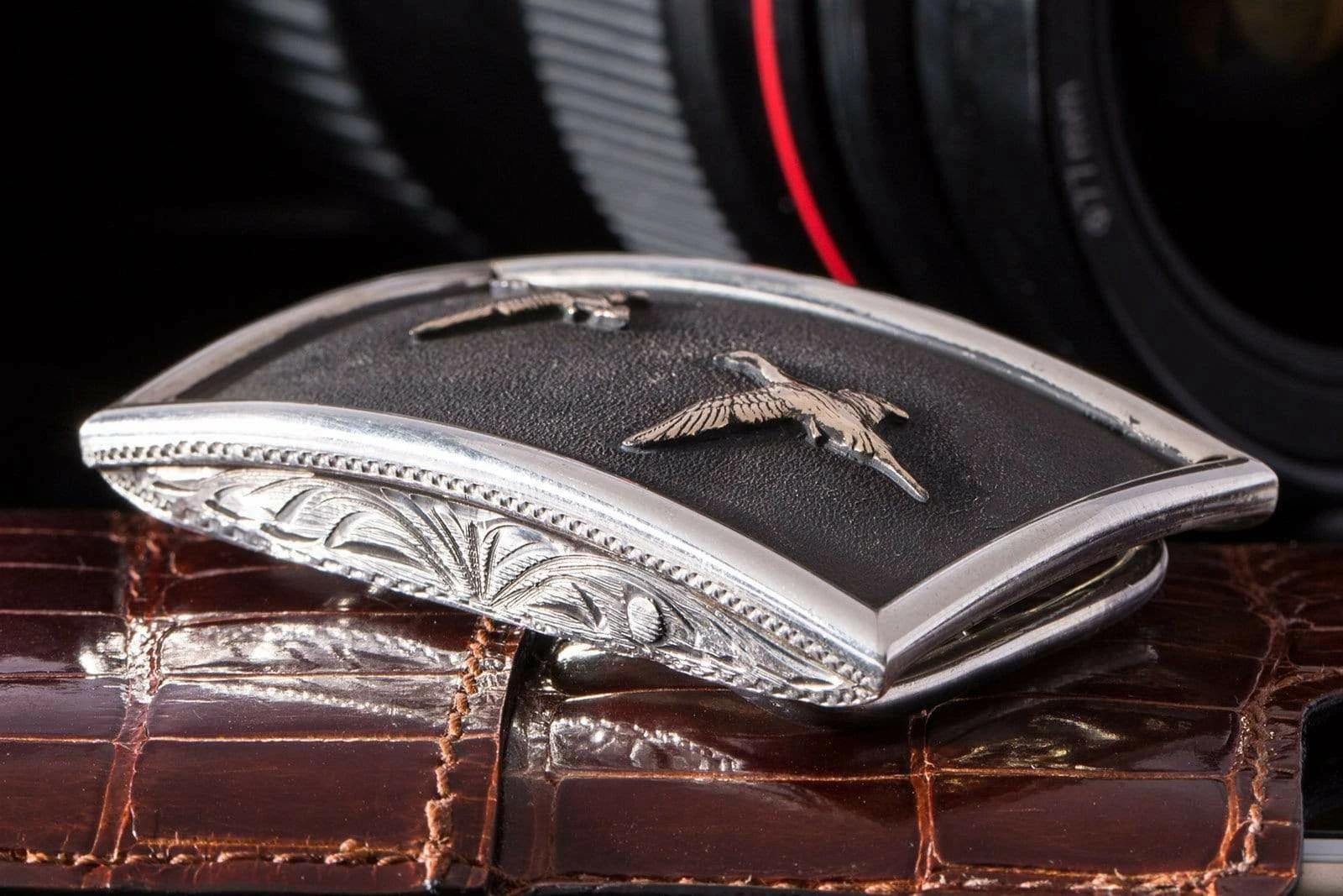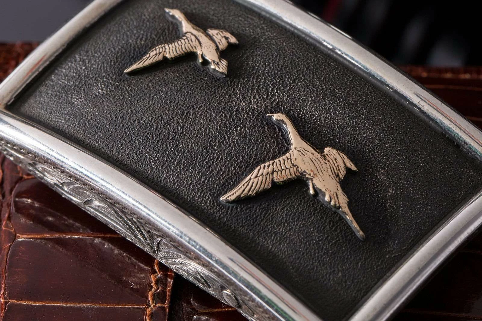 In another tribute to this famous waterfowl, Comstock Heritage has created the Tyson Matte Ducks buckle. Flying across a darkened, sterling silver face is a pair of fourteen-karat gold ducks. The convex shape of the face creates depth and makes the ducks seem like they are in motion. It also provides the silversmiths additional surfaces on the top and bottom platforms, which they have used to place hand-engraved scrollwork. To finish the piece, they have placed thick, half-round silver wire along the edges. This is a clever bit of smithery, making the piece look like mounted ducks in a frame. Fits all 1.25-inch belt straps.