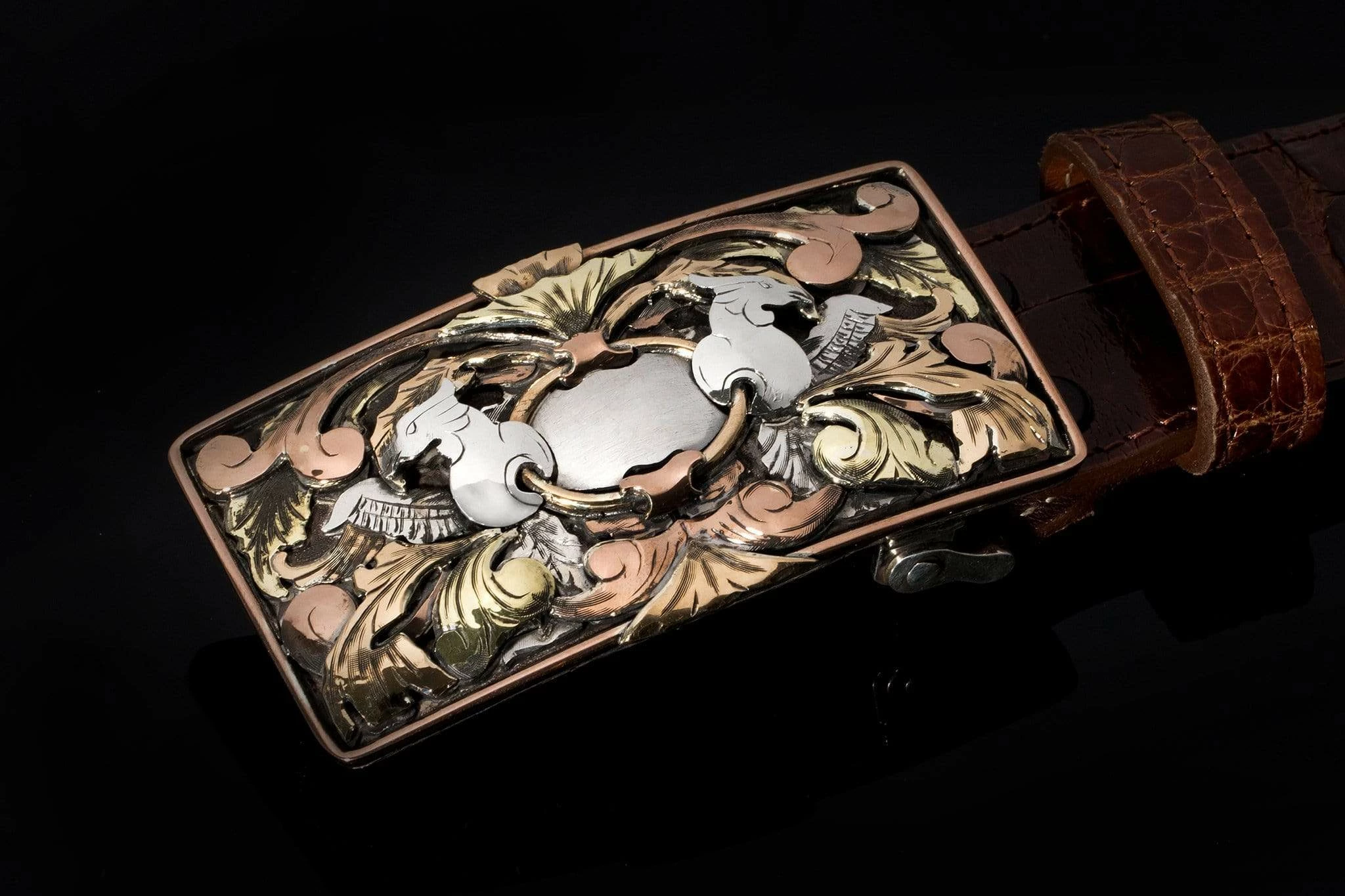 Comstock Heritage Phoenix. 1.5 inch trophy buckle. HAND MADE OVER AND UNDER FILIGREED MULTI LEVEL BUCKLE. WITH 14K GREEN AND YELLOW GOLDS, 18K RED GOLD ROUND WIRE EDGE AND OVERLAYS, FINISHED WITH PLATINUM PHOENIX ON EITHER SIDE. ALSO FEATURING AND 18K YELLOW GOLD ROUND WIRE CENTER OVAL SURROUNDING A STERLING SILVER SHIELD FOR CONTRAST. PAINSTAKINGLY HAND ENGRAVED FRONT AND BACK.