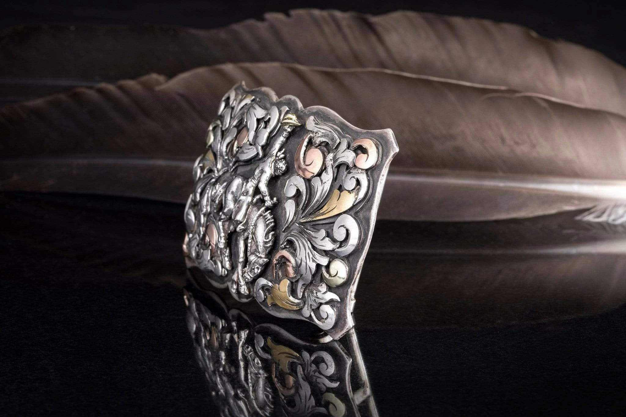 - Floral scrolls made from sterling silver and both yellow and rose gold