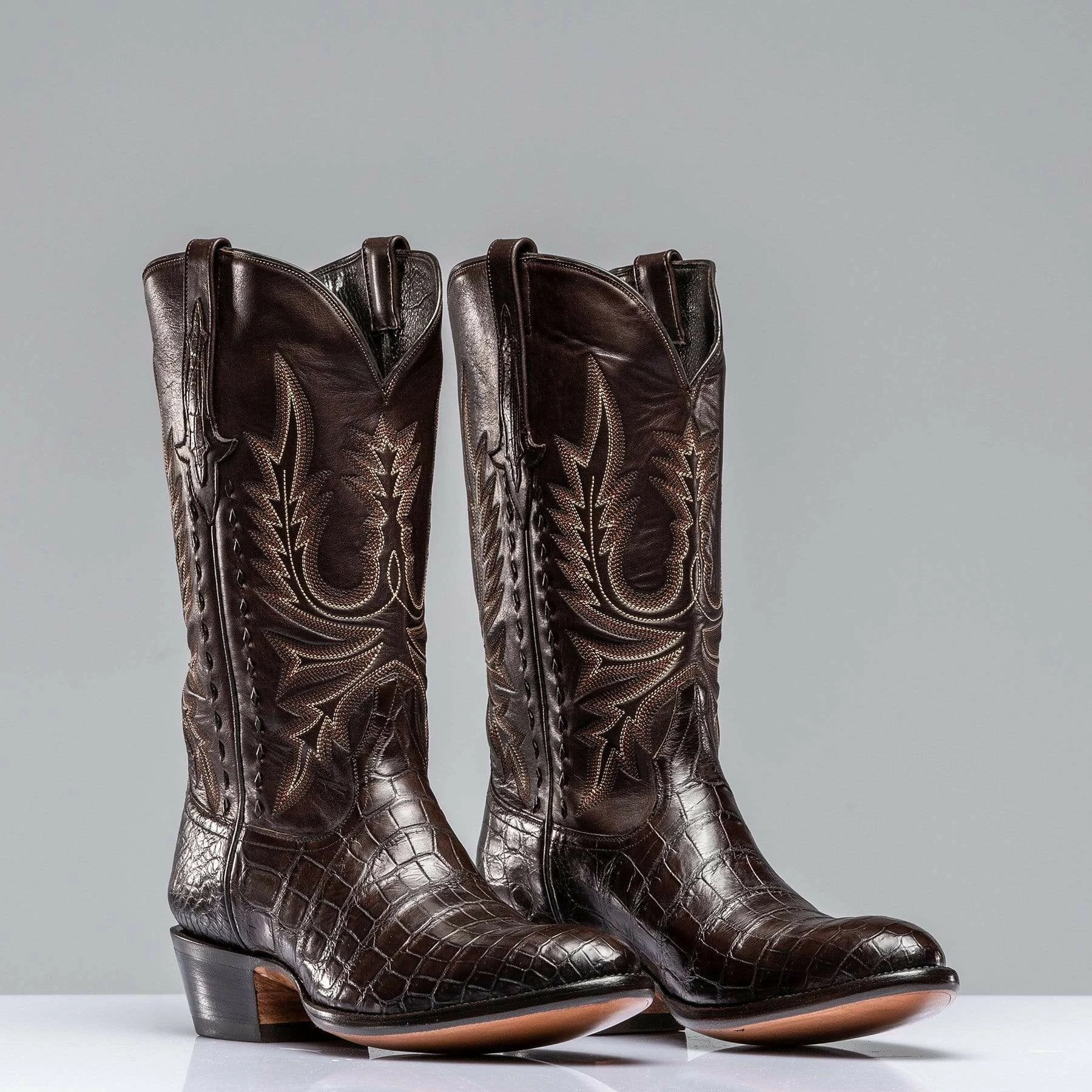 Nile crocodile boot with vintage calfskin shaft. Impressive tonal flame stitch pattern done by hand, buck lacing along side seams, plus crocodile accents on pulls. Each pair is handmade by artisans from Stallion Boot Company of El Paso, Texas with 30 or more years of experience.