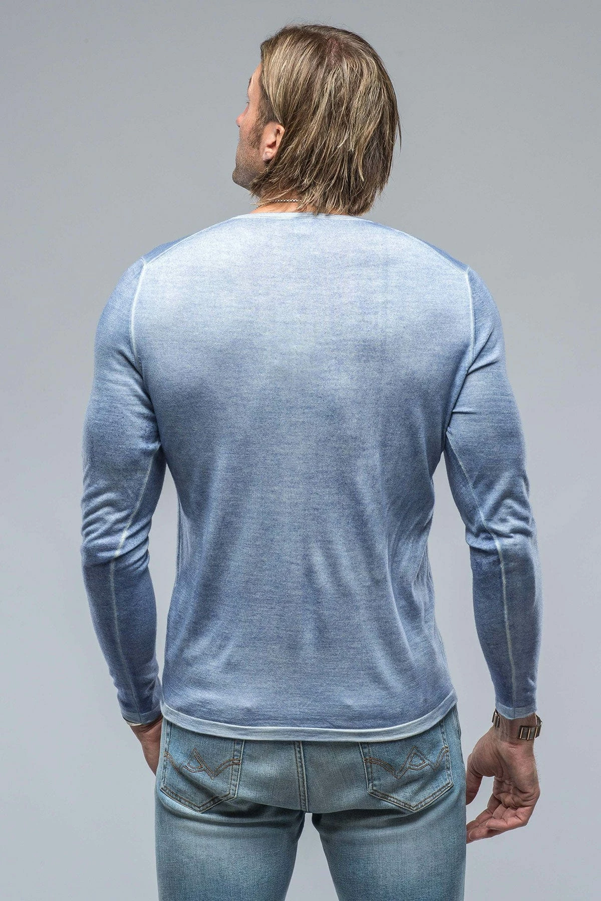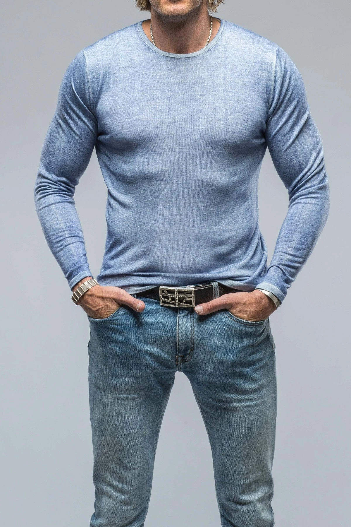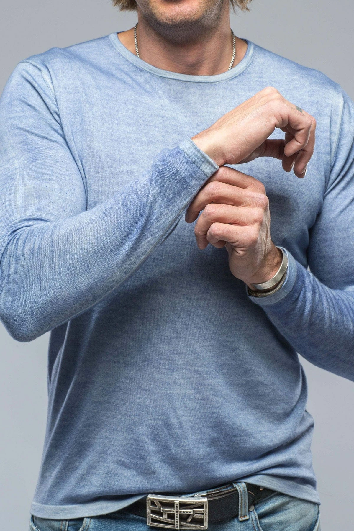 Lightweight 16 gauge cashmere knit starts its journey as a solid steel grey hue, then is artfully overdyed with a blue dye color treatment. The resulting effect is a heathered melange of icy grey and lavender blue.