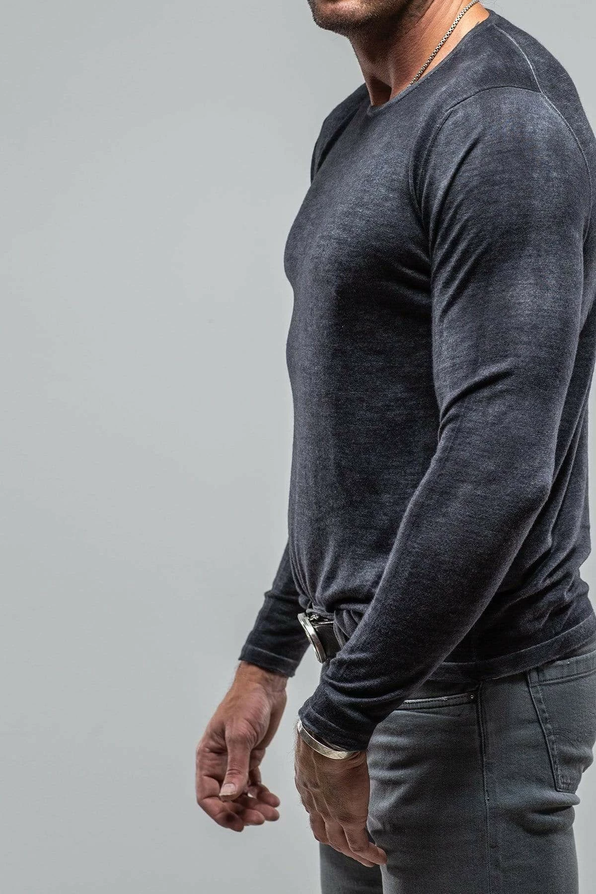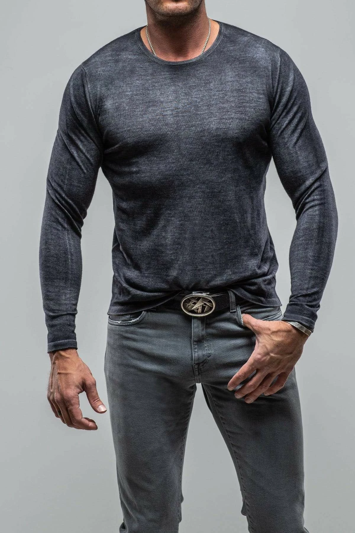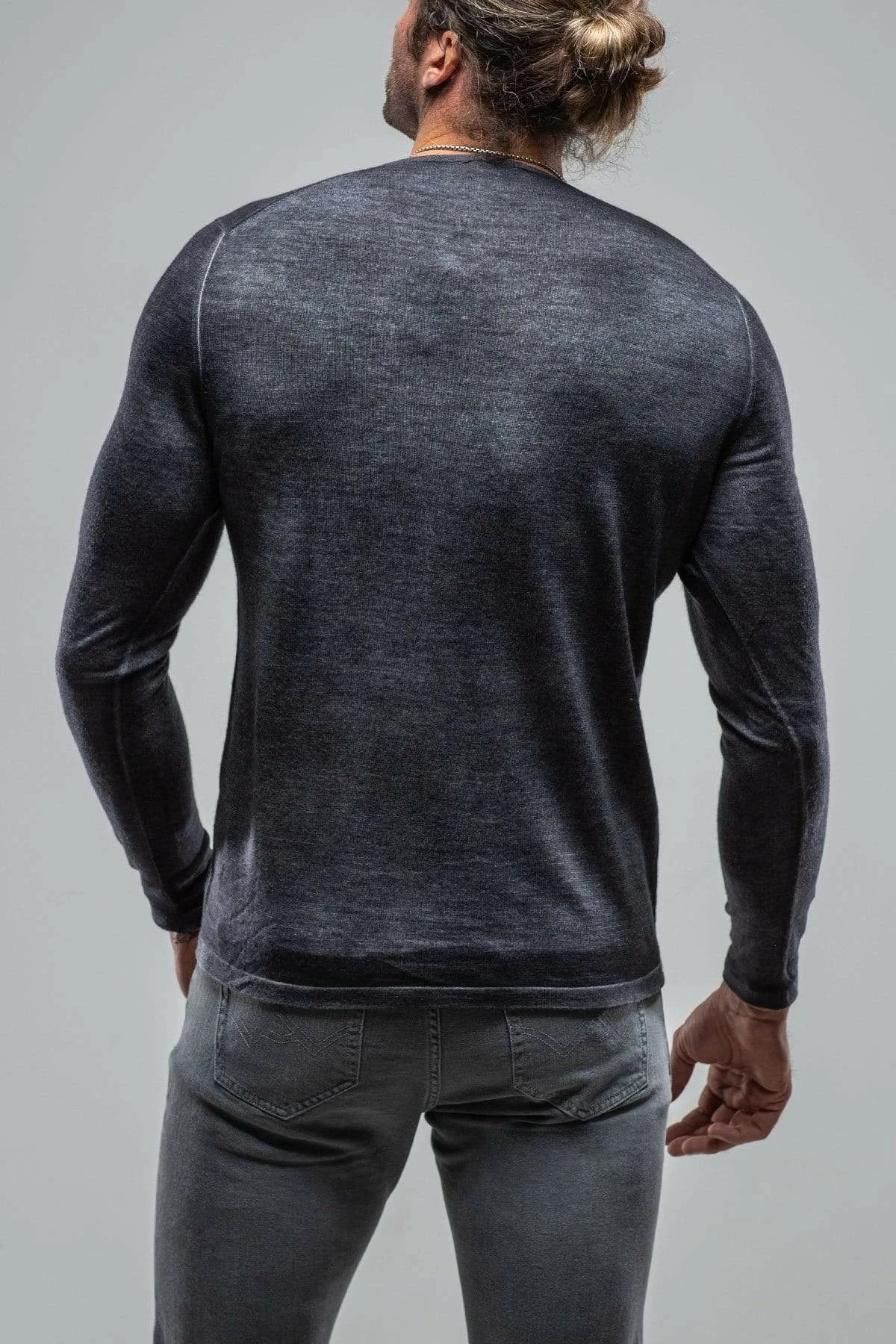 Lightweight 16 gauge cashmere knit starts its journey as a solid steel grey hue, then is artfully overdyed with a black dye color treatment. The resulting effect is a heathered melange of icy grey and dark charcoal.