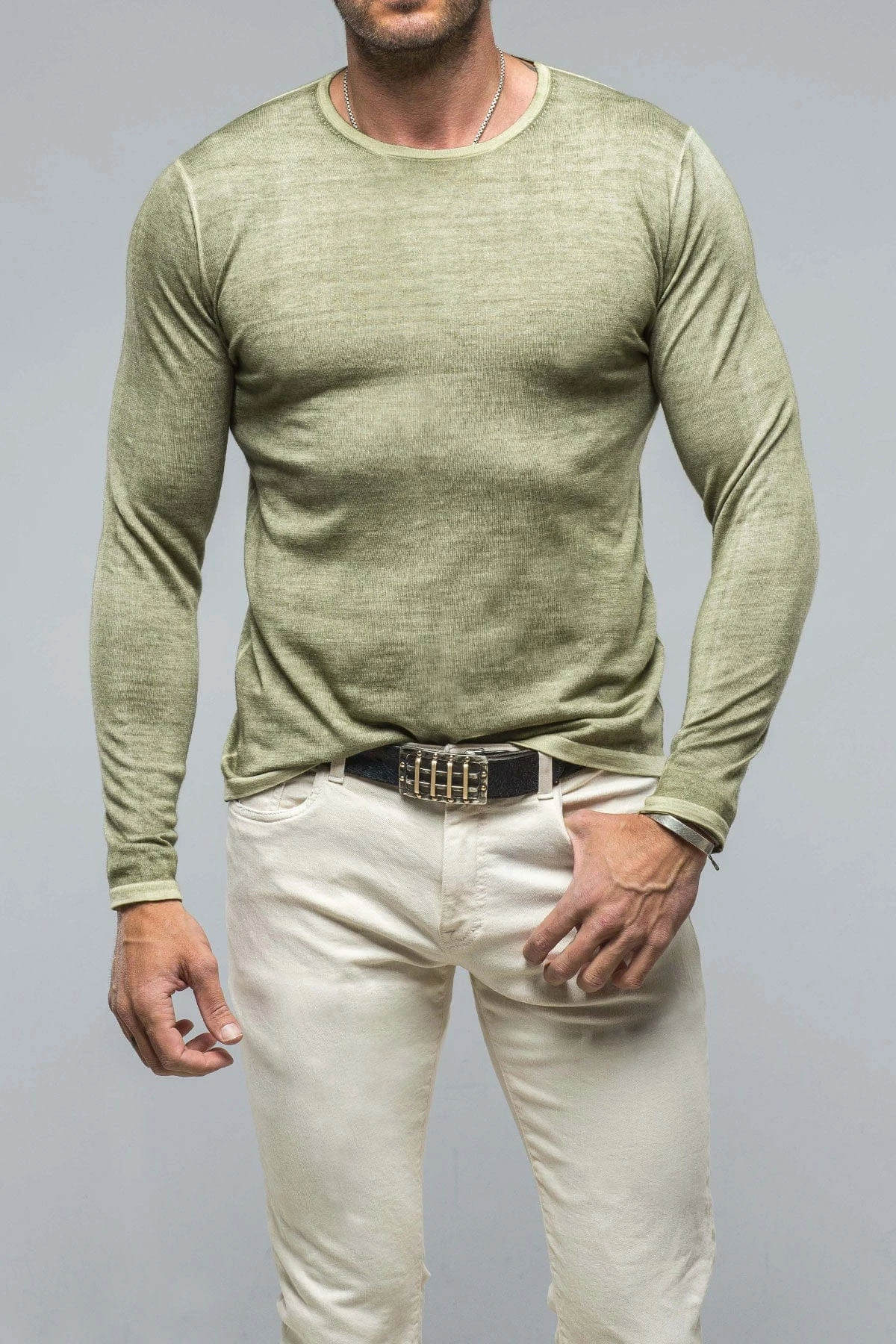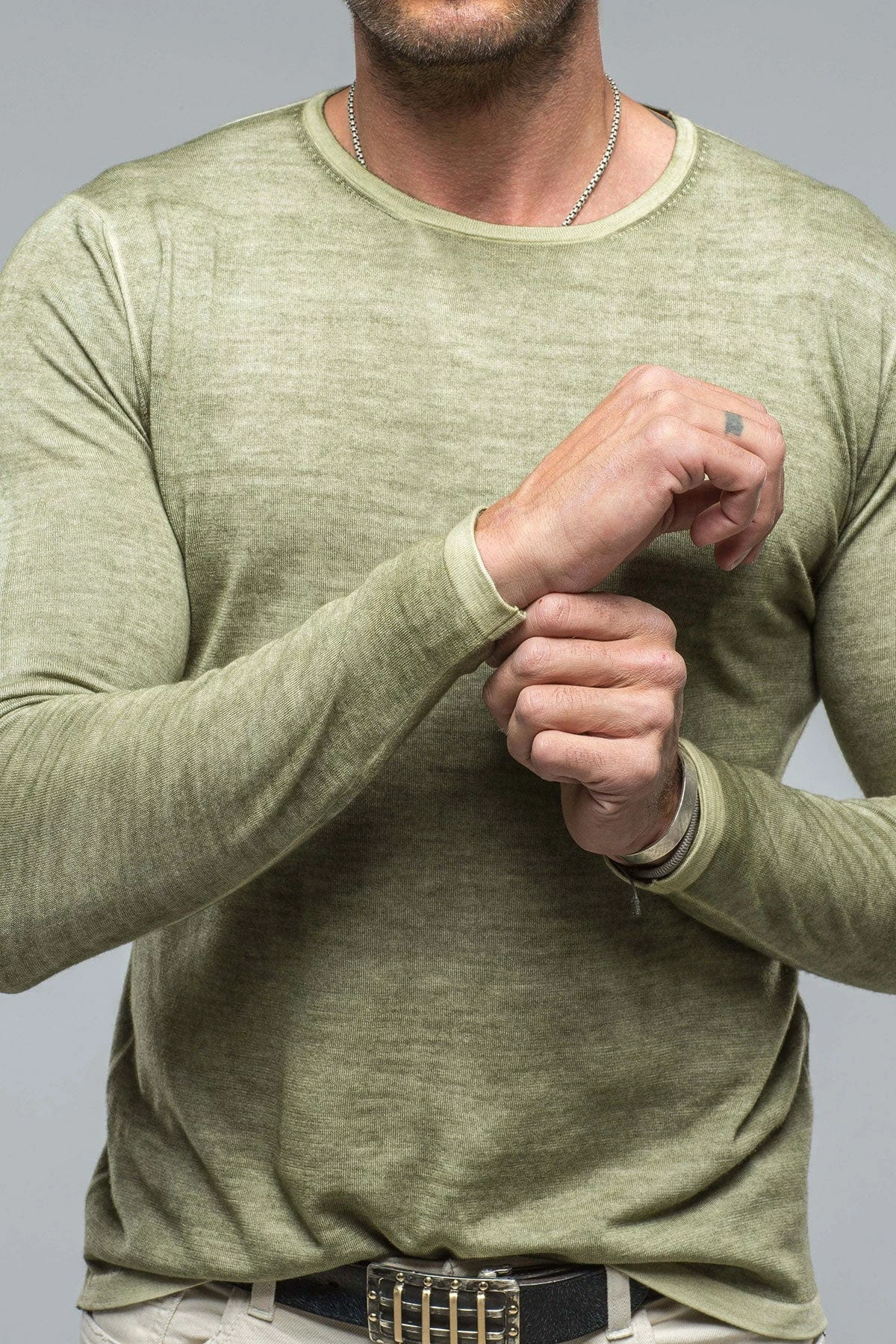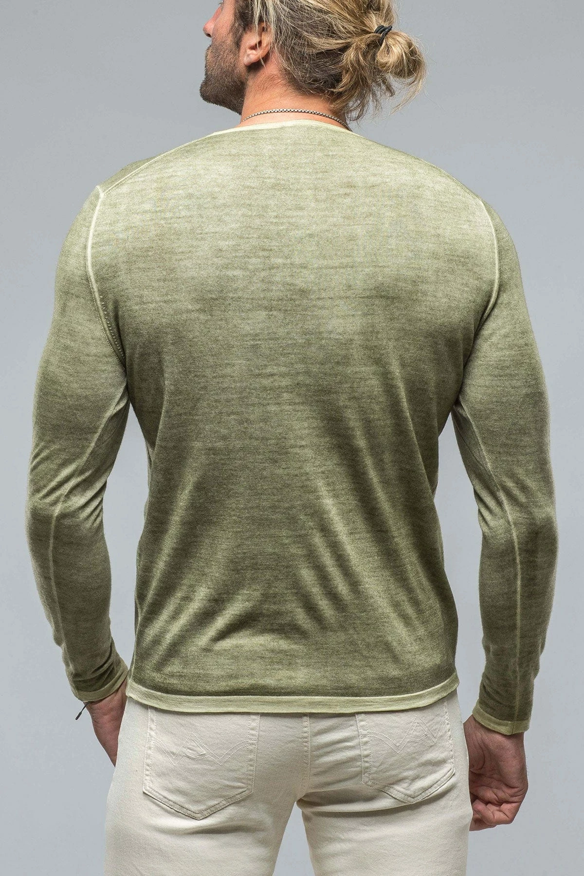 Lightweight 16 gauge cashmere knit starts its journey as a solid steel grey hue, then is artfully overdyed with an olive green color treatment. The resulting effect is a heathered melange of icy grey and rich green.