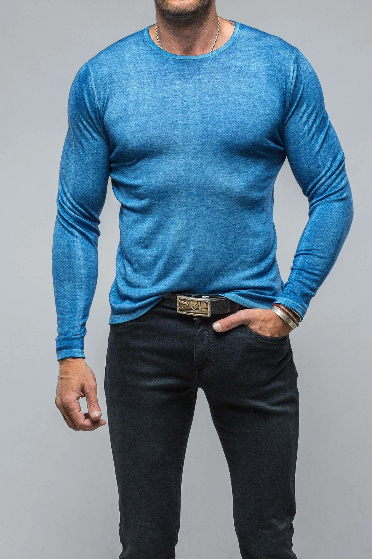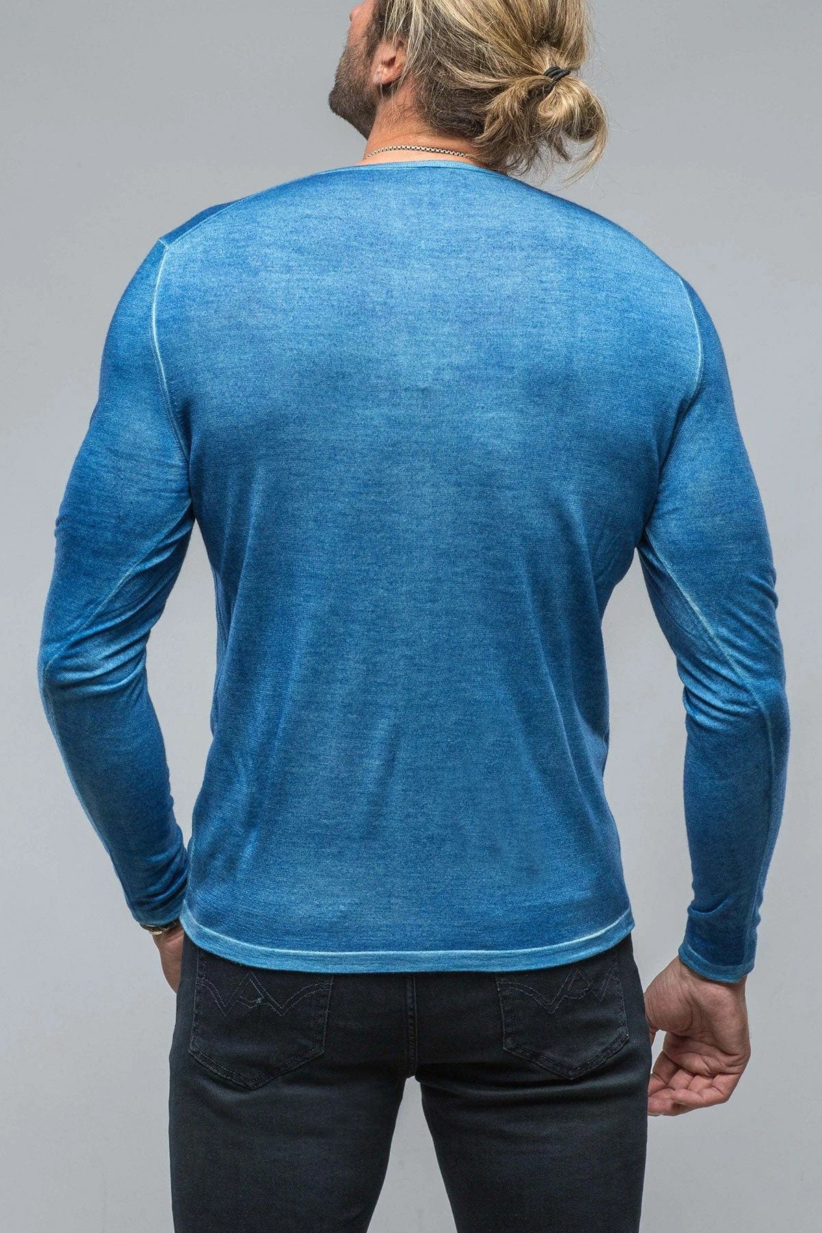 Lightweight 16 gauge cashmere knit starts its journey as a solid light grey hue, then is artfully overdyed with a royal blue dye color treatment. The resulting effect is a heathered melange of icy grey and vibrant blue.