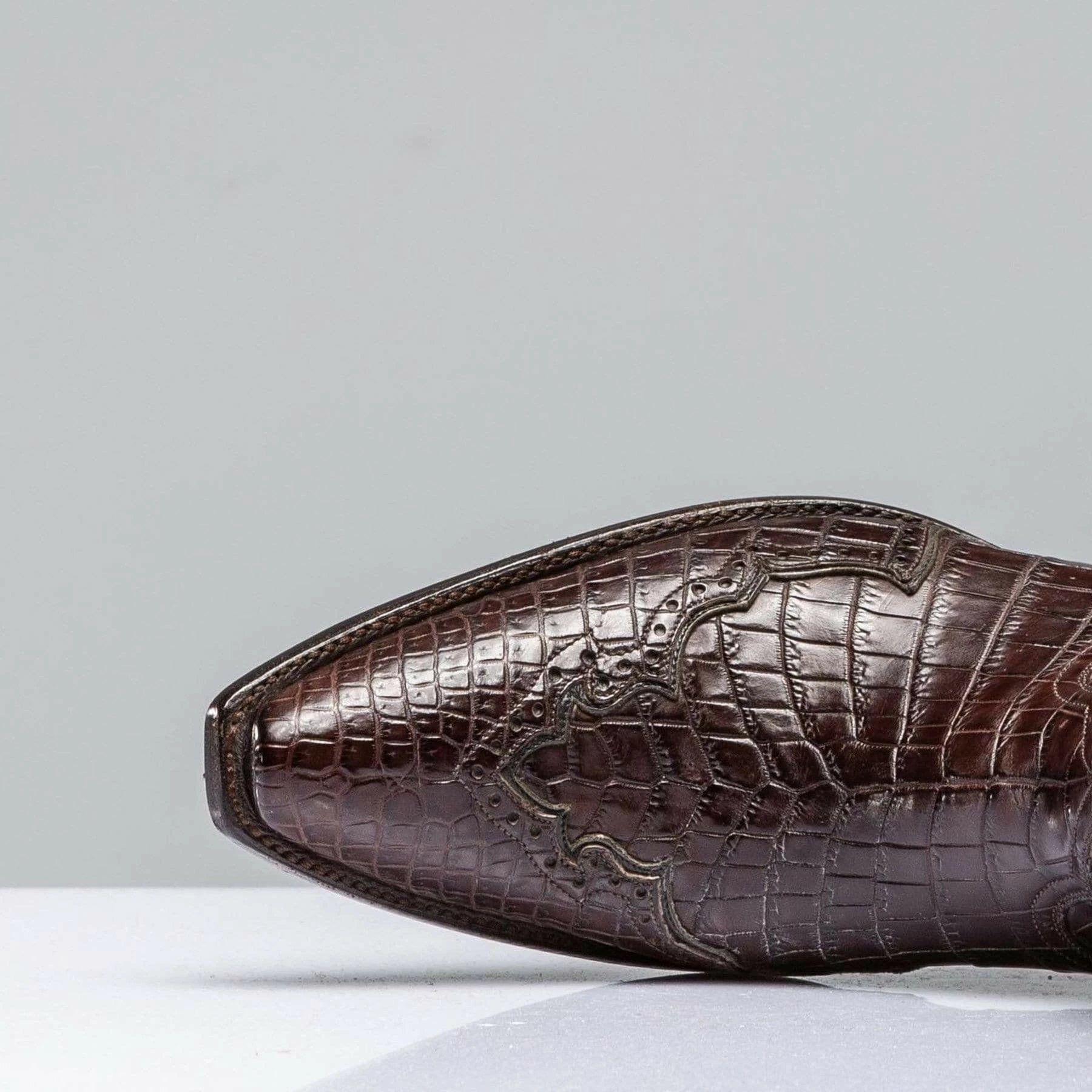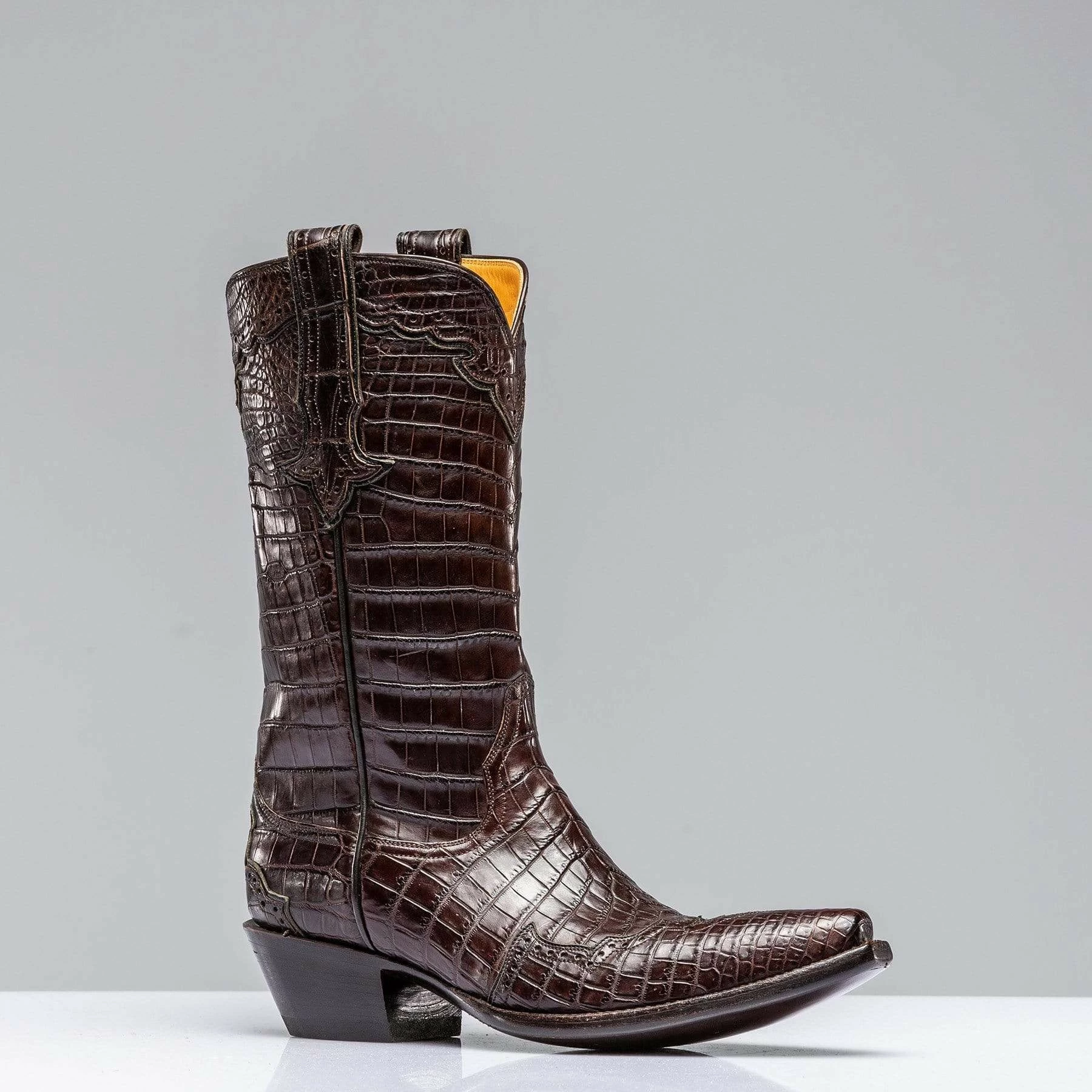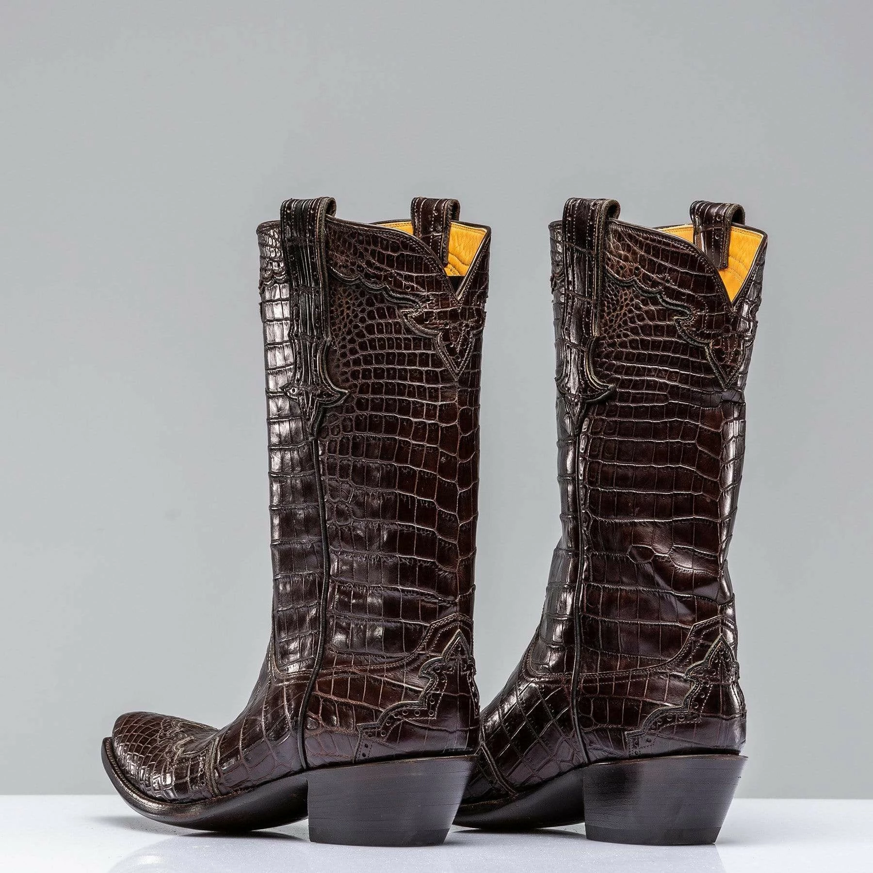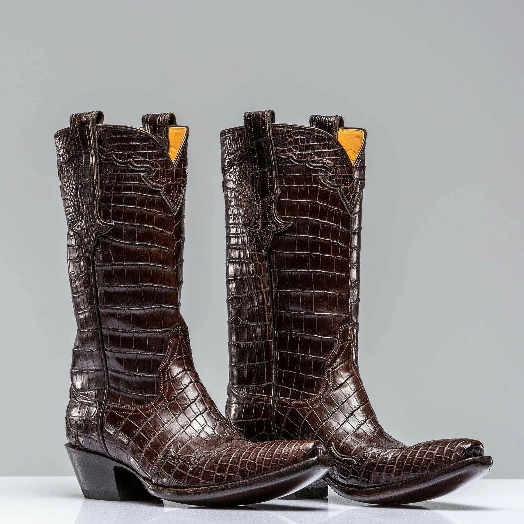 Done here in Hermes-quality crocodile leather, the design is what we call “Majestic”. A distinctive cowboy boot style typified by a scalloped wingtip and heel counter with double-layer crocodile leather for durability (and a little visual impact). Scalloped collar and pulls also finished with the same. Each pair is handmade by artisans from Stallion Boot Company of El Paso, Texas with 30 or more years of experience. Each pair is handmade by artisans from Stallion Boot Company of El Paso, Texas with 30 or more years of experience.