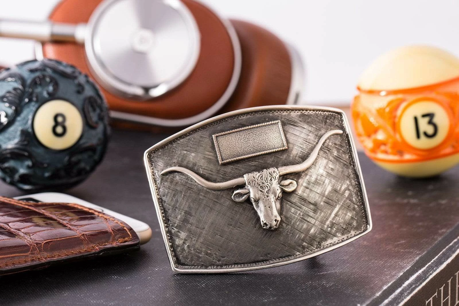 Returning to one of their favorite images, here the craftsmen of Comstock Heritage have come up with a simpler, more stoic design to frame the head of their longhorn cattle. The face has a Florentine finish and is bordered by a raised, heavy-gauge, sterling silver wire. Above the cattle head is a smaller rectangle with a dappled finish framed by a braided silver rope. The simple elegance of this design allows the iconic image of the longhorn to be the focal point, despite the detailed work surrounding it. Fits all 1.5-inch belt straps.