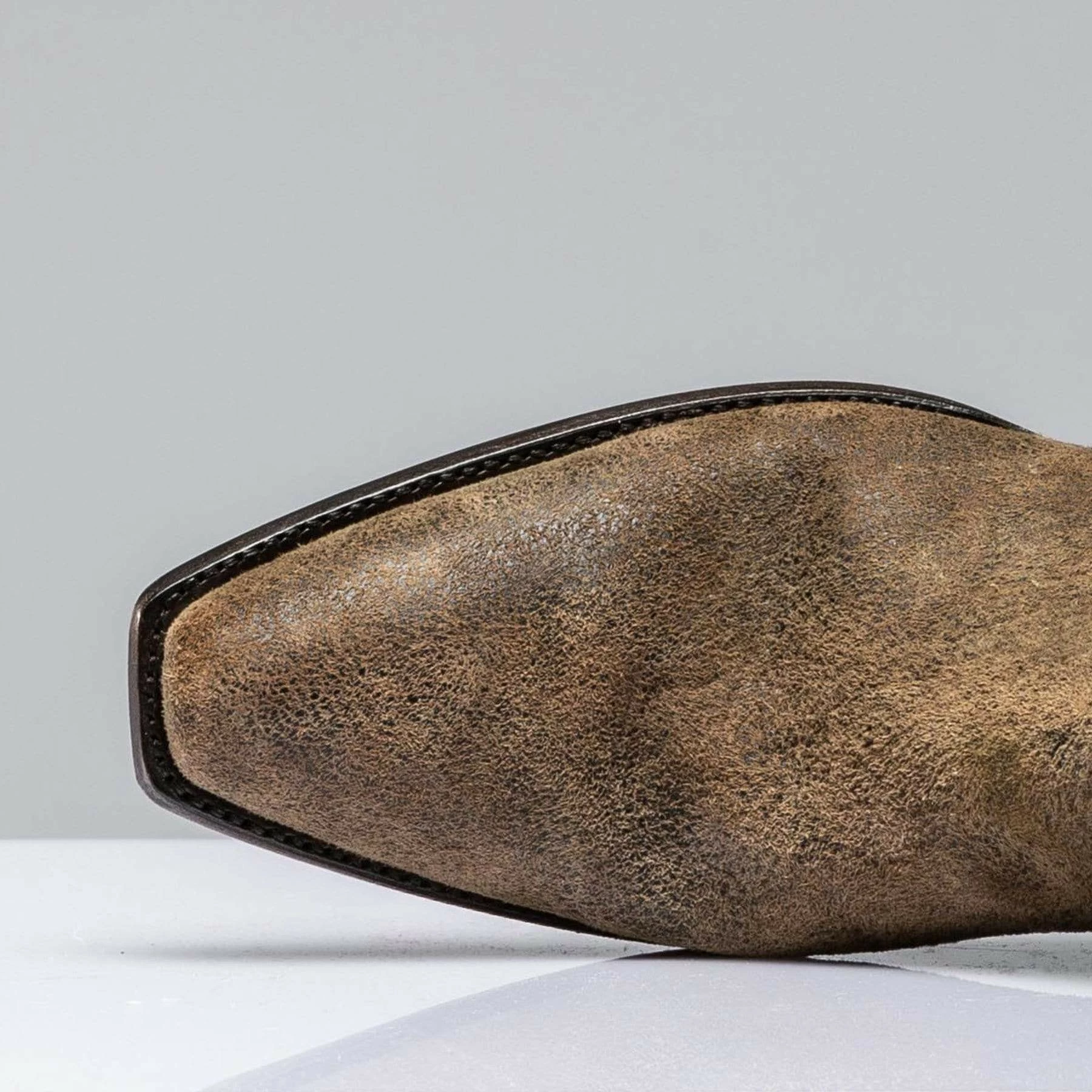 The Goat Suede Zorro in vintage camel combines elements of traditional Western design with broader Americana style concepts to create an original and accessible boot. The ‘vintage’ element is one of the coolest things about this boot—it gives the suede so much character and depth. Machines can’t achieve this level of intricacy in leather distressing, and most bootmakers aren’t willing to attempt it. Stallion’s master craftsmen do it entirely by hand, making each boot as unique as the set of hands that worked it. The easy on-and-off zipper (great for air travel) is incorporated into the seam and barely visible, while its leather tassel adds a roguish hint to the otherwise sleek profile.