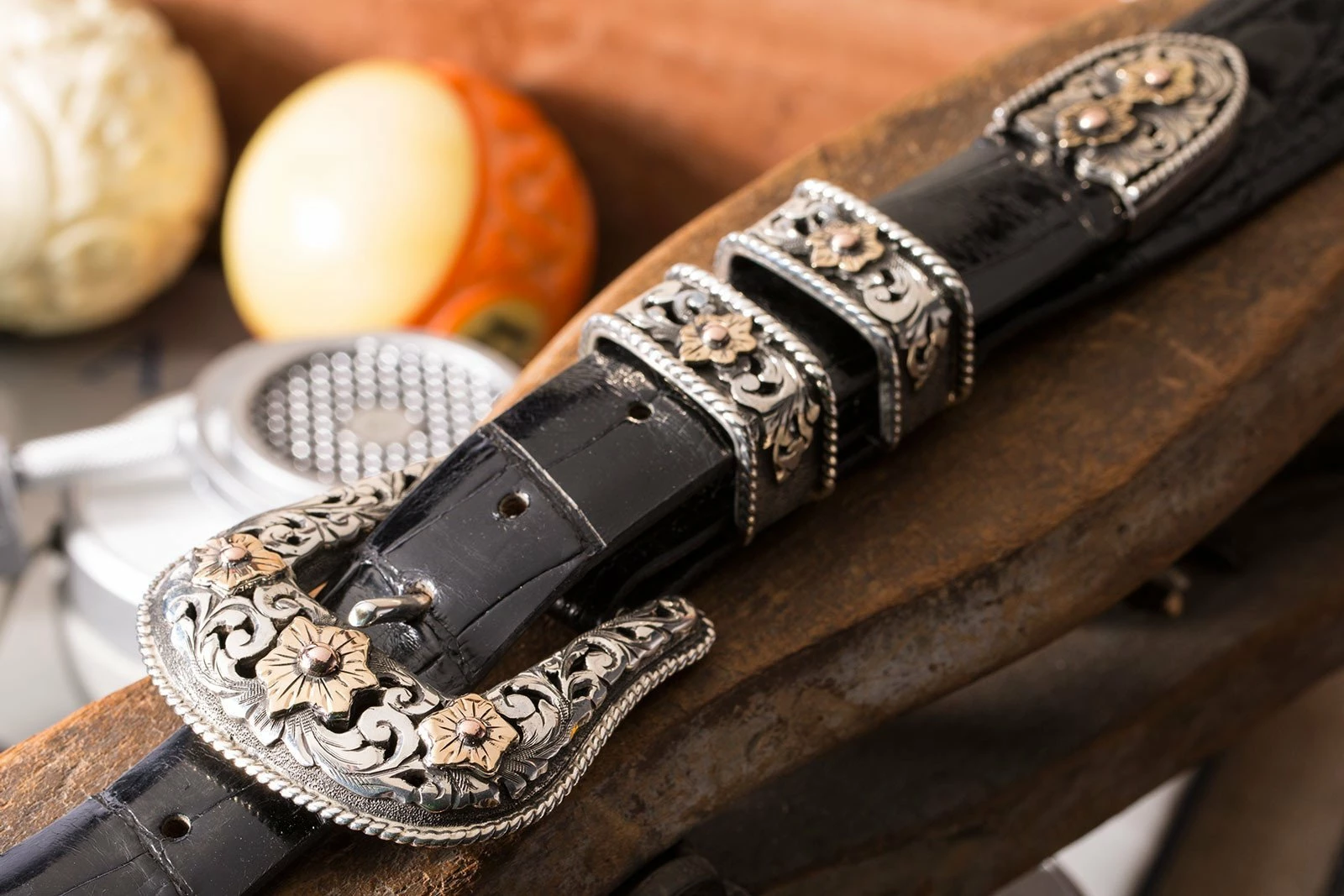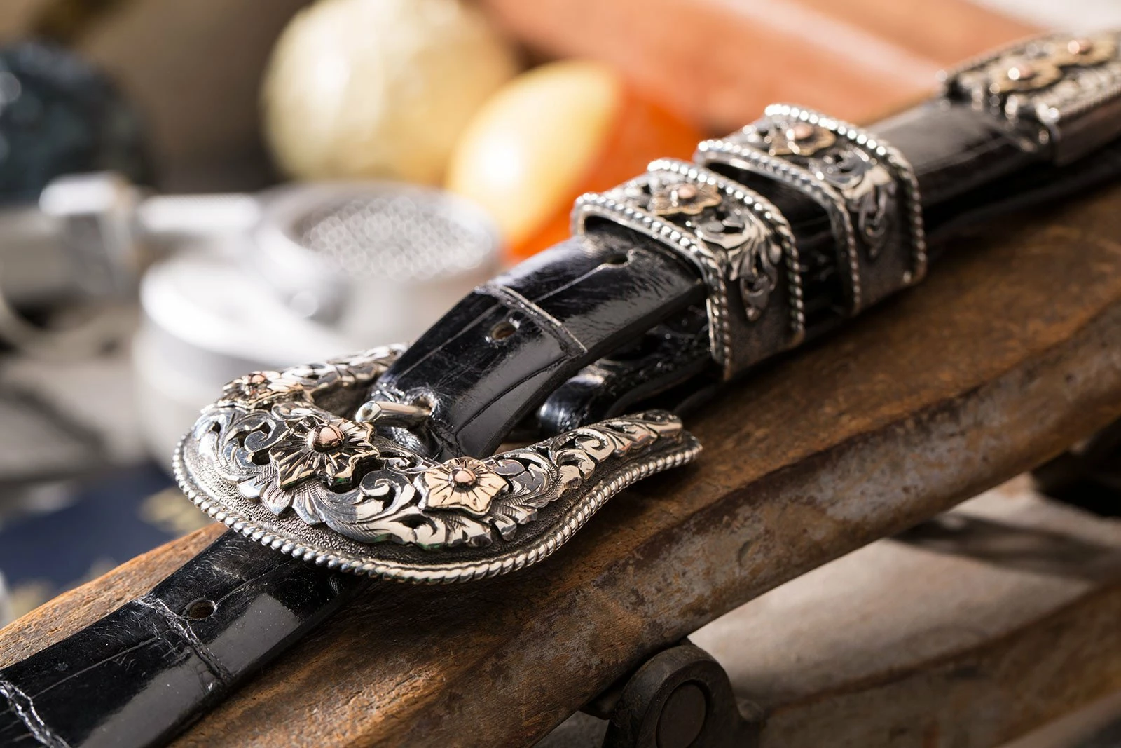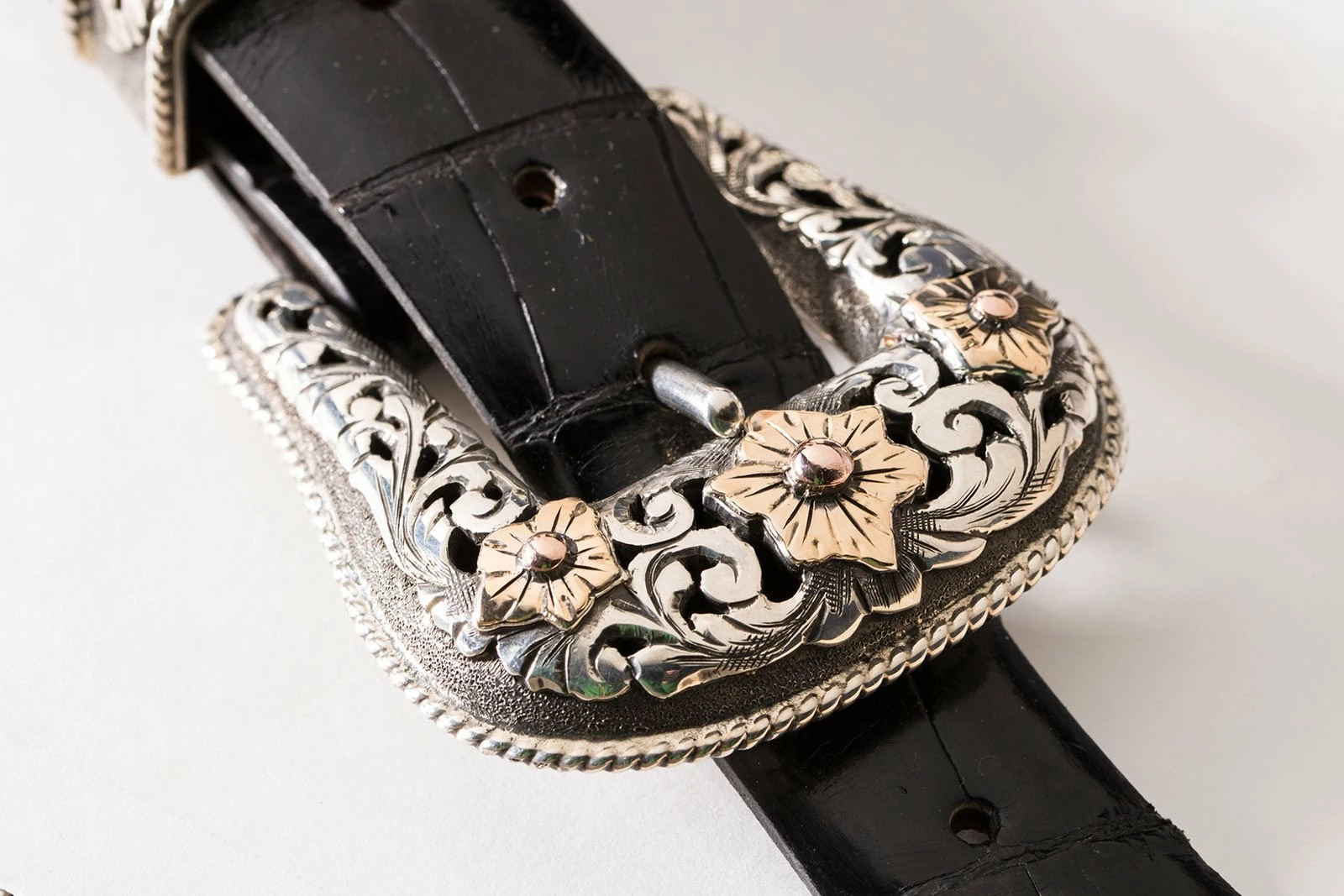 Only master silversmiths like those at Comstock Heritage could create such delicate detail with metals on this exquisite buckle set. Using a floral motif throughout each of the four pieces, they have used a variety of materials and techniques. Each piece is hand-engraved and made from silver filigree that is then overlain with fourteen-carat gold. The two keepers have one gold flower, the tip two, the buckle three. Underneath them all is finely engraved silver scrollwork. To finish things off, there is a fine, twisted silver “rope” along the borders of each design. You will not find finer silverwork anywhere. Fits all 1-inch belt straps.