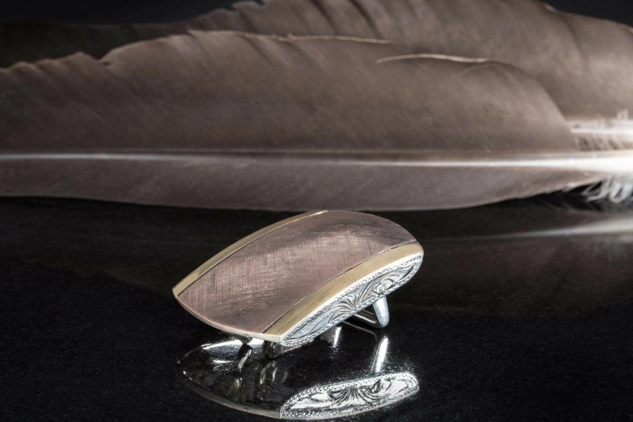 - 14K red gold center engraved with a crosshatch pattern