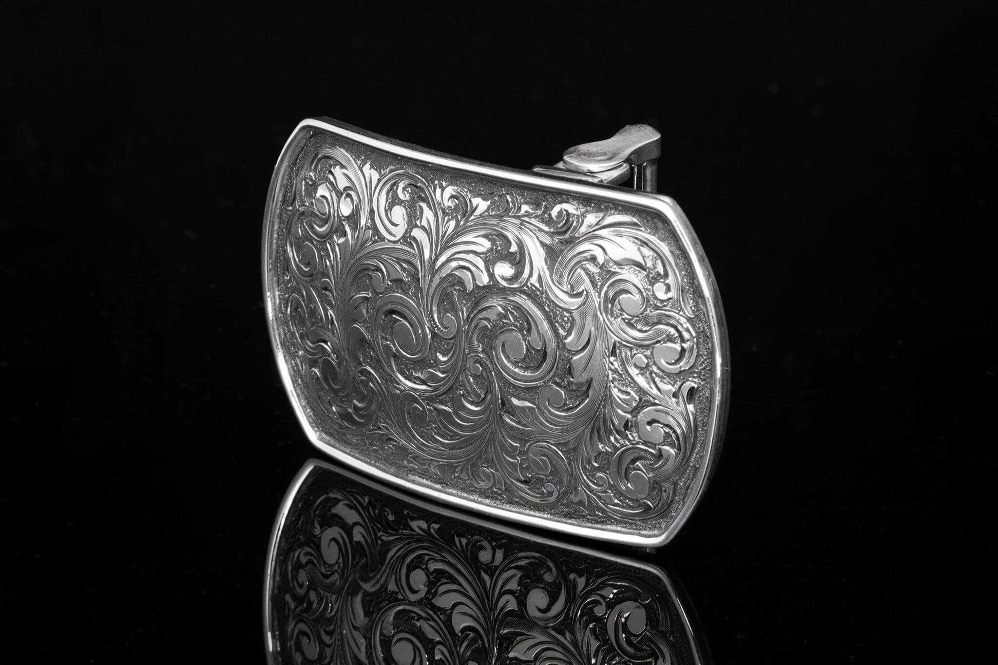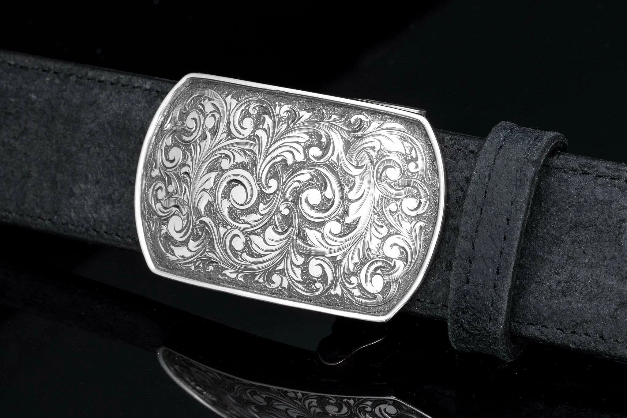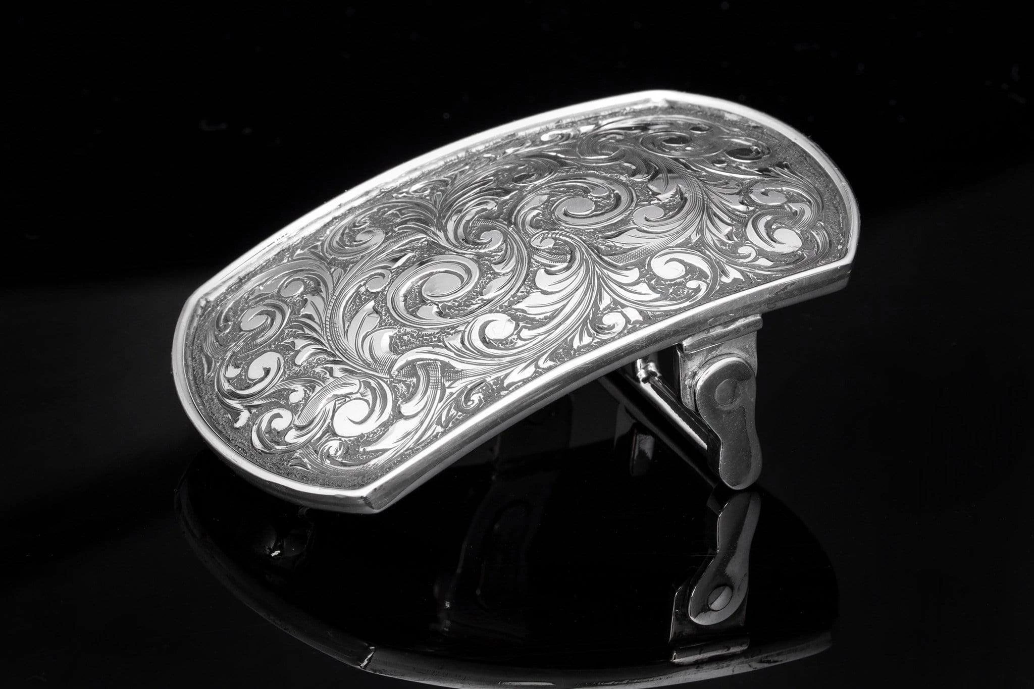 The Halogen Riley 1.5″ is a Sterling silver medium size “Halogen” shape buckle with curved edges. This buckle features Italian style “Austin” engraving framed by a Sterling silver round wire edge. Fits all 1.5″ belt straps and measures 2 7/8″ x 1 3/4″ and fits all 1.5″ belt straps