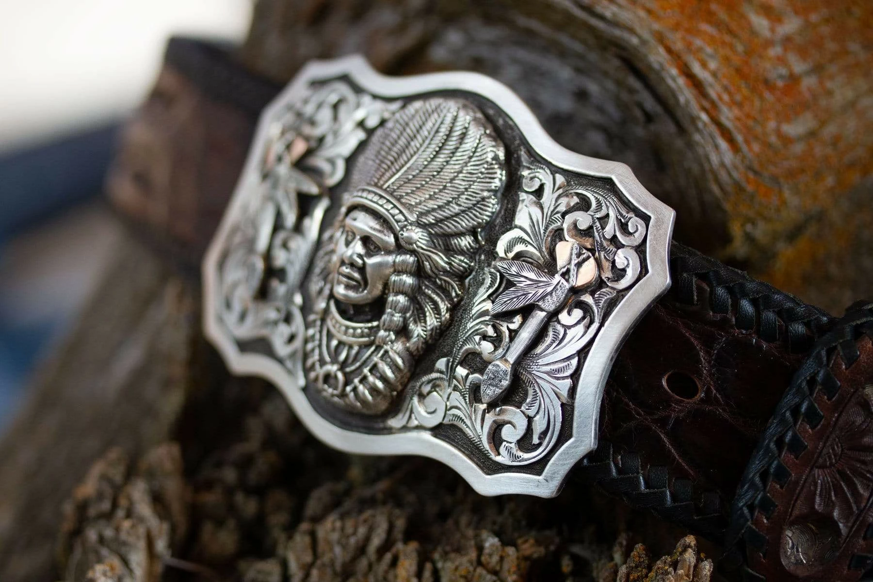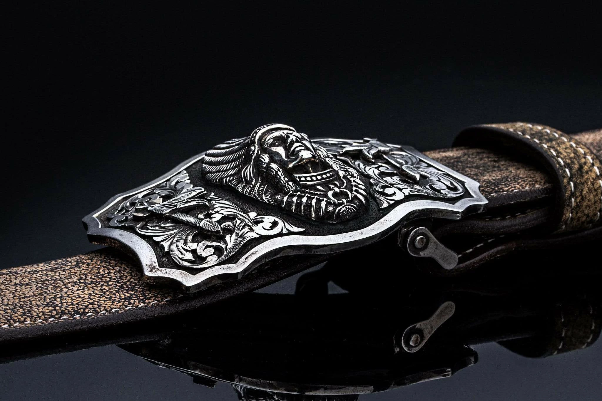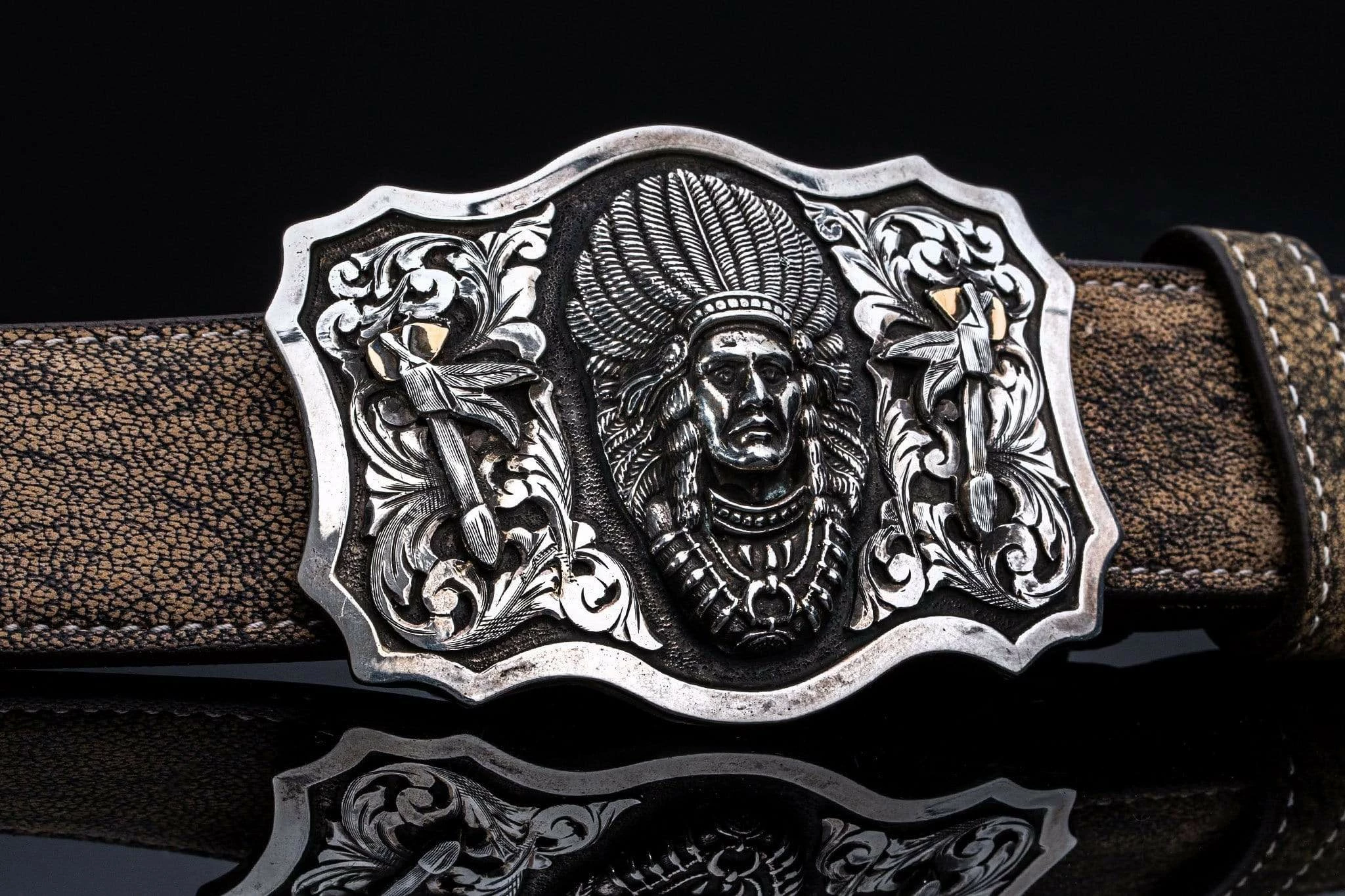 - 1.5-inch hand engraved buckle with hand-cut sterling silver overlay scrolls and finished with 14k rose gold Heraldic Shield and crowns