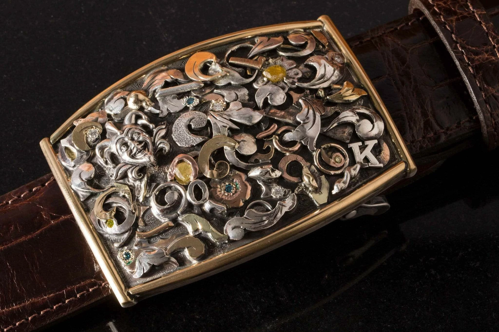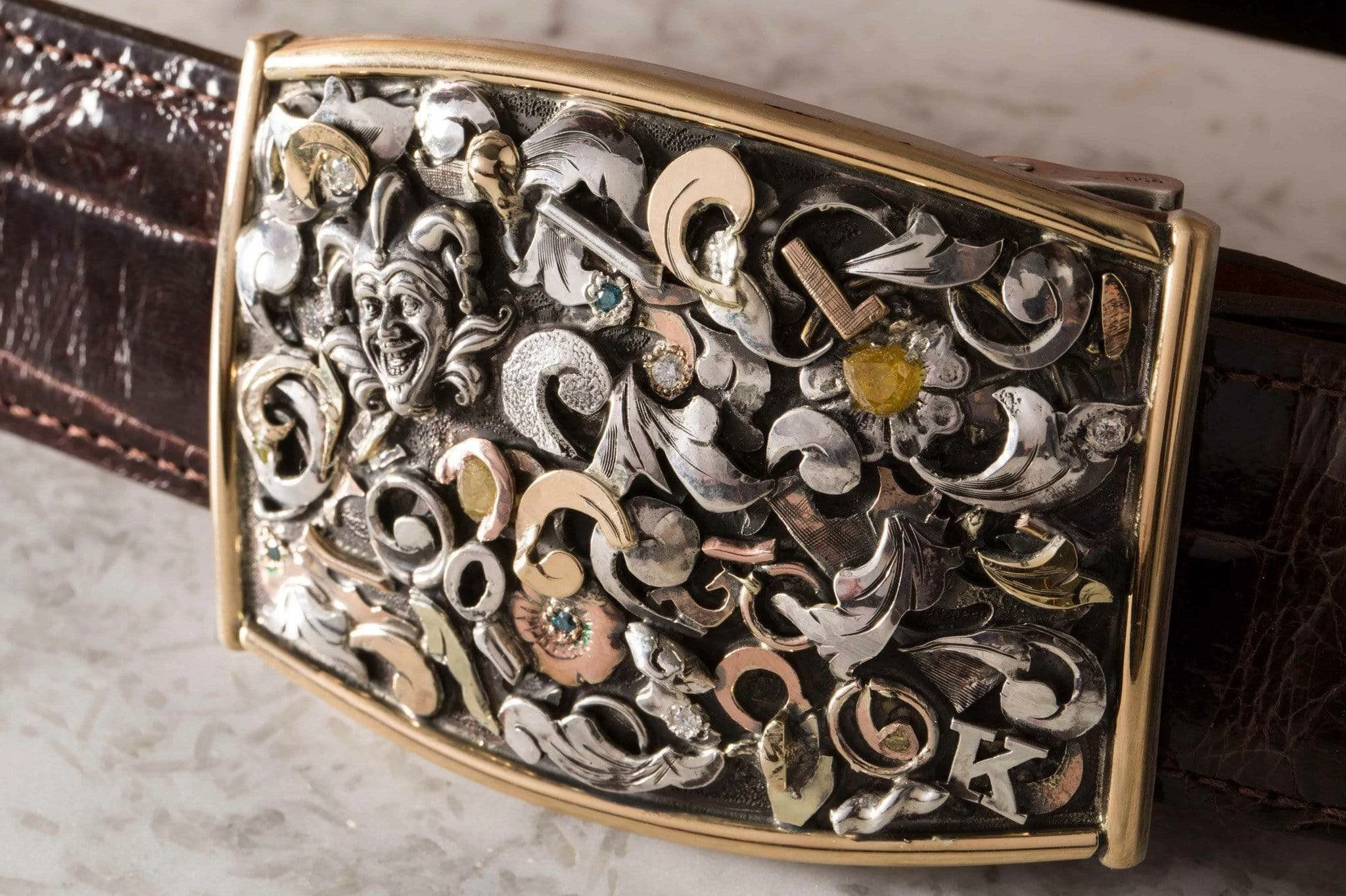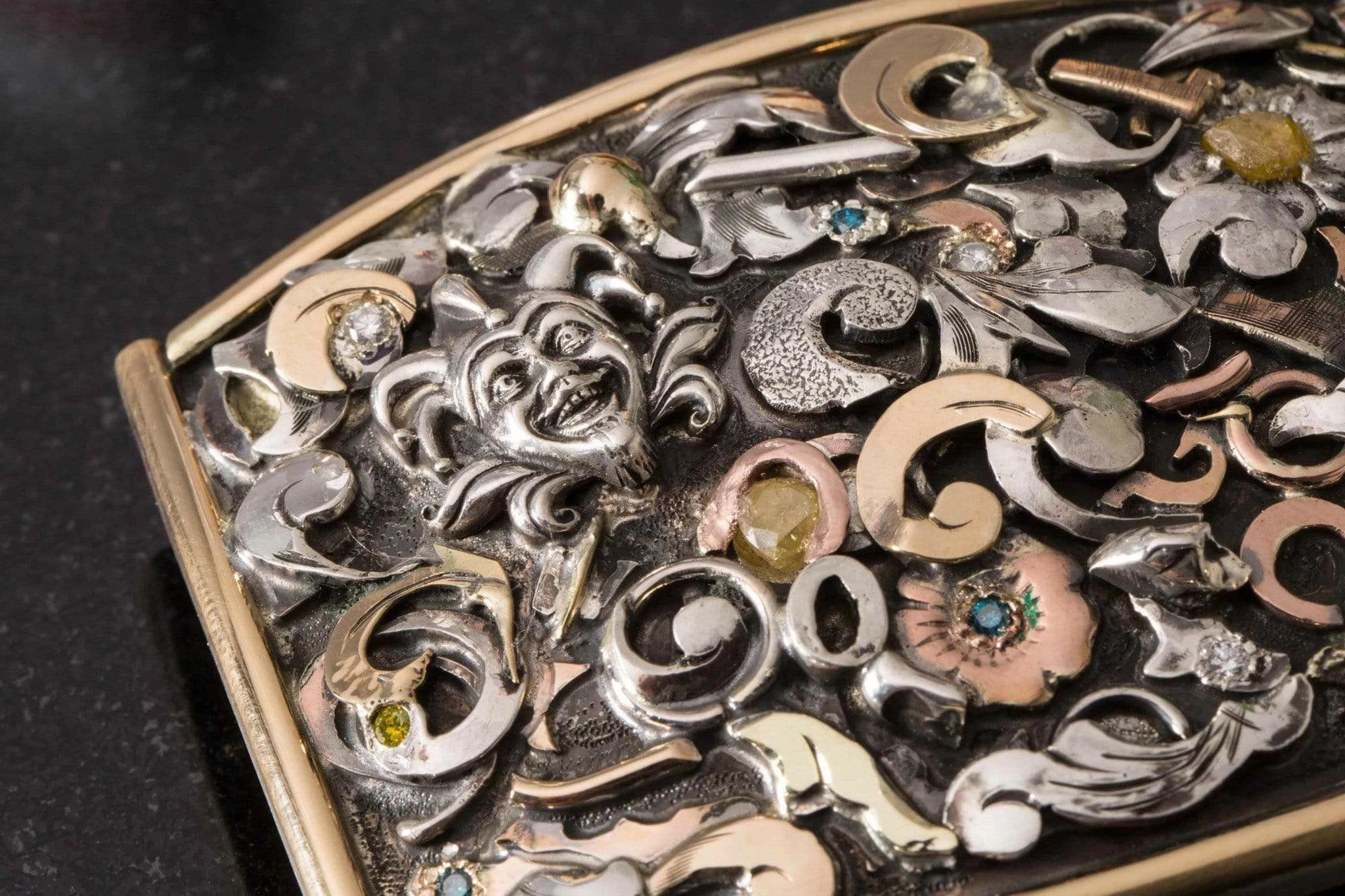 The “Scrap Buckles” were some of James Stegman’s first truly experimental pieces, and he’s returned to the theme once again after several years. For him, the building process is as fun and freeing as the end result itself. The buckle’s face features an energetic medley of fragments: yellow and rose gold, sterling silver, & yellow and blue diamonds chief among them. James also adorned the back of the buckle with a dark jester motif—hence the buckle’s secondary name, Retreat of the Dark Fool—representing a departure from his recent exploration of some serious, occasionally melancholic themes and a return to his early creative roots in optimism and generative energy.