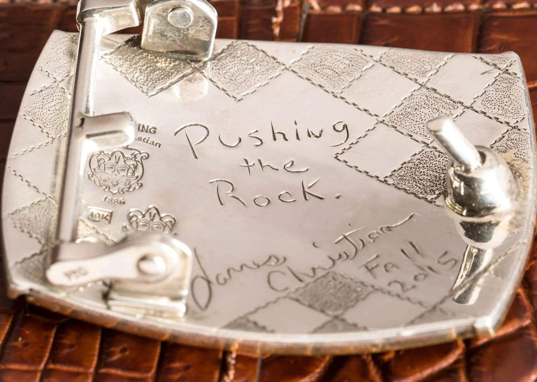 Handmade sterling silver with 18k round wire edge, interrupted by hope. The top half of the buckle is textured silver, the bottom half is textured 18k gold, as a representation of the “half full” motto of James Christian. The running wire is round platinum, adorned with a diamond progression starting with an unfinished precious stone and ending in two white polished diamonds. A portion of the proceeds from this sale will be donated to the semicolon project, a project designed to recognize the struggle of those with depression and suicide and addiction, people who have chosen to continue their story.