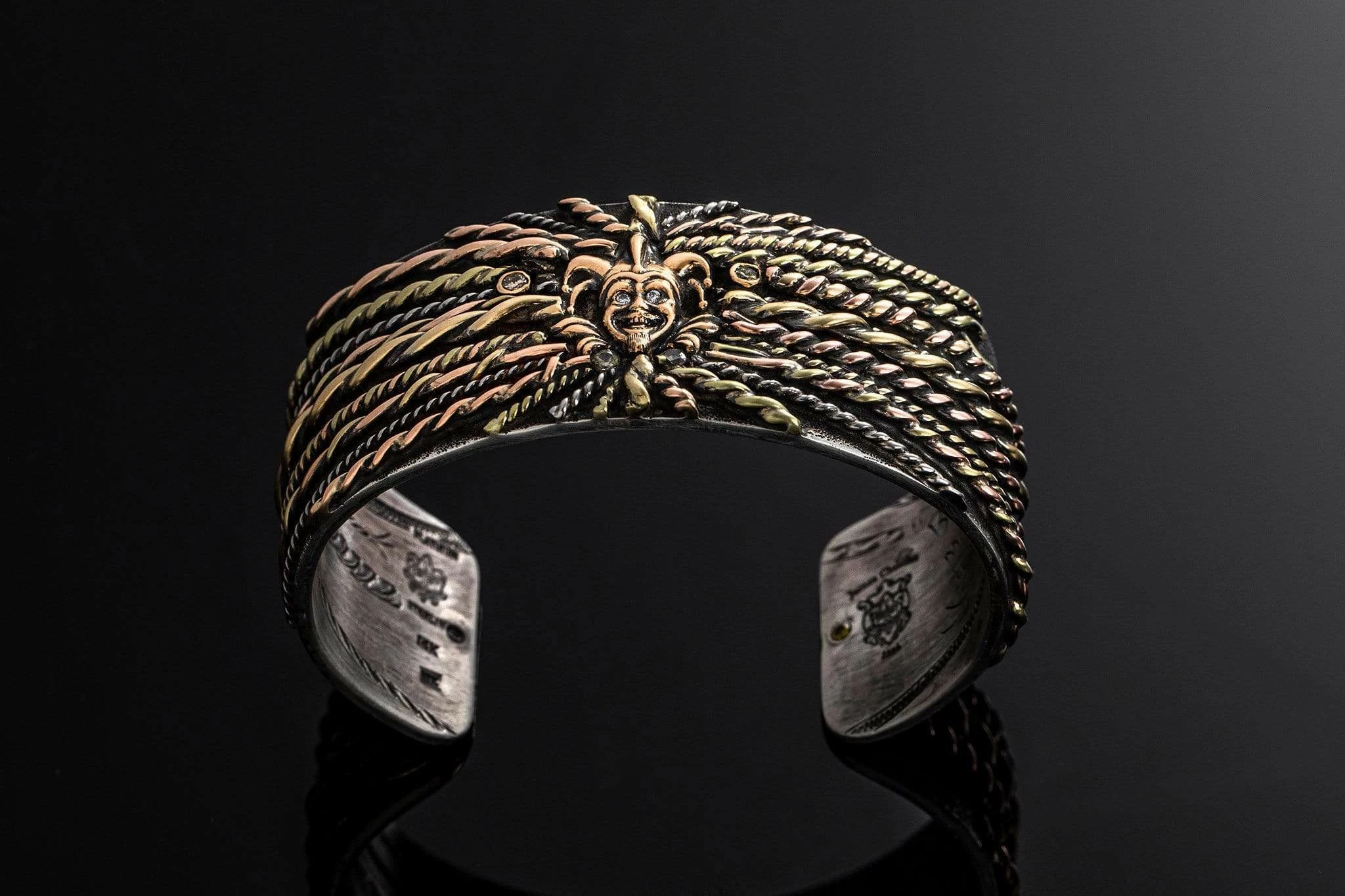 The base is sterling silver, the Jester is 18k gold, the wires are a mixture of platinum and 18k yellow, rose, and green golds, finished with (6) excellent quality natural diamonds.