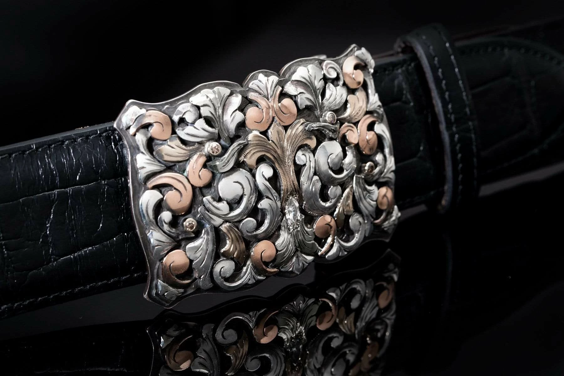 - Sterling silver handmade medium size trophy style buckle with a scalloped edge. Hand cut sterling silver scroll overlays are then overlaid with hand cut 14k red, yellow, and green three dimensional scrolls with 4 small diamond and one larger center diamond.