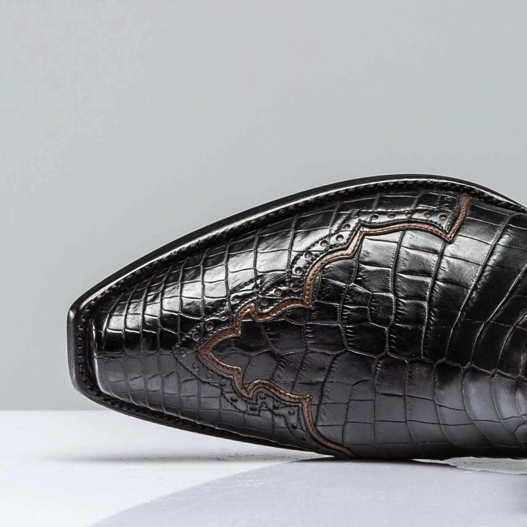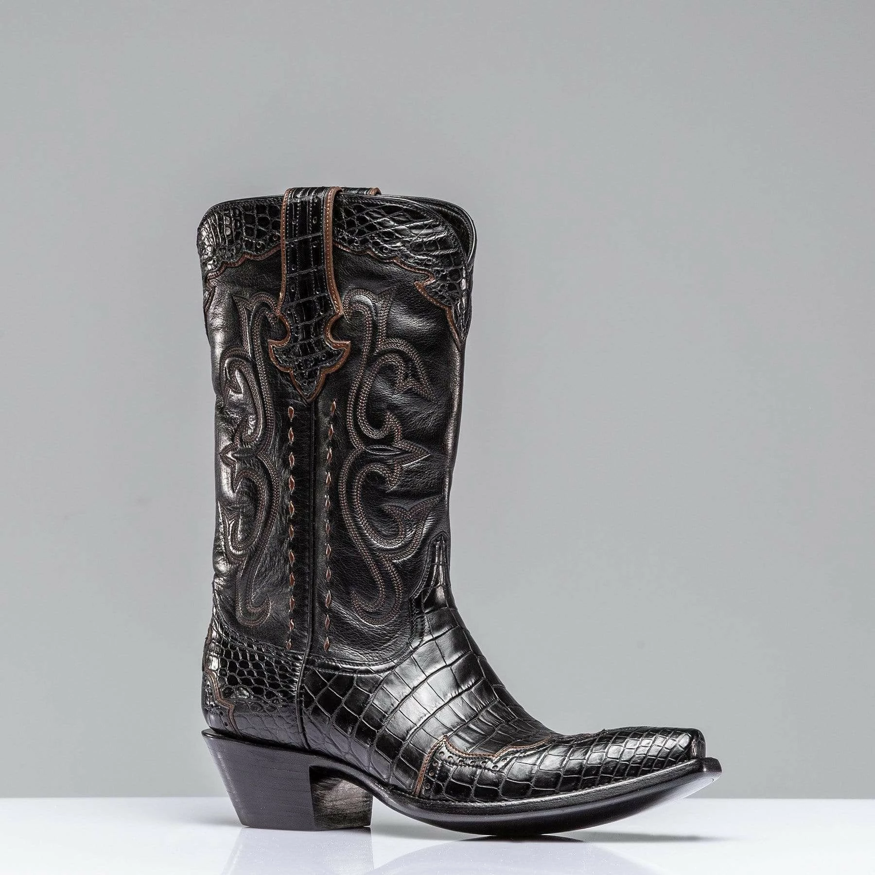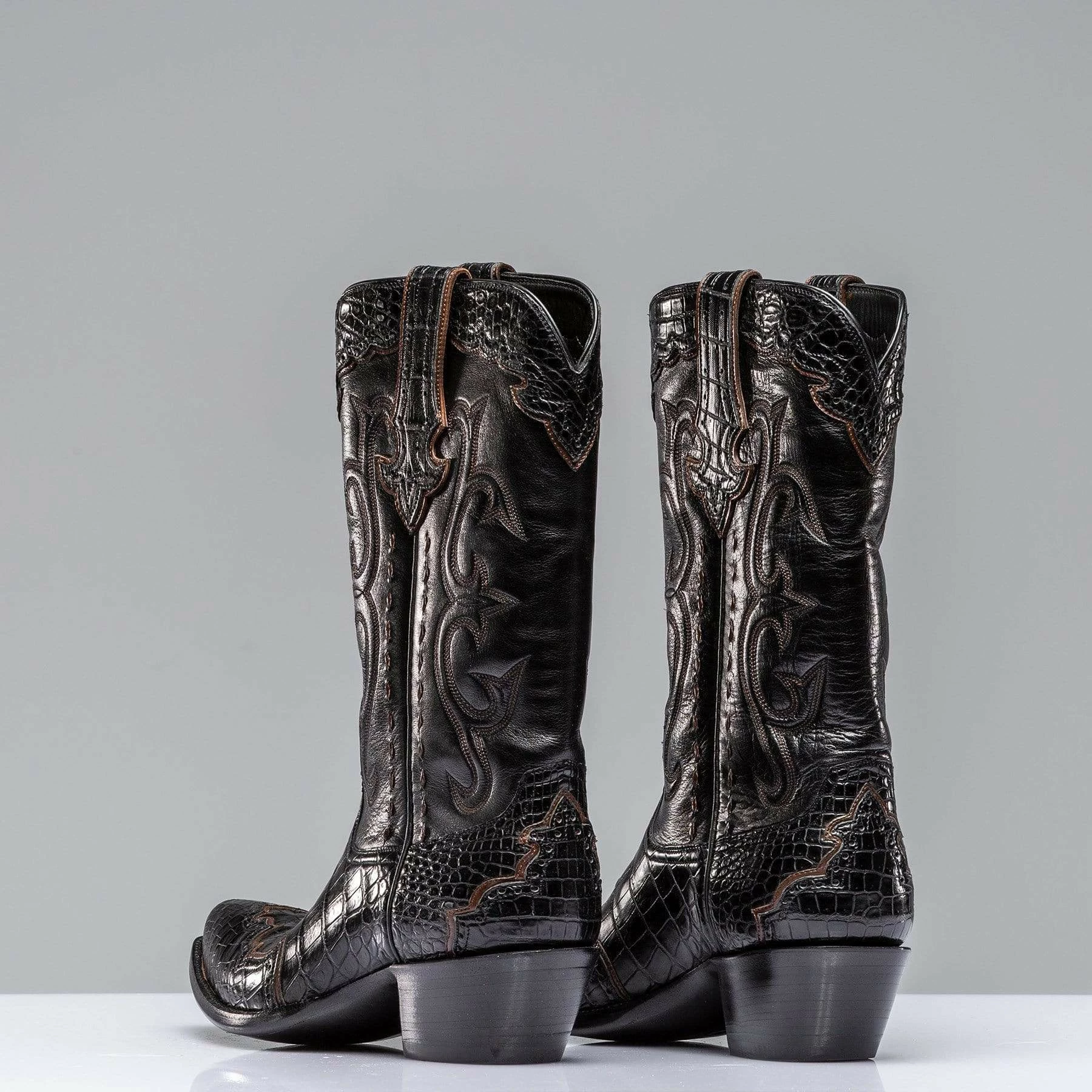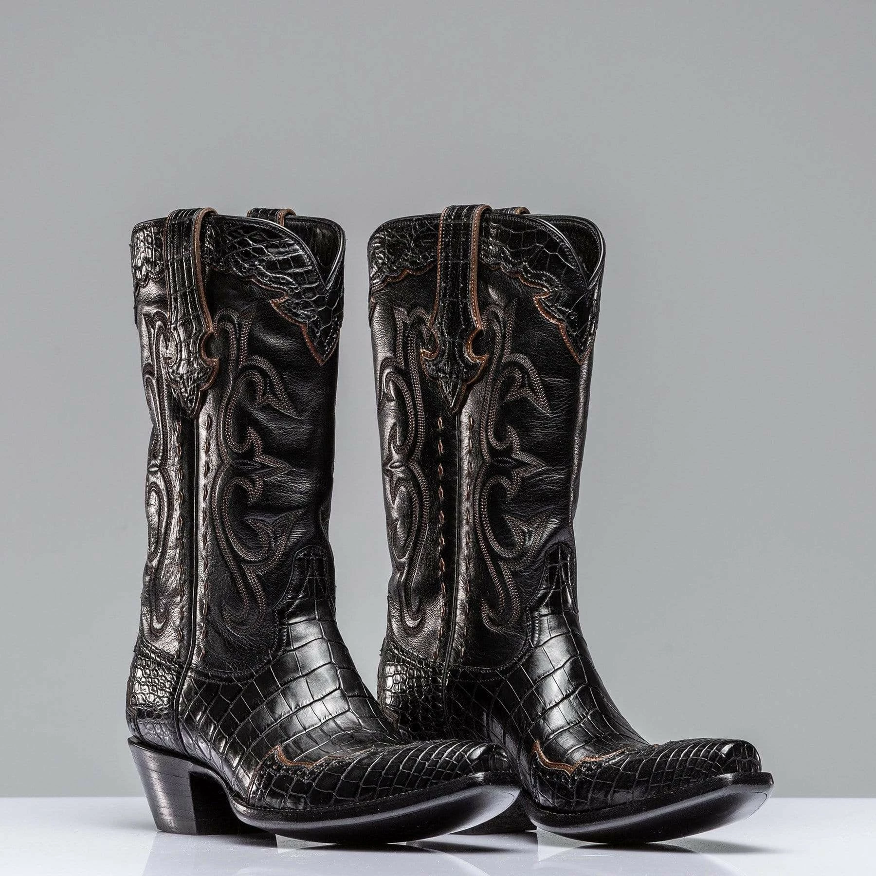 Nile crocodile with vintage buffalo shaft. The boot design is what we call “Majestic,” typified by a scalloped wingtip and heel counter with double-layer crocodile leather for durability (and a little visual impact). Scalloped collar and pulls also finished with the same. Hand-done stitch pattern and buck lacing along side seams. Each pair is handmade by artisans from Stallion Boot Company of El Paso, Texas with 30 or more years of experience.