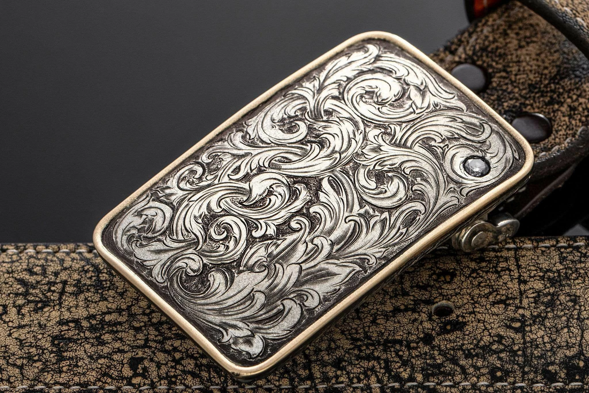 - Named for a notable U.S. Treasury engraver, this sterling silver buckle is completely hand-engraved in a note style, finished with a 1/2 tcw. gray diamond and 14k gold round wire edge.